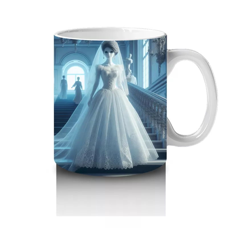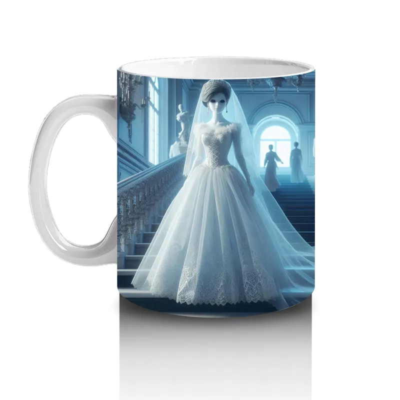 Beyaz elbiseli hayalet gelin figürlü sisli Cadılar Bayramı baskılı kupa, gizemli ve etkileyici detaylarıyla özel bir hediye alternatifi sunar.