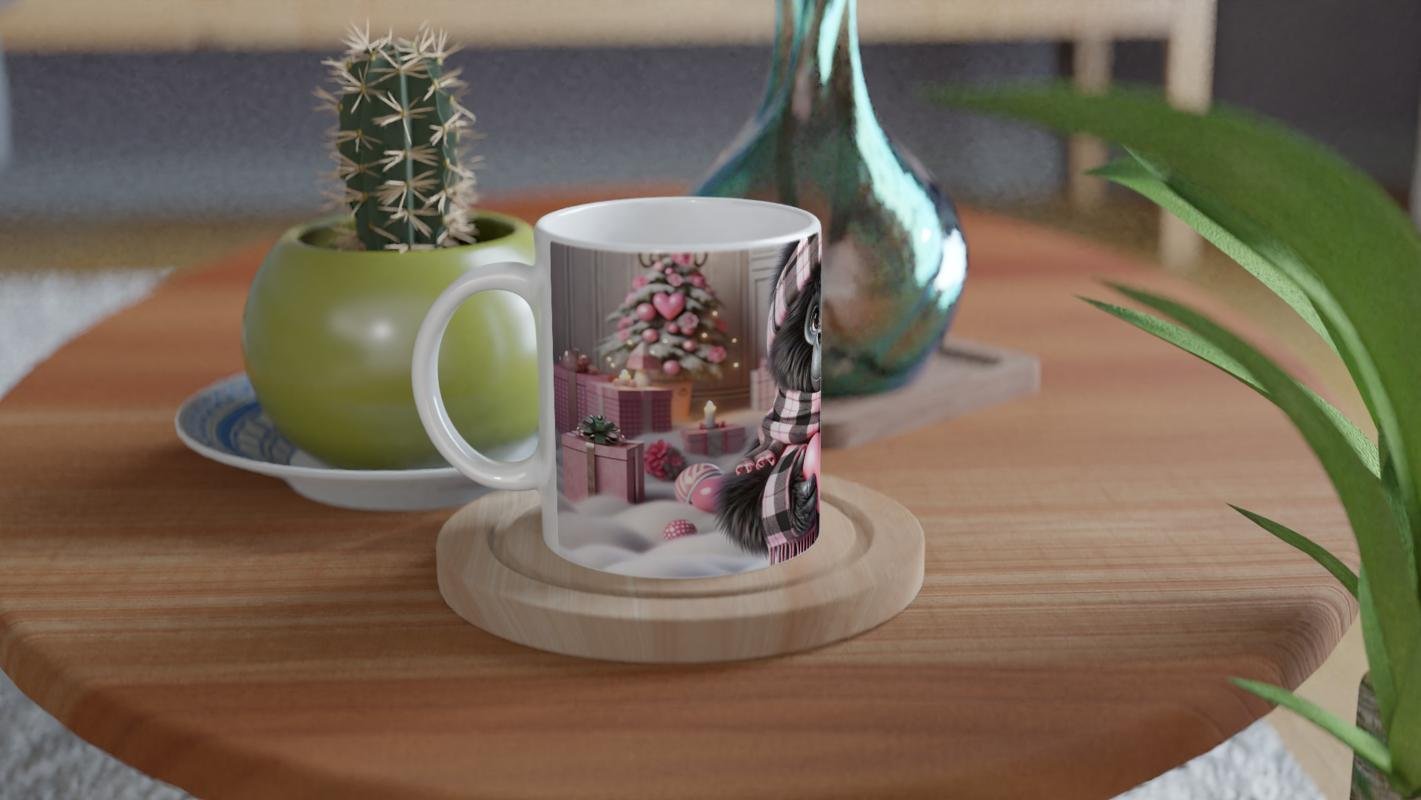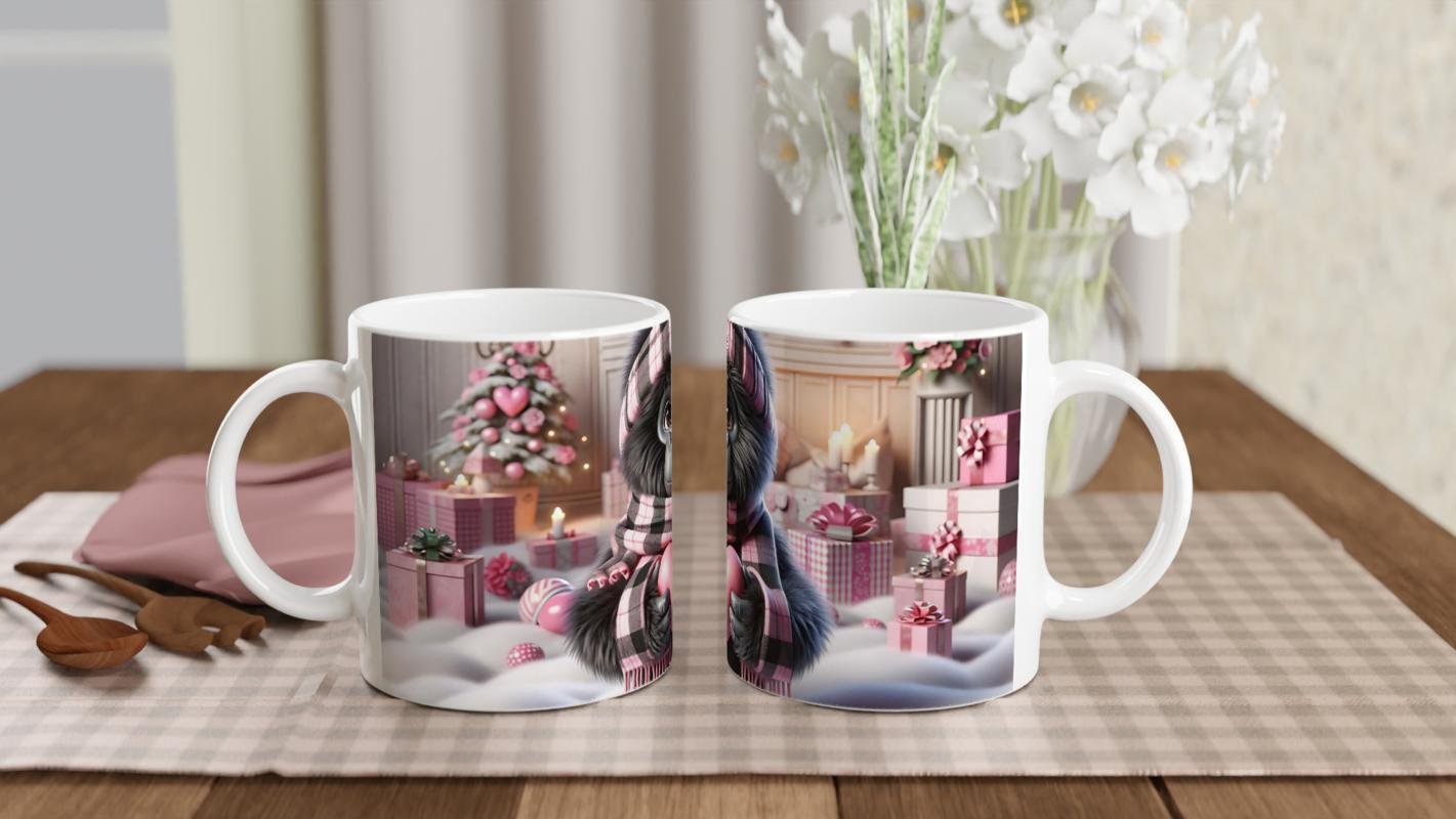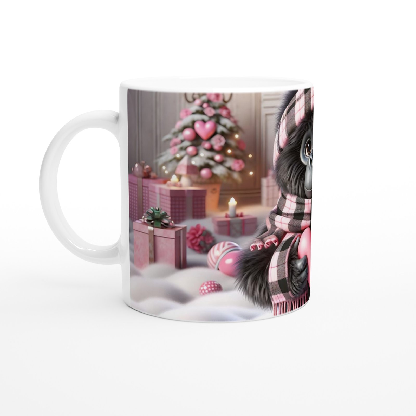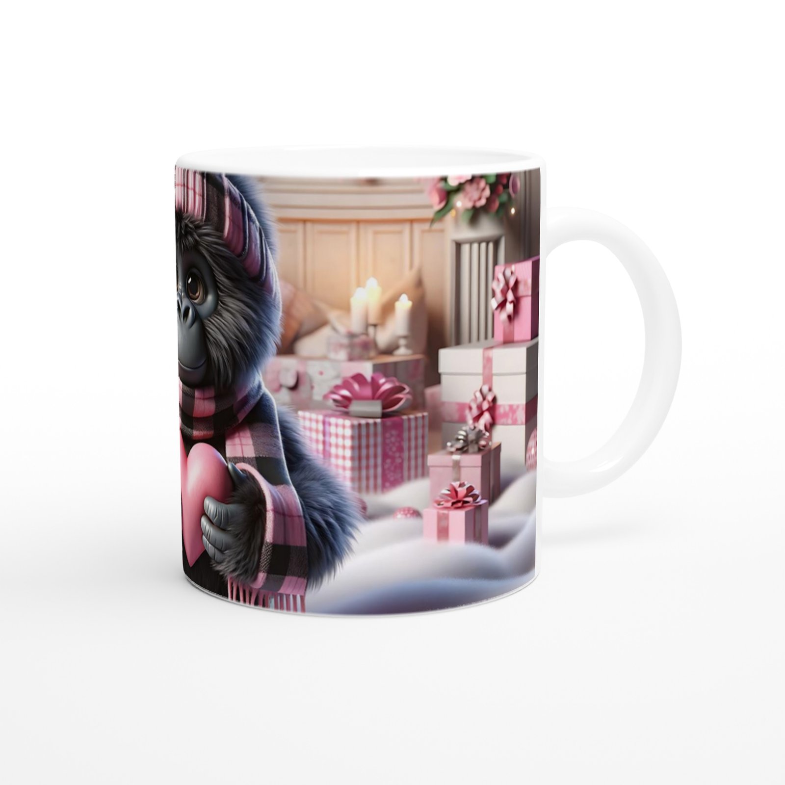 Sevgili Hediye Paketi Temalı Sevimli Goril Baskılı Kupa Bardak, pembe süslemeler, hediye kutuları ve yumuşak kar efektleriyle yılbaşı ve sevgililer günü gibi özel zamanlar için ideal bir seçim. Pembe-beyaz uyumu ve gorilin samimi gülümsemesiyle herkesi mutlu edecek bir tasarım sunar.