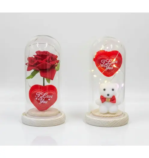 Sevginizi ikiye katlayın! Kırmızı gülün asaleti ve sevimli ayıcığın sıcaklığını birleştiren bu ikili ışıklı cam fanus seti, en özel anlarınız için masalsı bir dekor sunuyor.