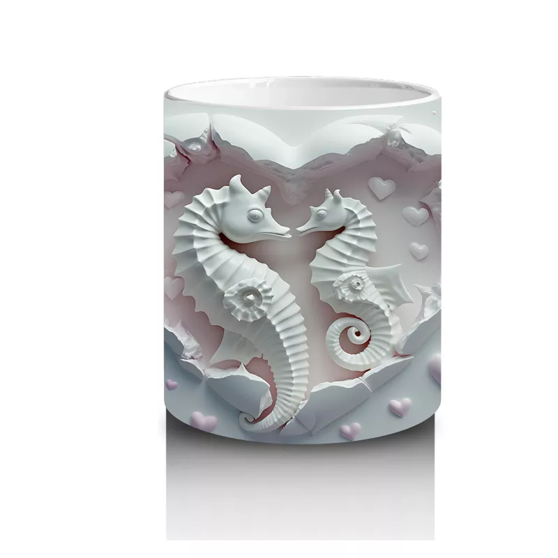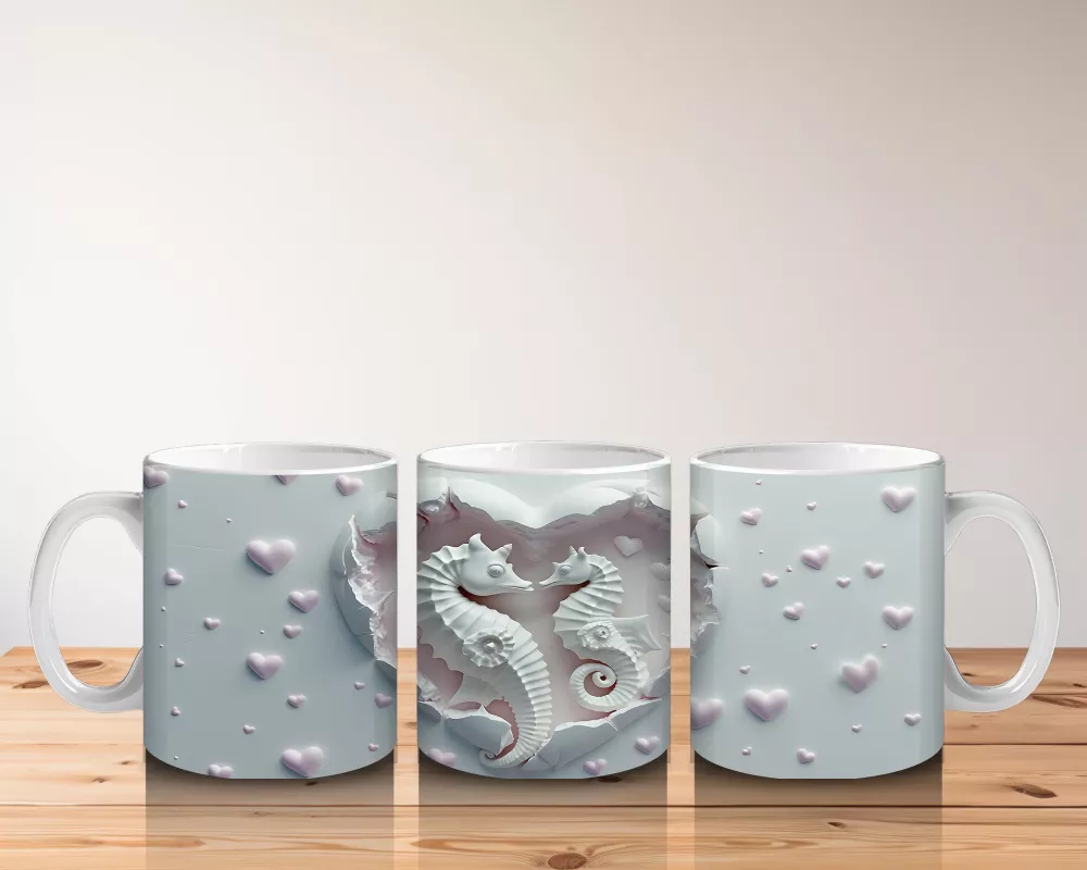 Kalp Şeklindeki Oyukta İkili Denizatı Kabartma Deseni – Baskılı Kahve Kupası