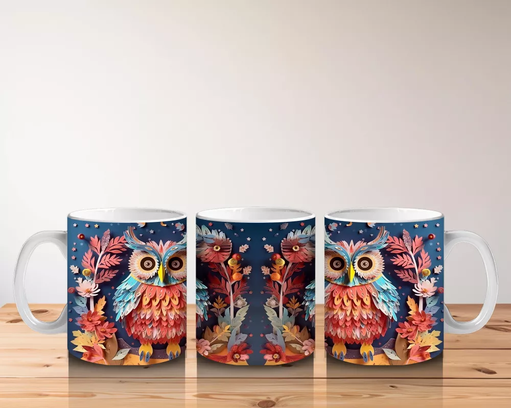 Renkli Çiçekler Arasında İkiz Baykuşlar – Baskılı Kahve Kupası