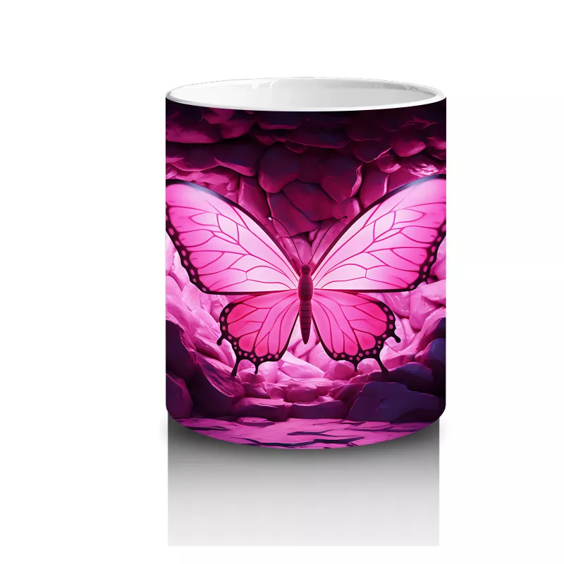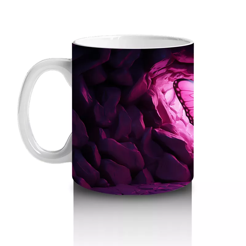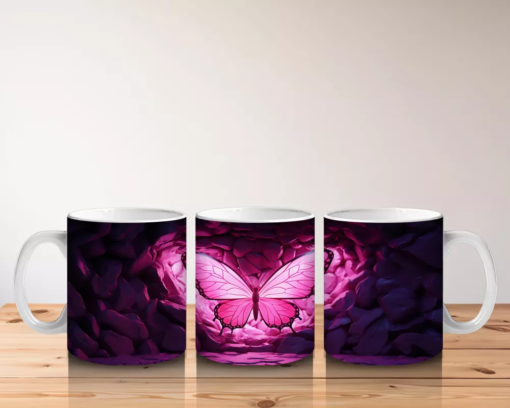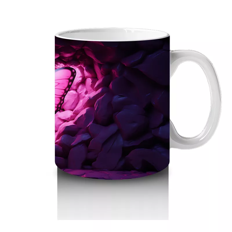 Mor Işıklarla Aydınlatılmış Kalpli Zeminde Kelebek – Baskılı Kahve Kupası