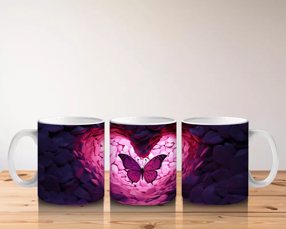 Kalp Şeklinde Işıltılı Taşlar Arasında Kelebek – Baskılı Kahve Kupası