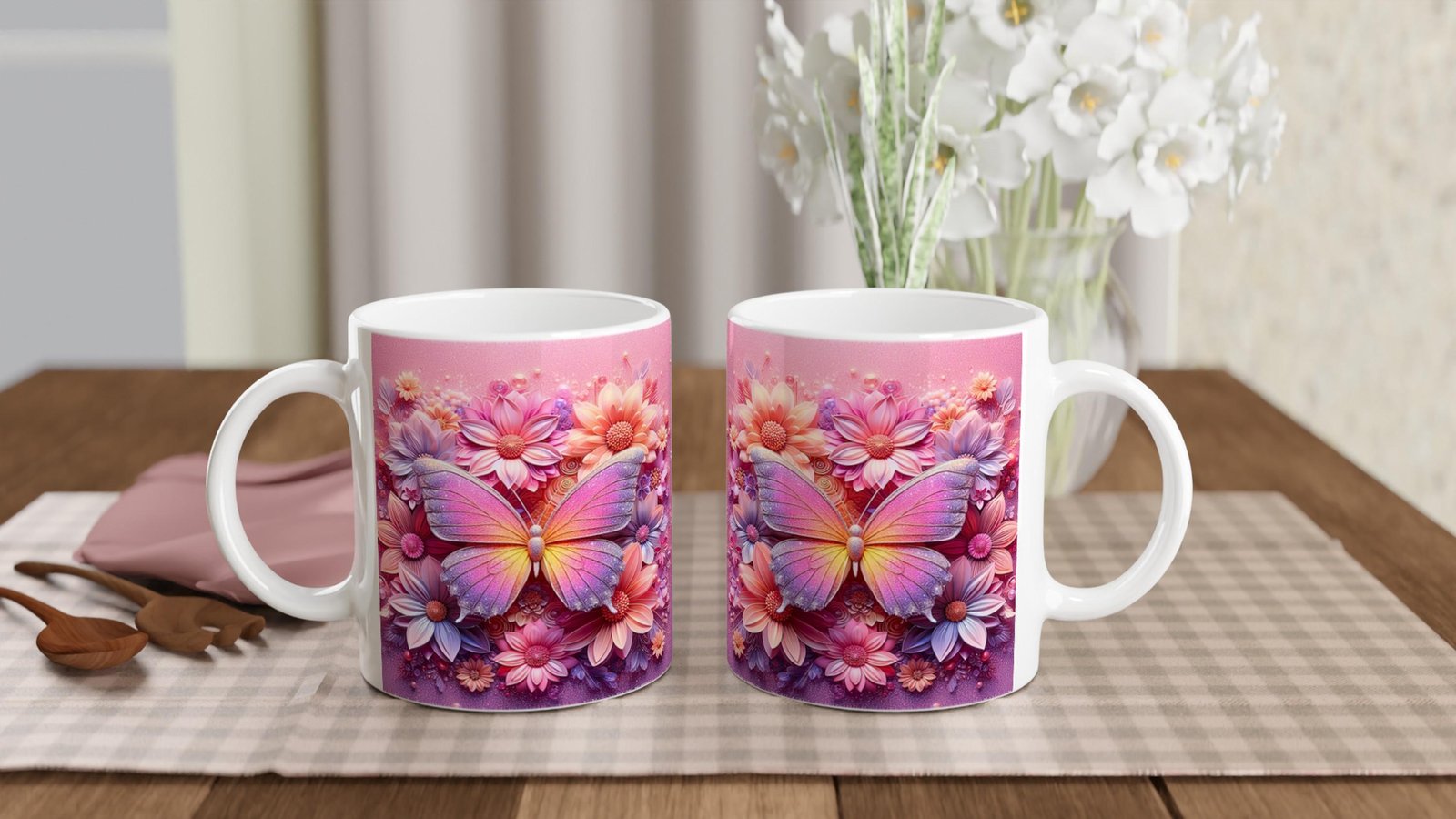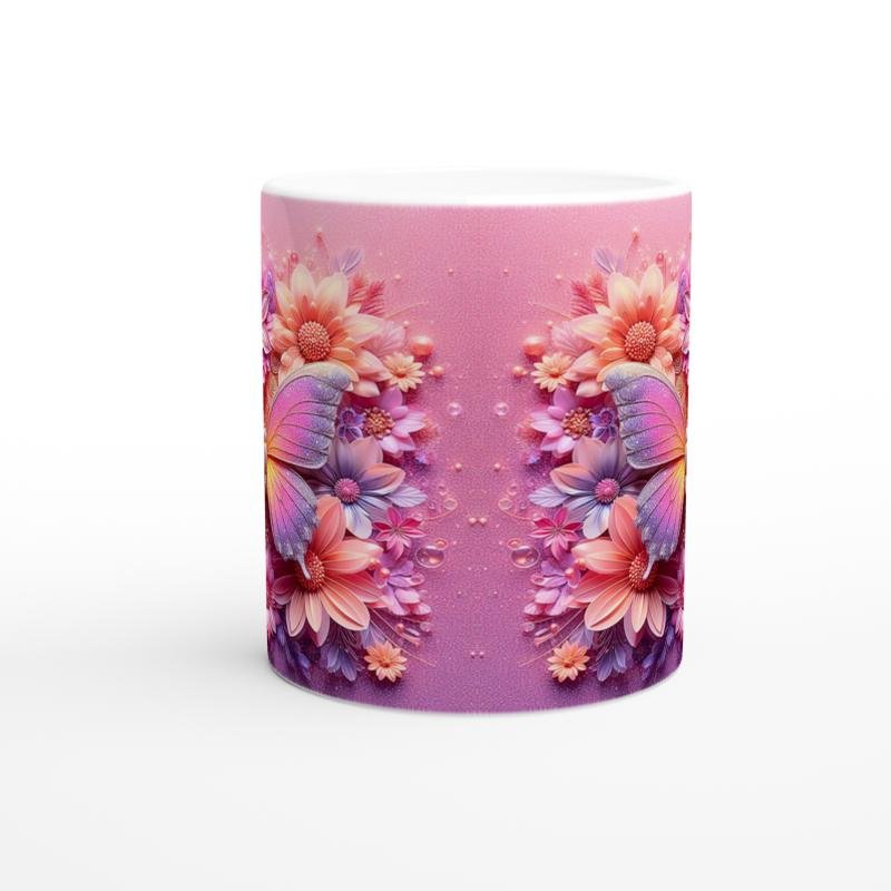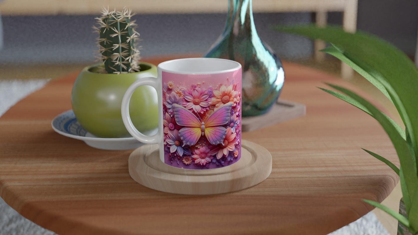 Kelebek baskılı kupa, pastel tonlardaki çiçeklerle çevrili zarif kanatlarıyla baharın tazeliğini ve zarafetini yansıtıyor.