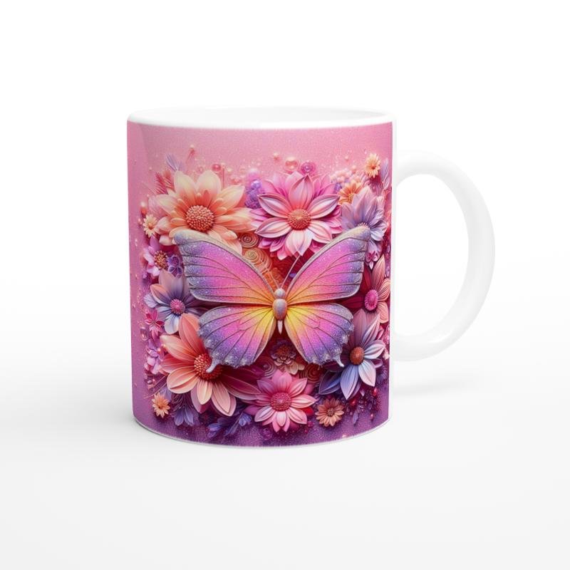 Işıltılı Çiçekler Arasında Renkli Kelebek Temalı Baskılı Kupa Bardak, ışıltılı pembe arka planı ve detaylı çiçek desenleriyle iç ısıtan bir atmosfer sunuyor. Doğanın büyüsünü yaşam alanına taşımak isteyenler için eşsiz bir tercih.