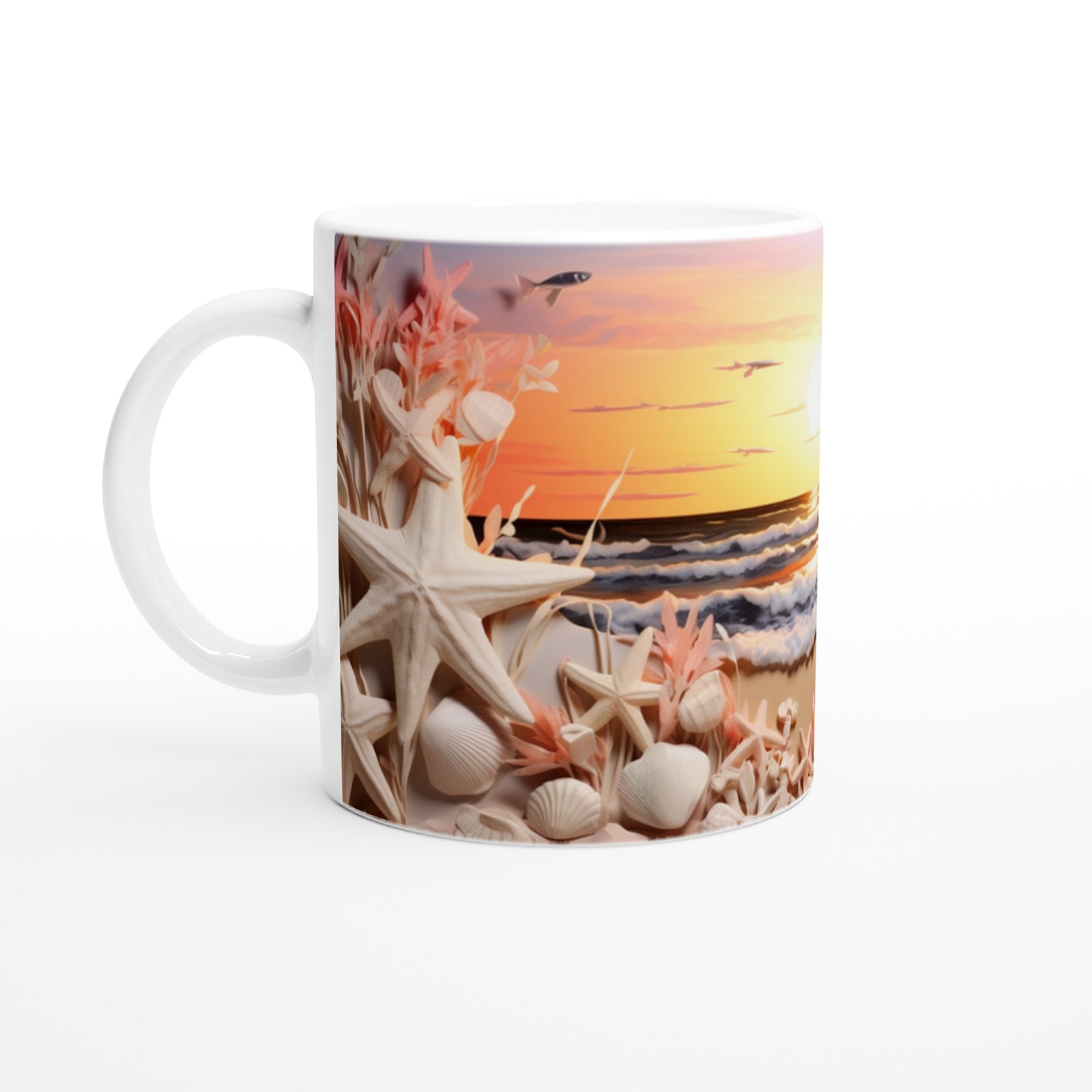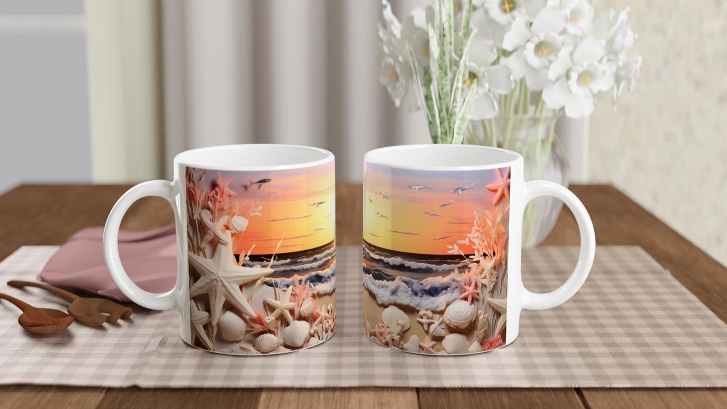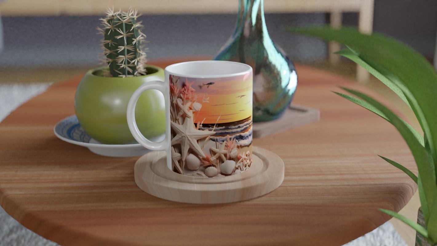 Gün batımının sıcak ışıkları altında parlayan yıldızlar ve kabuklarla tasarlanan bu su altı temalı kupa bardak, romantik bir sahil atmosferi sunuyor.