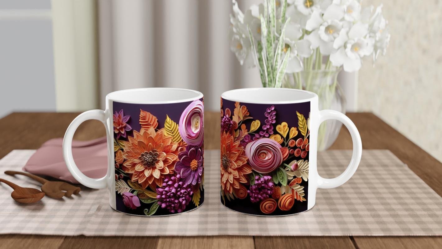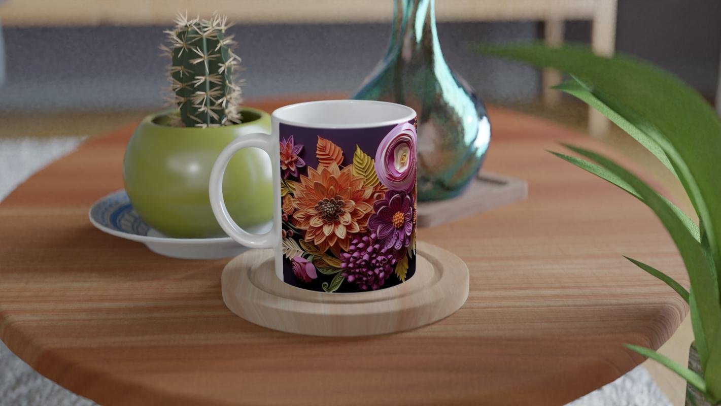 Kağıt Rölyef Stili Canlı Çiçek Desenli Kupa Bardak, turuncu, mor ve pembe tonların canlılığıyla dikkat çeken, kağıt katman efektiyle tasarlanmış özel bir modeldir. Hem estetik hem kullanışlı olan bu bardak, kahve ve çay keyfinize renkli bir dokunuş katar. Hediye etmek ya da koleksiyonunuza katmak için eşsiz bir seçimdir.