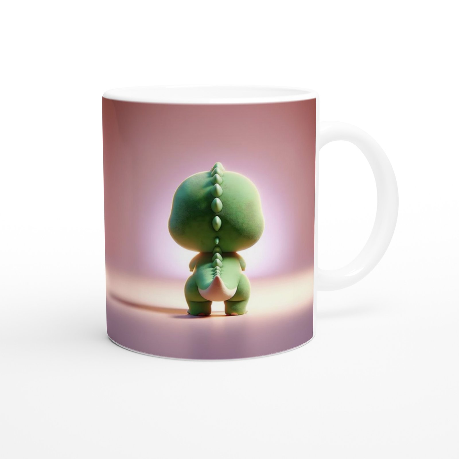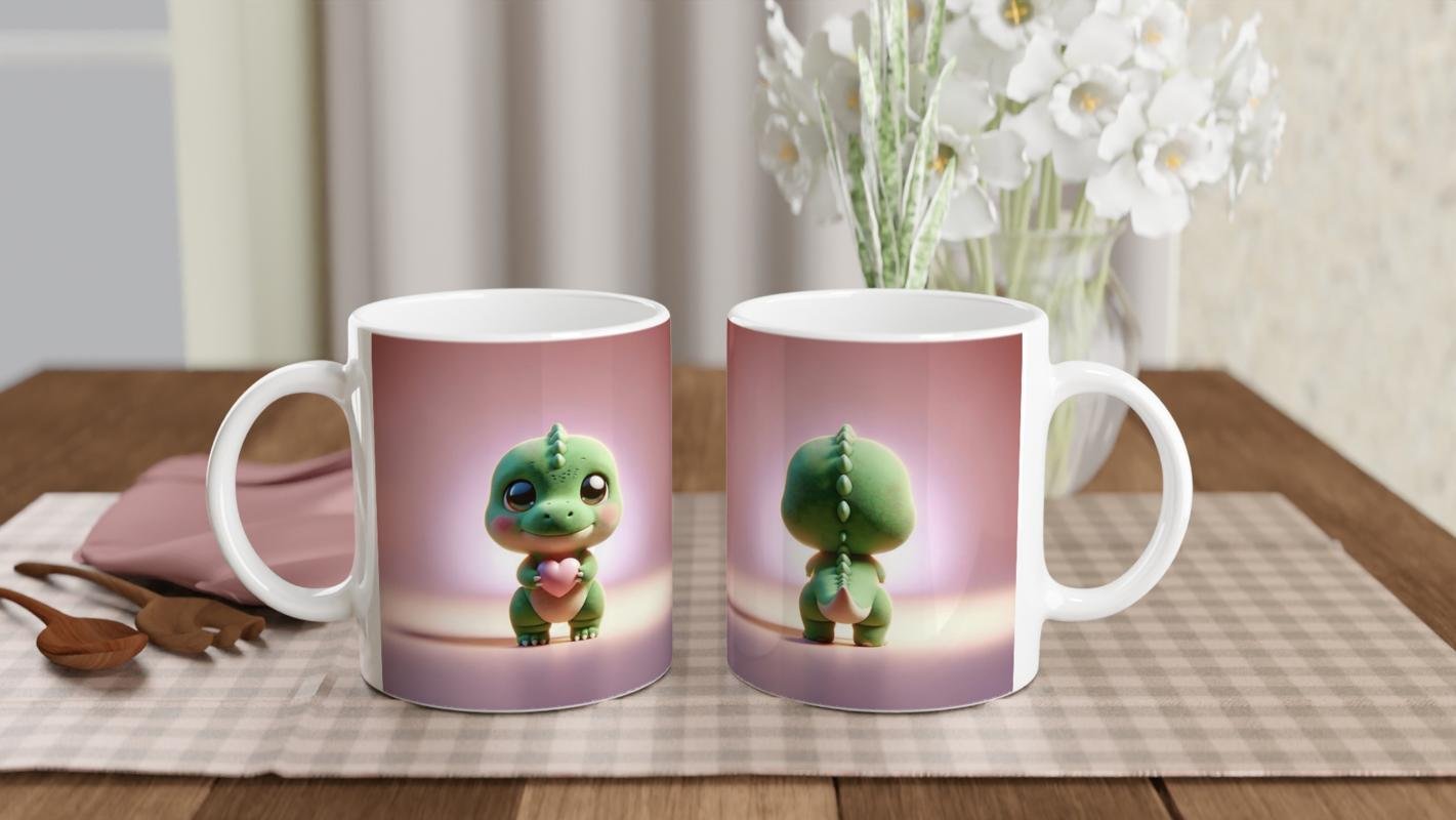 Dinozor baskılı kupa, kalp tutan tatlı ifadesiyle neşe ve sevgi dolu bir görünüm sunuyor.
