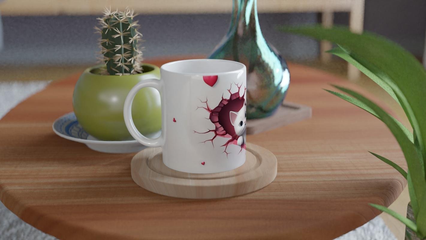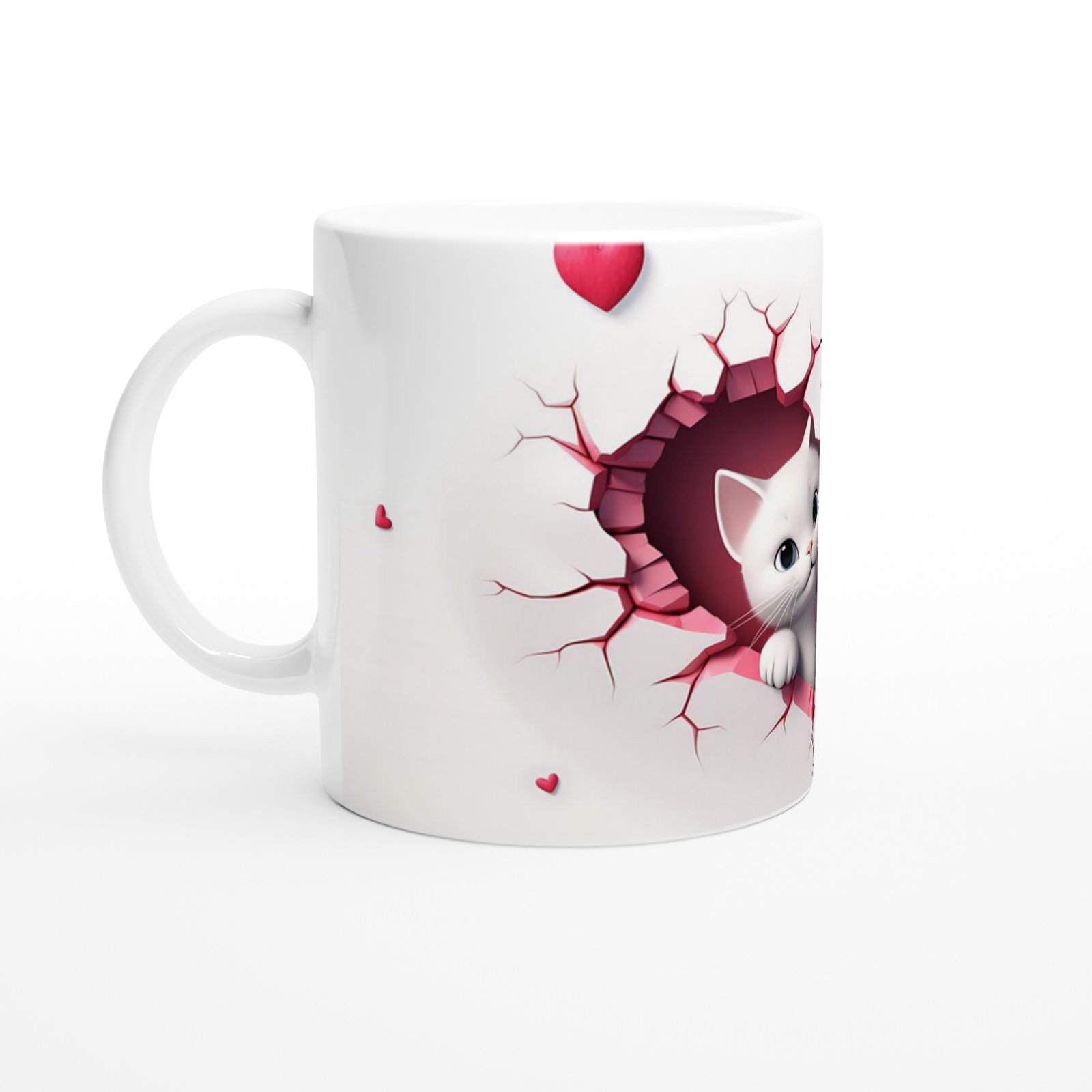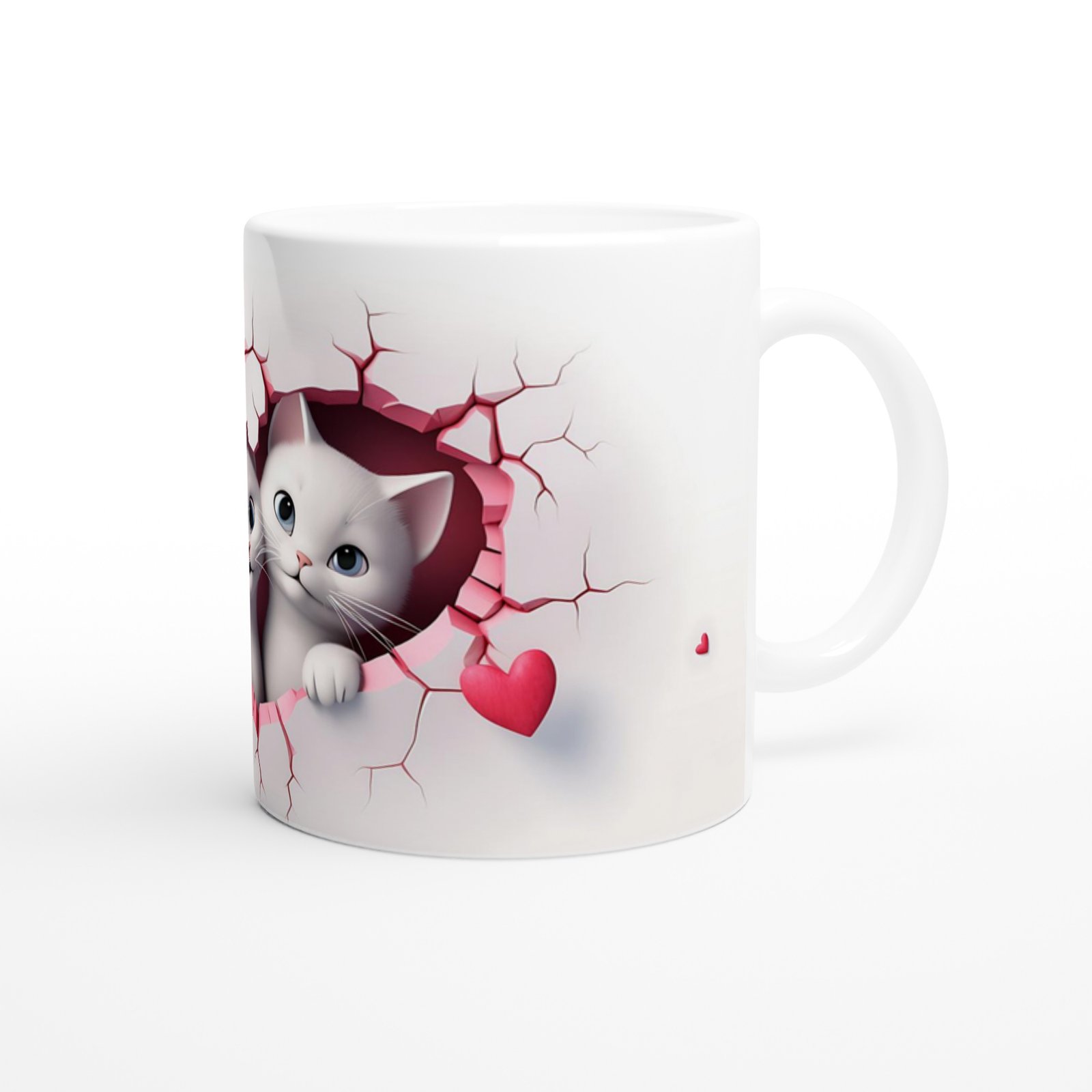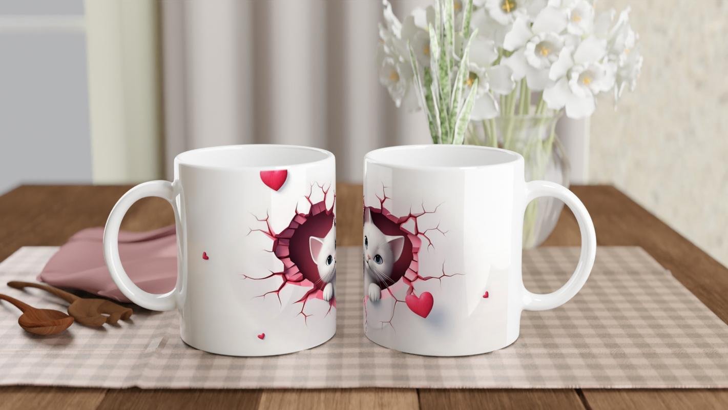 Kalp Şeklinde Çatlağın İçinden Bakan İkiz Kediler Temalı Baskılı Kupa Bardak, beyaz zemin üzerindeki pembe çatlaklarla kalp formunda şekillenmiş aralıktan sevimli ikiz kedilerin bakışıyla aşk dolu bir tasarım sunar. Gülümseten detaylarıyla hediye alternatifi olarak da öne çıkar.