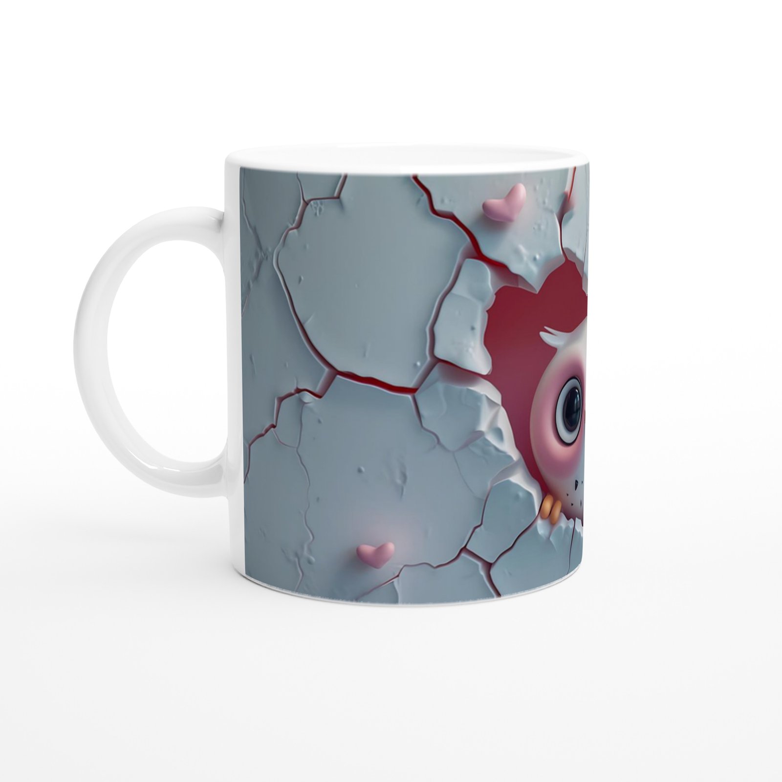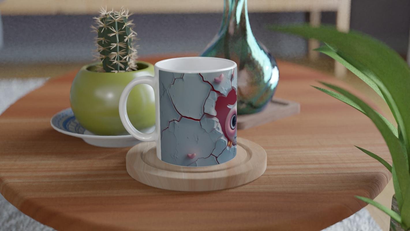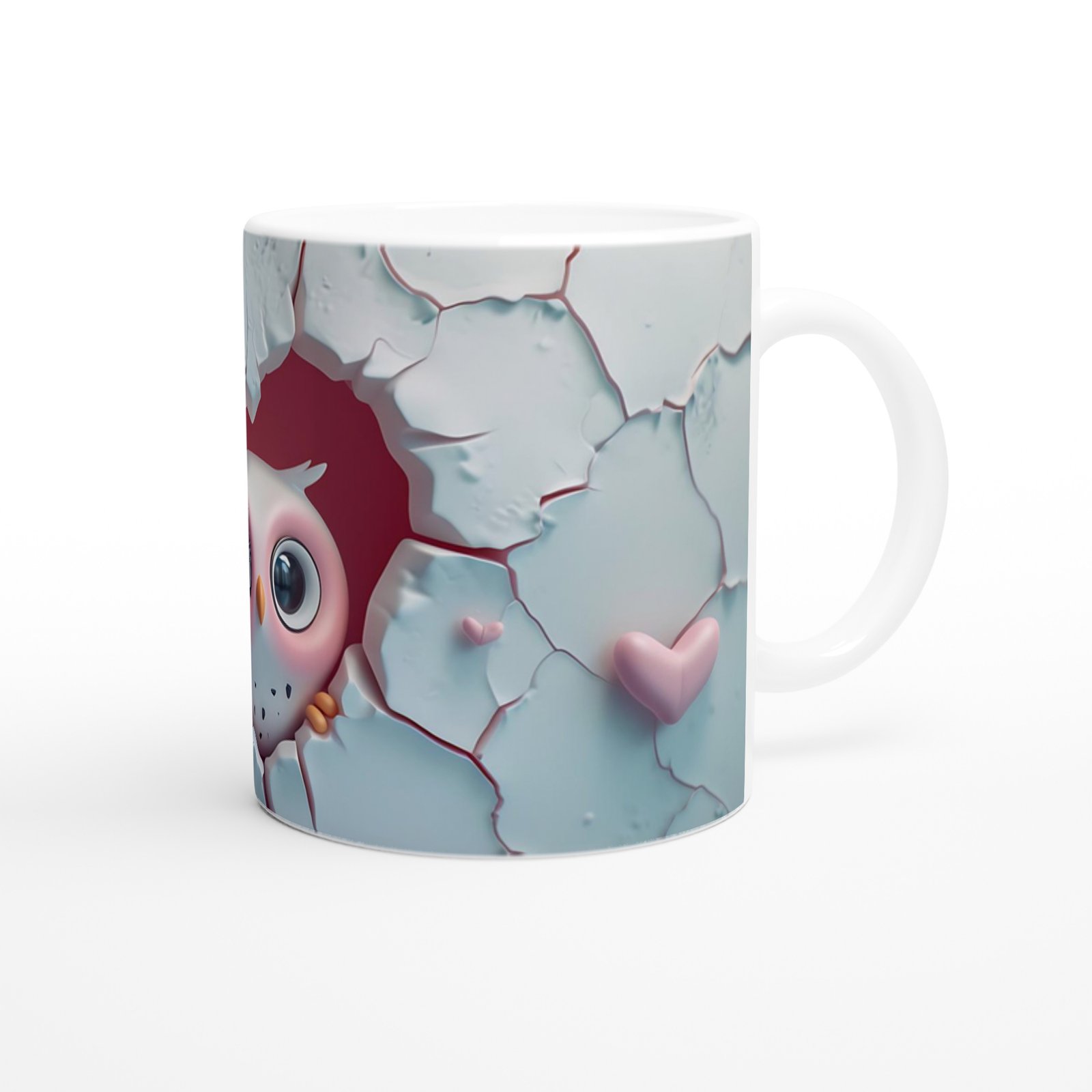 Kalpli Çatlağın Ardından Bakan Baykuş Temalı Baskılı Kupa Bardak, beyaz çatlak zemin üzerinde beliren kalp şeklindeki boşluk ve içinden bakan tatlı baykuş figürüyle hem romantik hem eğlenceli bir atmosfer sunar. Özellikle sevgi temalı hediyeler için ideal bir tasarım.