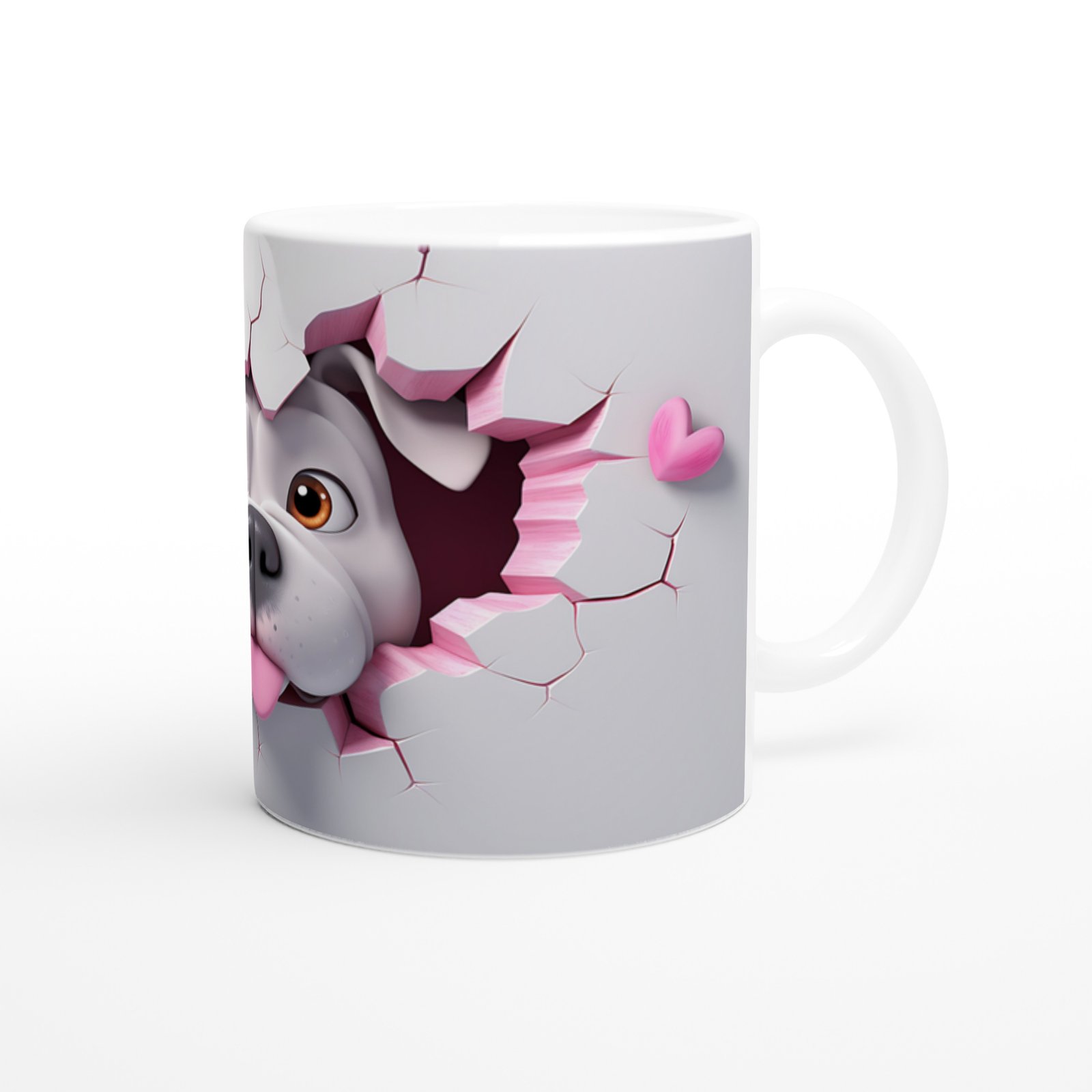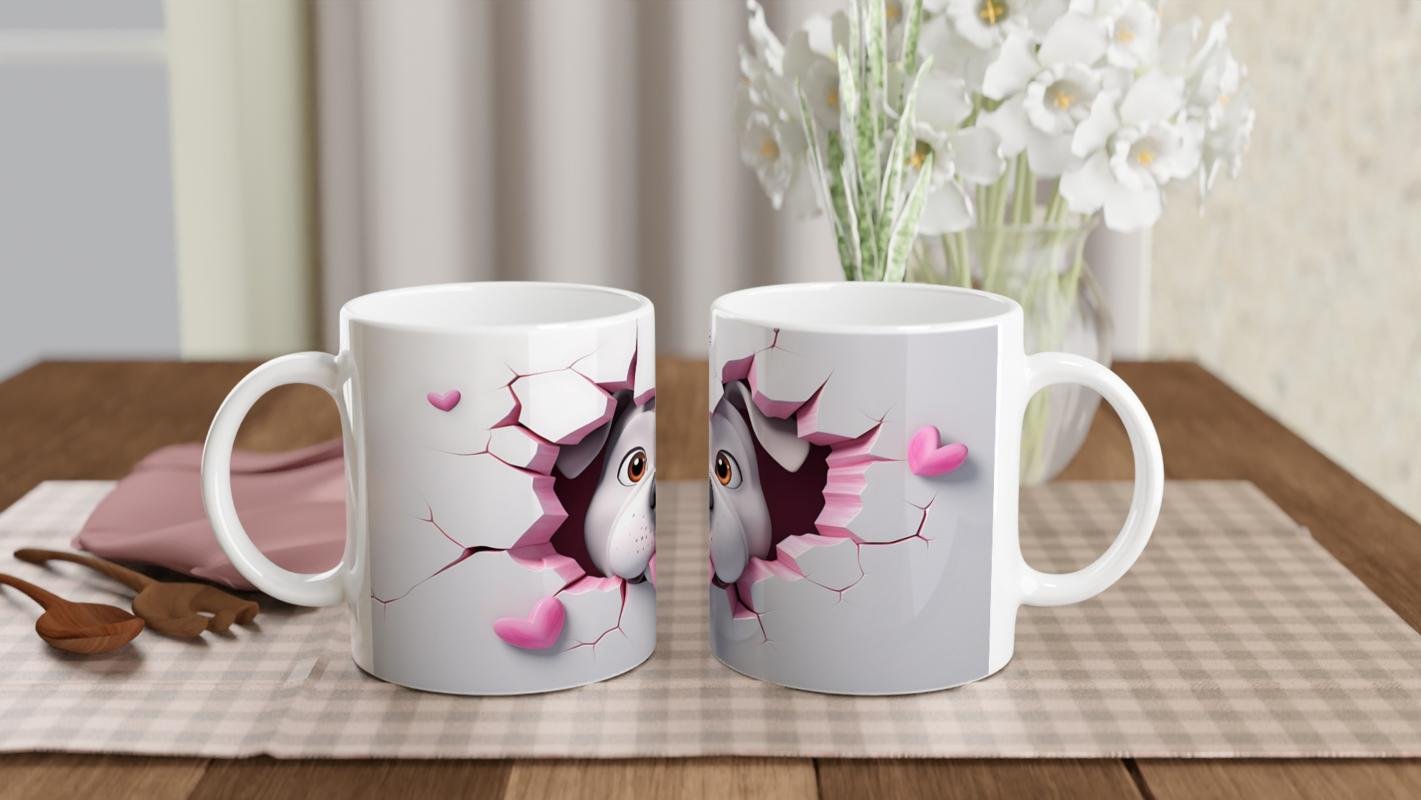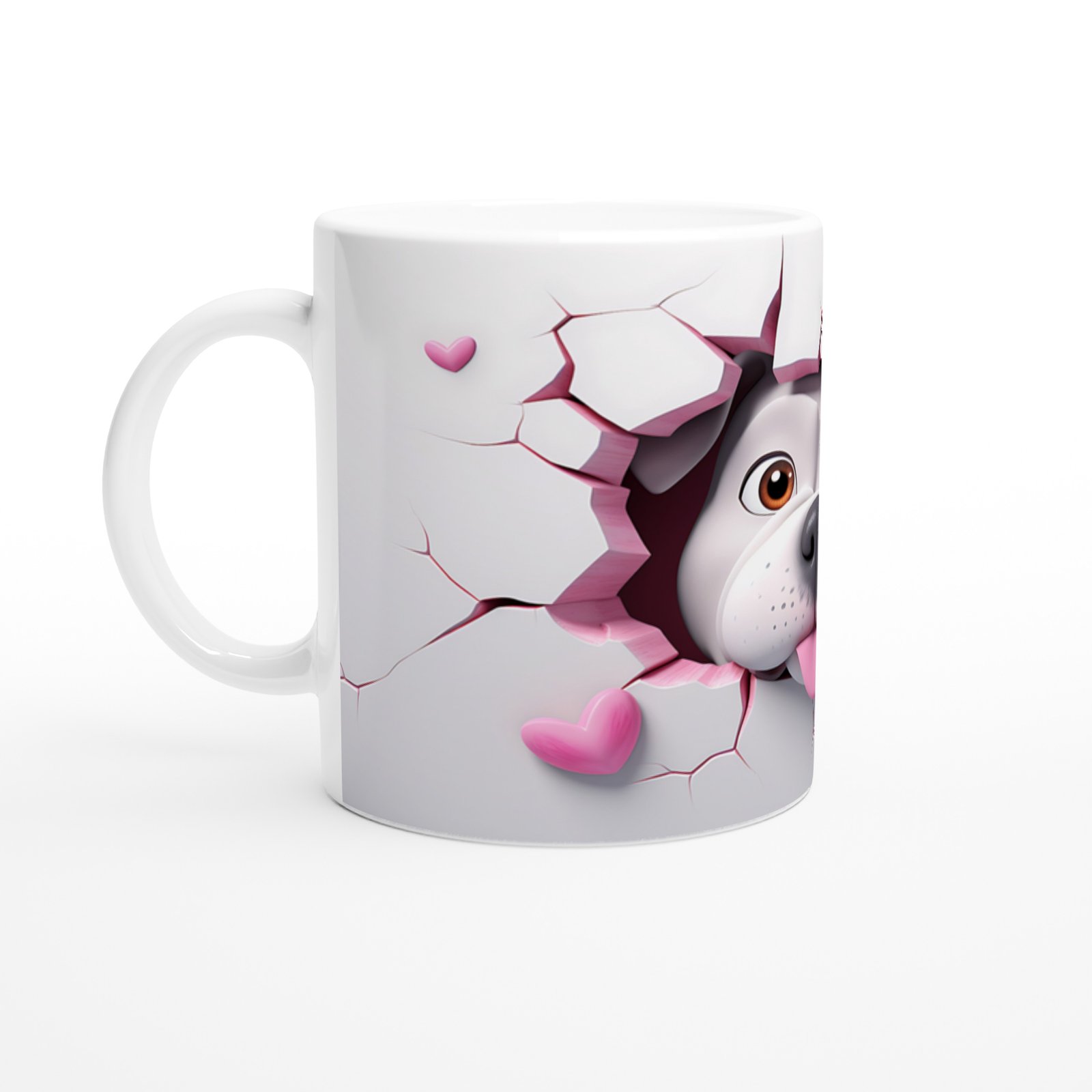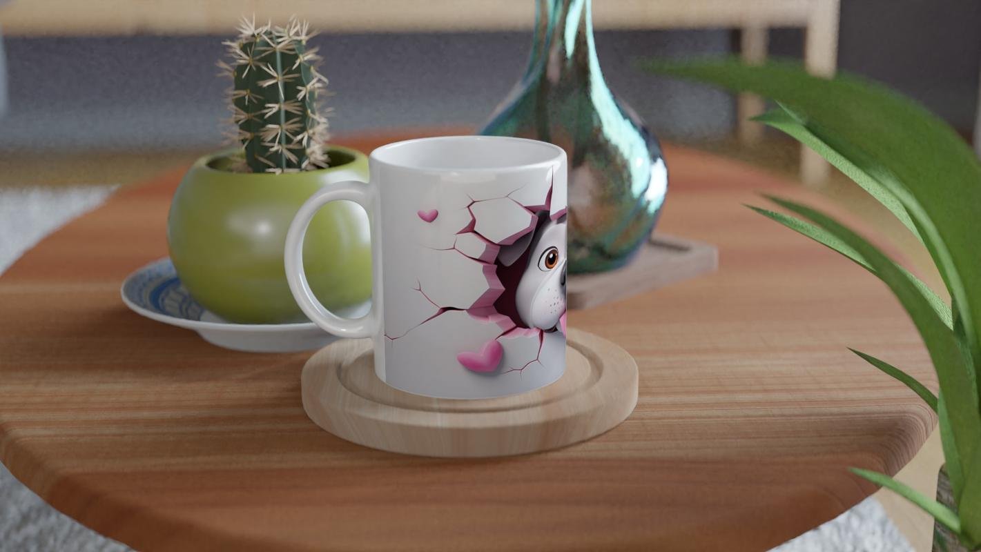 Kalpli Çatlak Arasından Bakan Bulldog Temalı Baskılı Kupa Bardak, neşeli dili dışarıda pozu ve pembe kalplerin sıcaklığıyla gününüze sevimli bir dokunuş katıyor. Köpek severler için özel olarak tasarlanmış bir kupa.