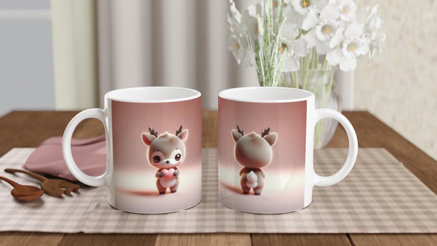 Kalpli Minik Geyik Temalı Baskılı Kupa Bardak, elinde tuttuğu pembe kalp ile sevgi dolu anlara eşlik eder. Sevimli tasarımıyla özel günler için mükemmel bir hediye alternatifi sunar.
