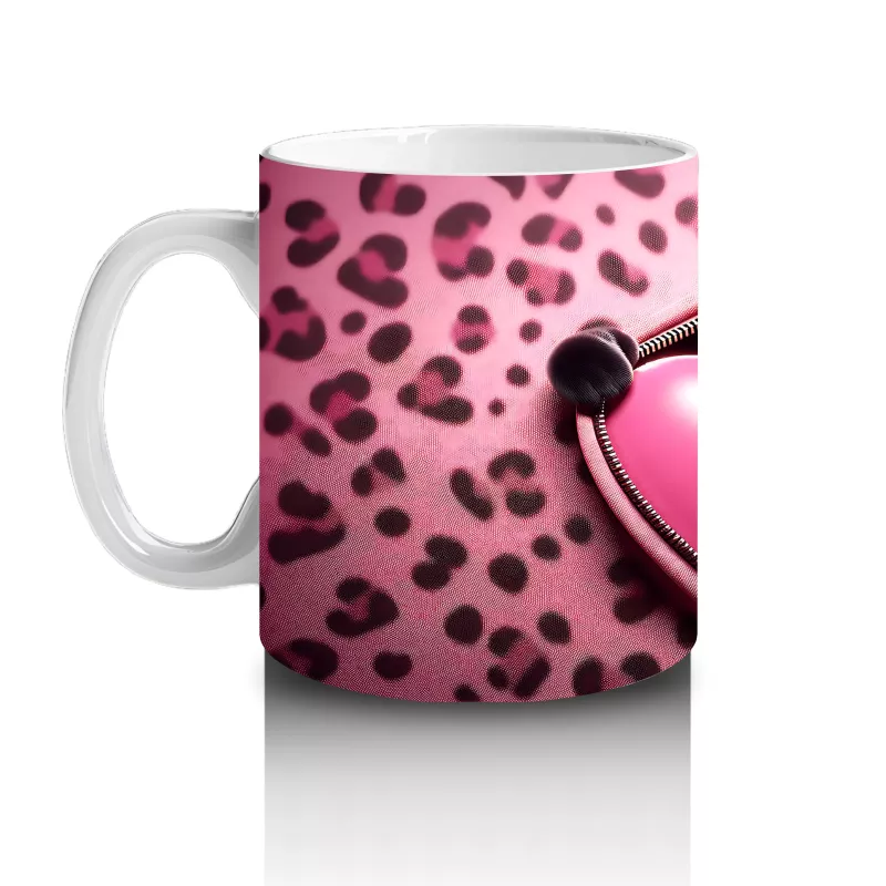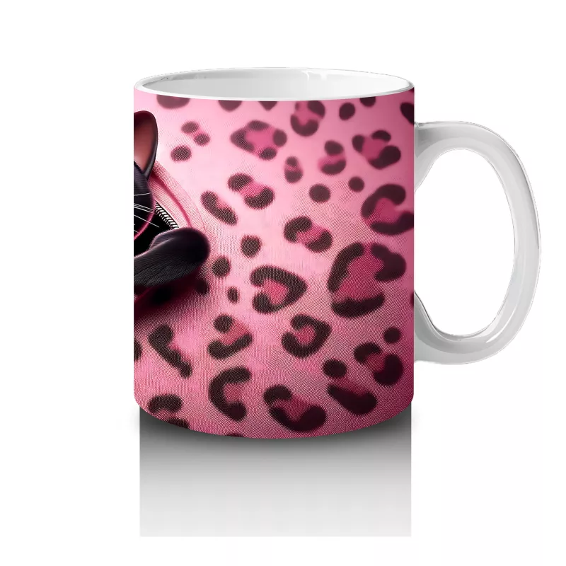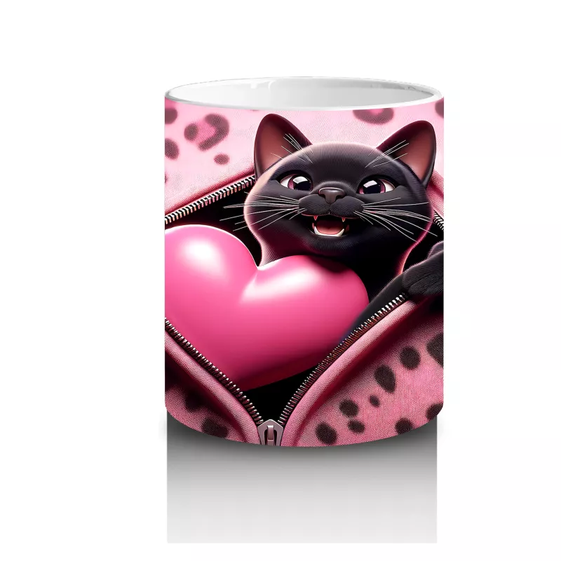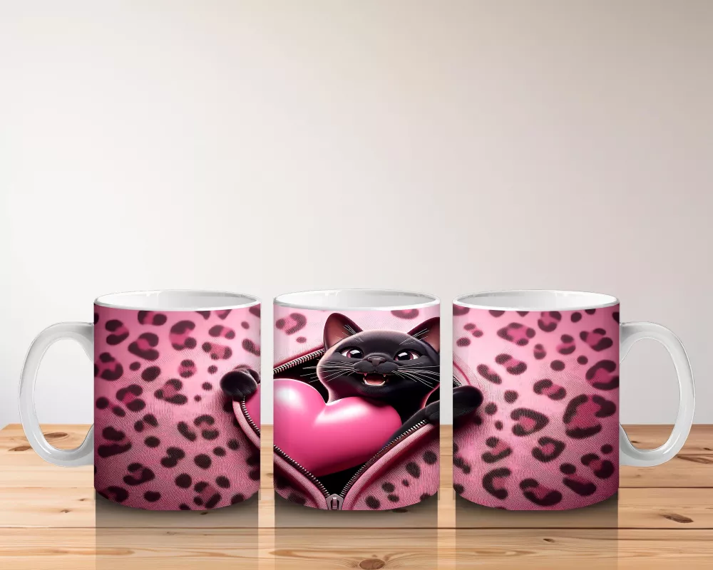 Pembe Kalpli Zeminde Kalpli Figür Tutan Sevimli Kara Kedi – Baskılı Kahve Kupası