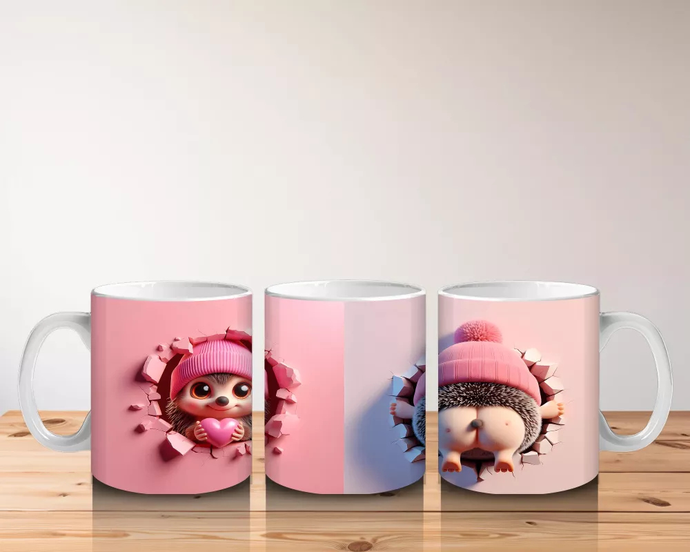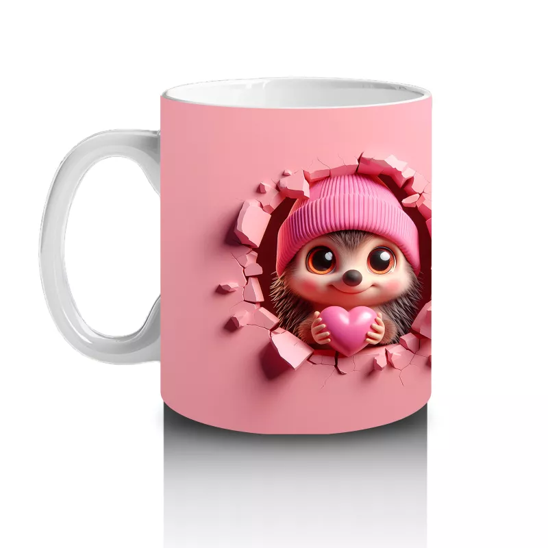 Kalpli figür tutan pembe bereli kirpi karakteri, sevgi dolu ve içten bir atmosfer yaratıyor. Romantik ve pozitif tasarımlar arayanlara hitap eden özel bir kupa.