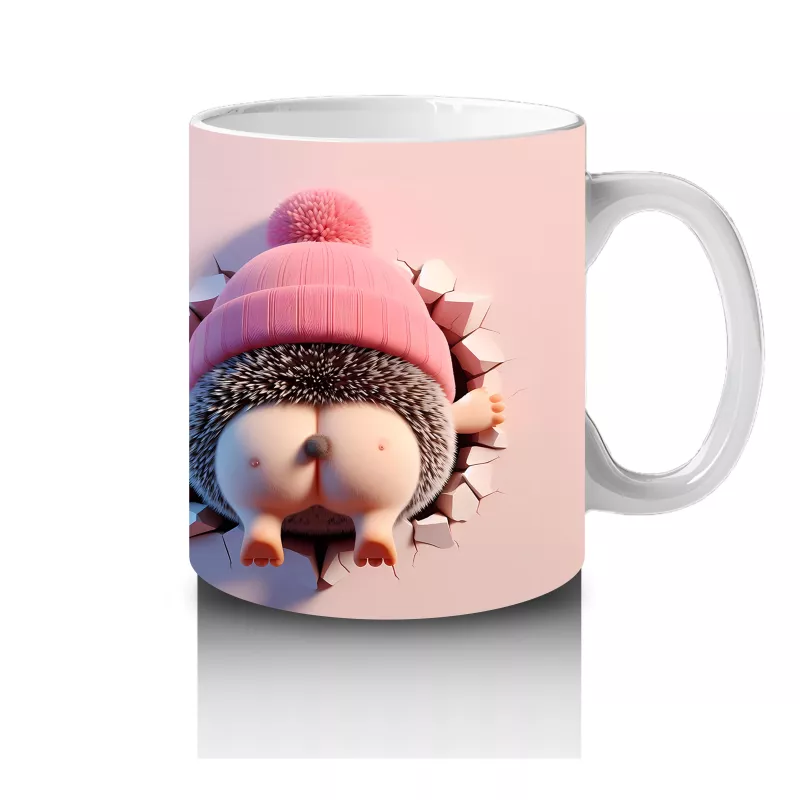 Kalpli Figür Tutan Pembe Bereli Kirpi Karakteri – Baskılı Kahve Kupası