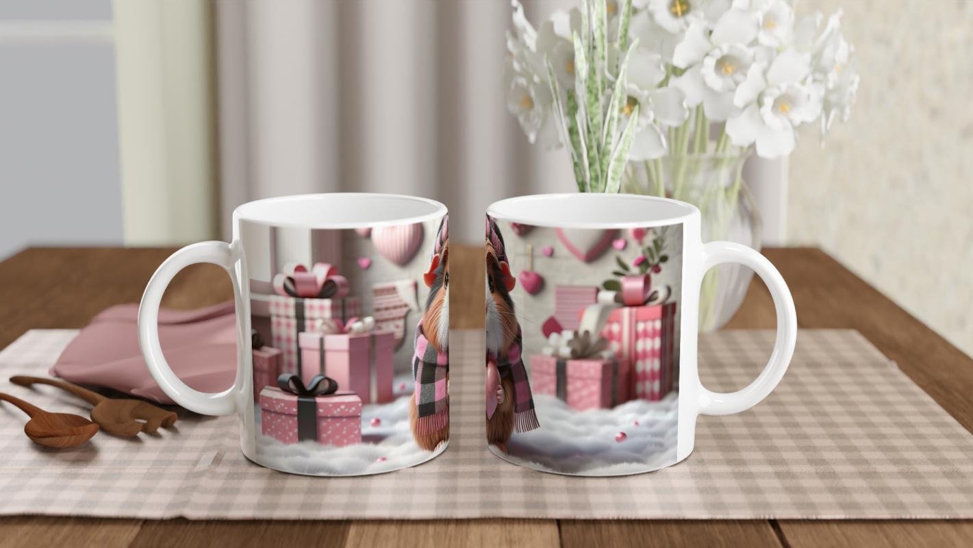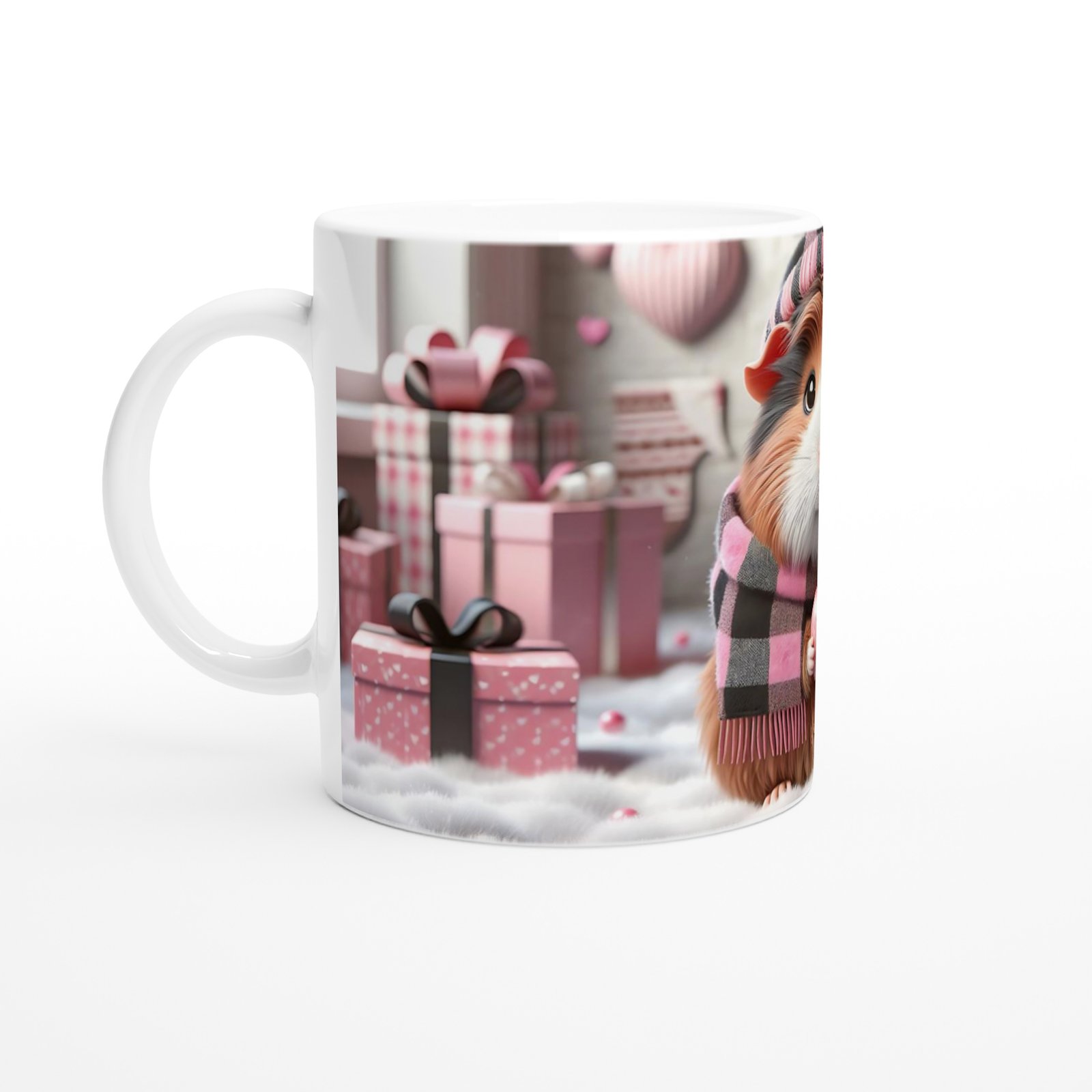 Kalpli Şapkalı Kobay Temalı Baskılı Kupa Bardak, pembe-siyah kareli atkısı, uyumlu bere şapkası ve iki patisinin arasındaki kalp figürüyle sıcaklık ve sevgi dolu bir atmosfer yaratıyor. Arka plandaki hediye kutuları ve kalp süslemelerle romantik bir bütünlük sağlayan bu tasarım, her içim anına mutluluk katıyor.