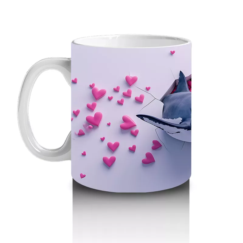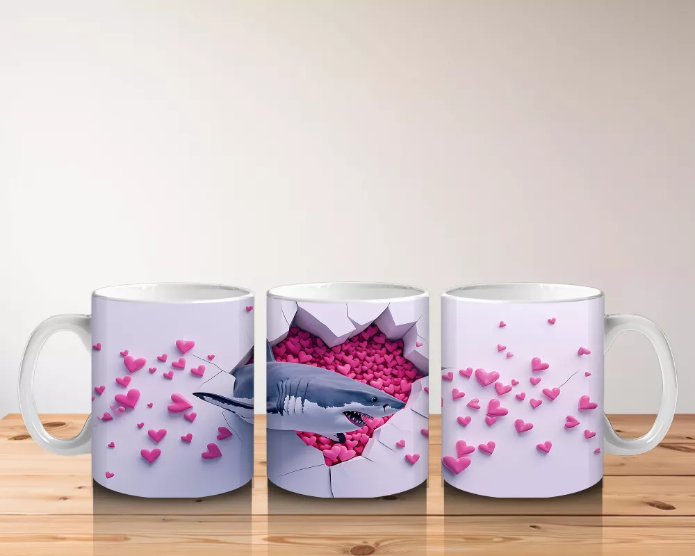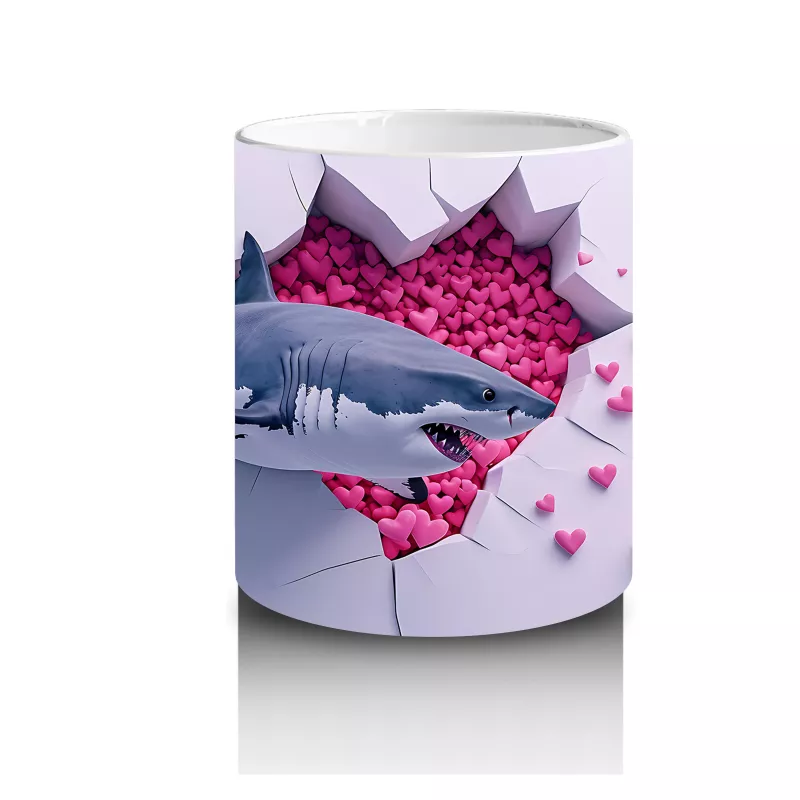 Pembe kalplerle süslenmiş duvarı delen bu köpekbalığı figürü, sertliği sevimlilikle buluşturan eğlenceli bir tasarım sunuyor. Cesur ve espirili kupa arayanlar için dikkat çekici bir model.