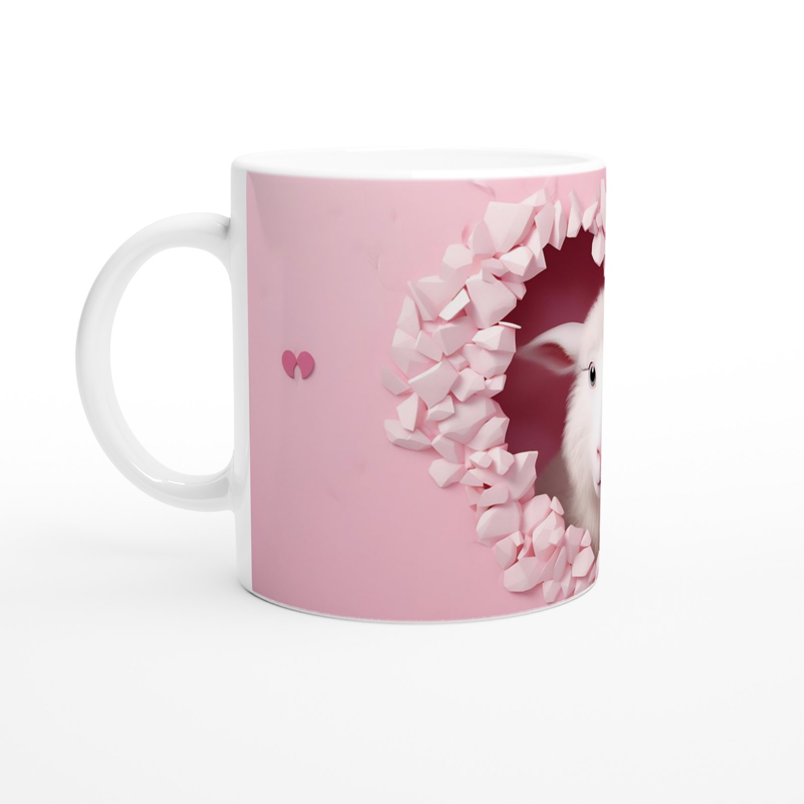 Kalpli Çatlaktan Bakan Sevimli Kuzu Temalı Baskılı Kupa Bardak, pembe tonlar, kırık duvar efekti ve zarif detaylarla hem narin hem de göz alıcı bir tasarım ortaya koyuyor. Doğallığı ve sadeliği sevenler için ideal bir tercih.