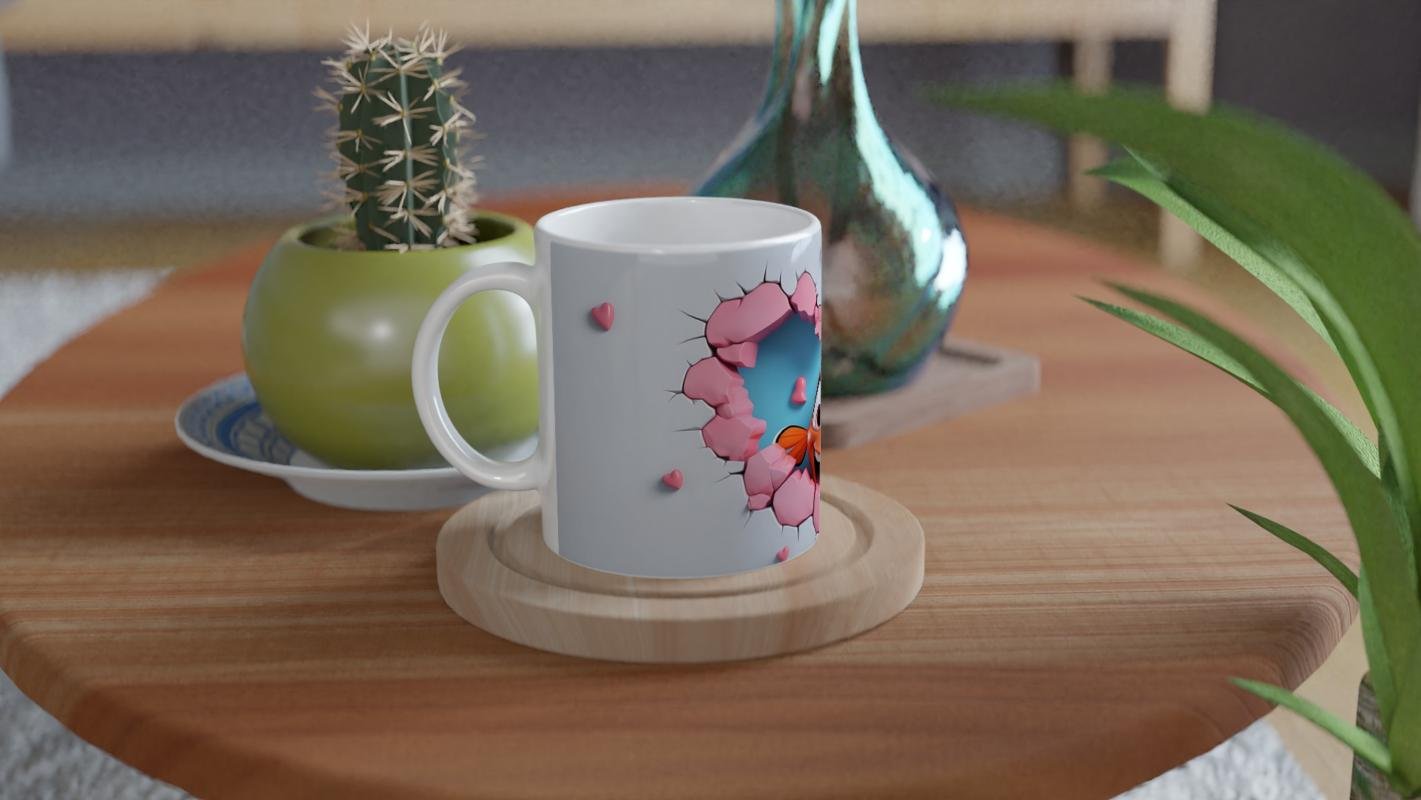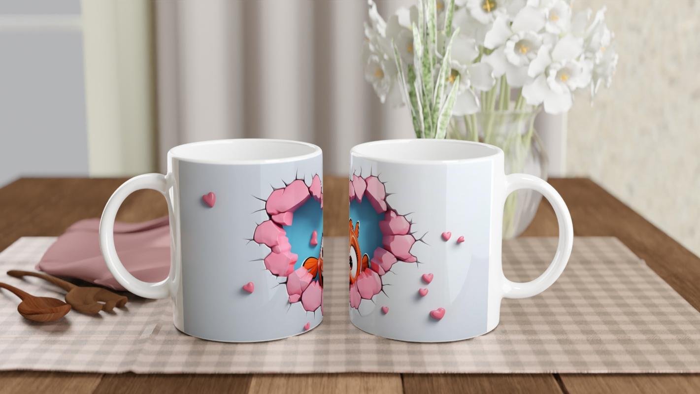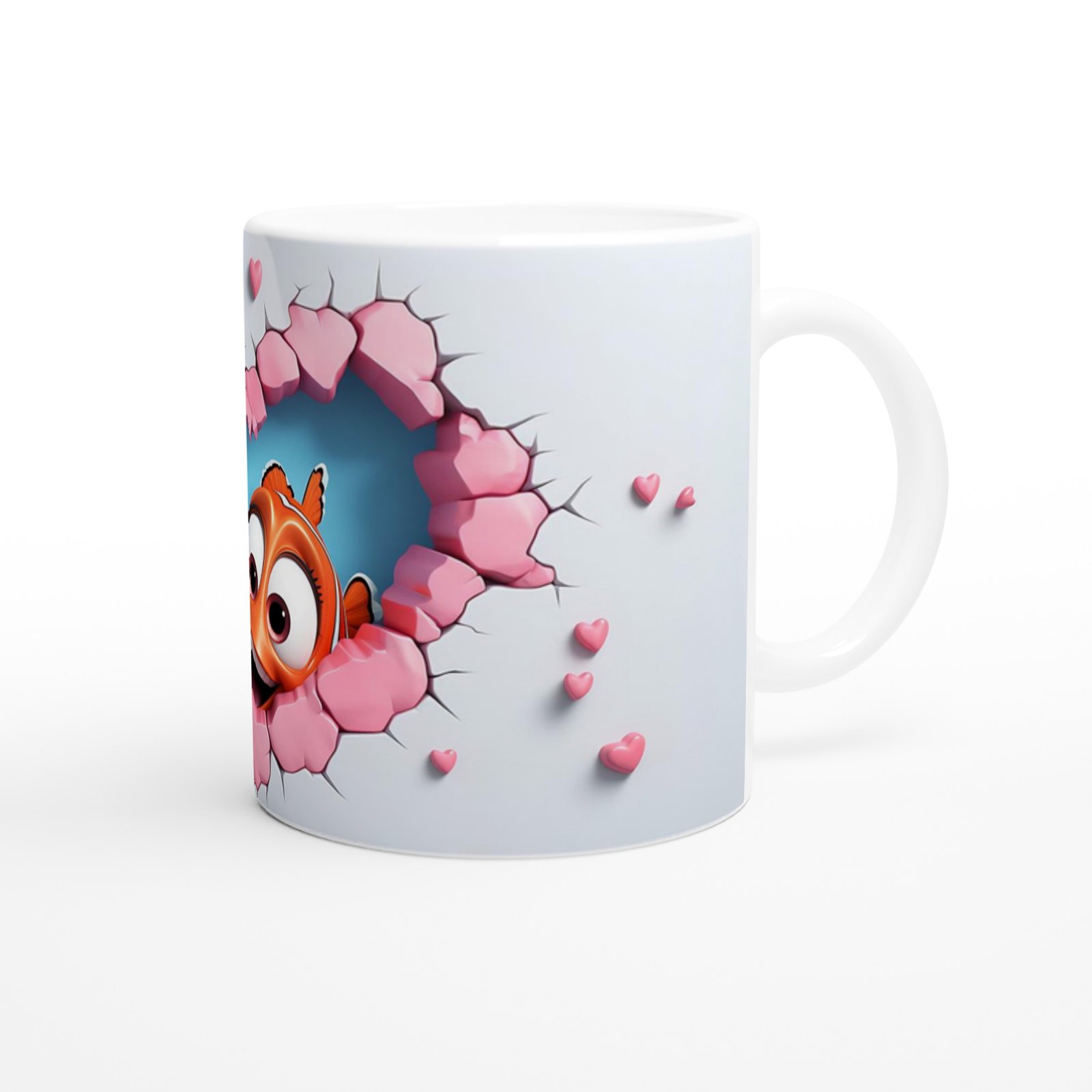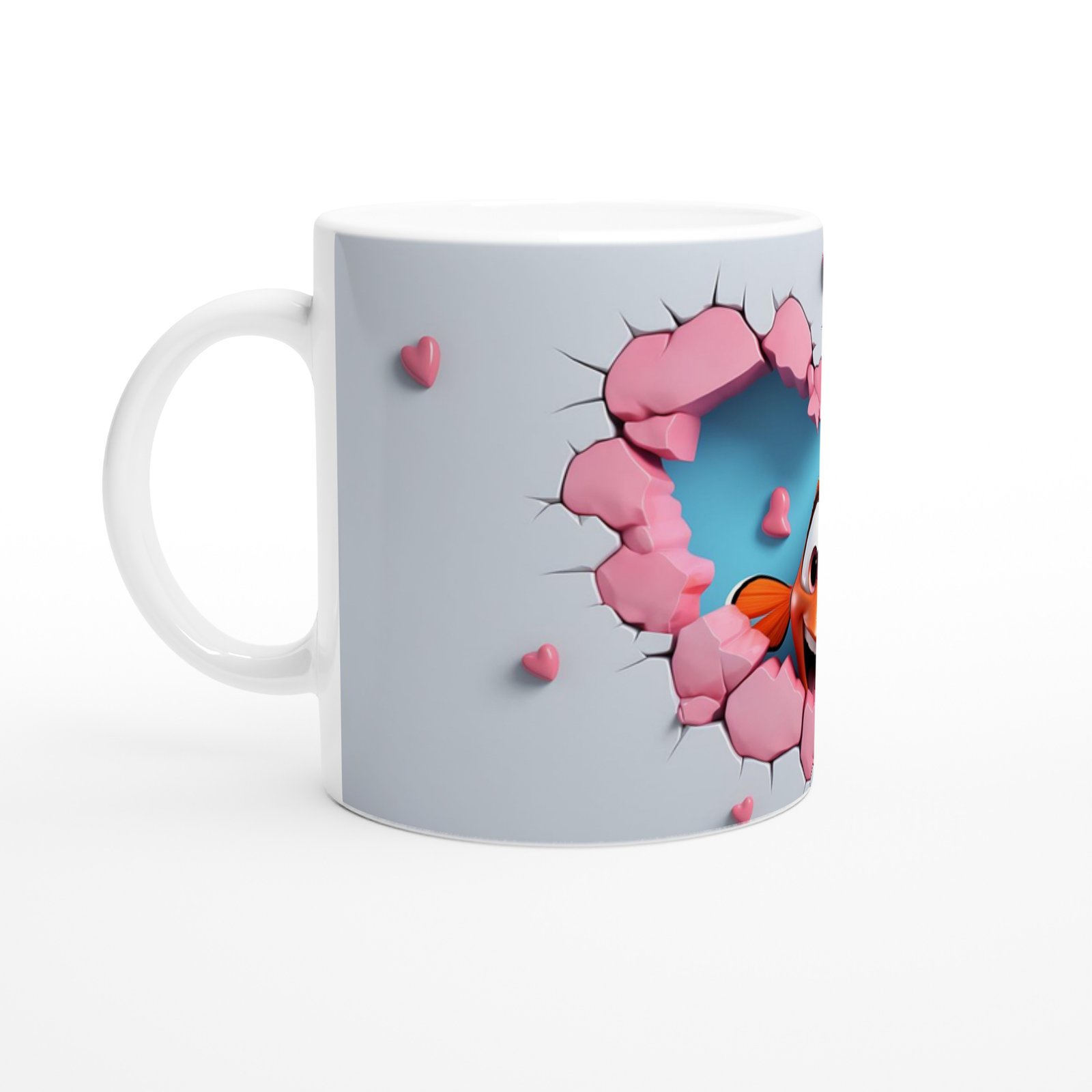 Kalpli Çatlağın Ardından Bakan Palyaço Balığı Temalı Baskılı Kupa Bardak, mavi fon önünde pembe kalp desenli çatlaklardan çıkan sevimli balık illüstrasyonuyla hem deniz temasını hem sevgiyi bir araya getiriyor. Renkli ve eğlenceli bir hediye alternatifi.