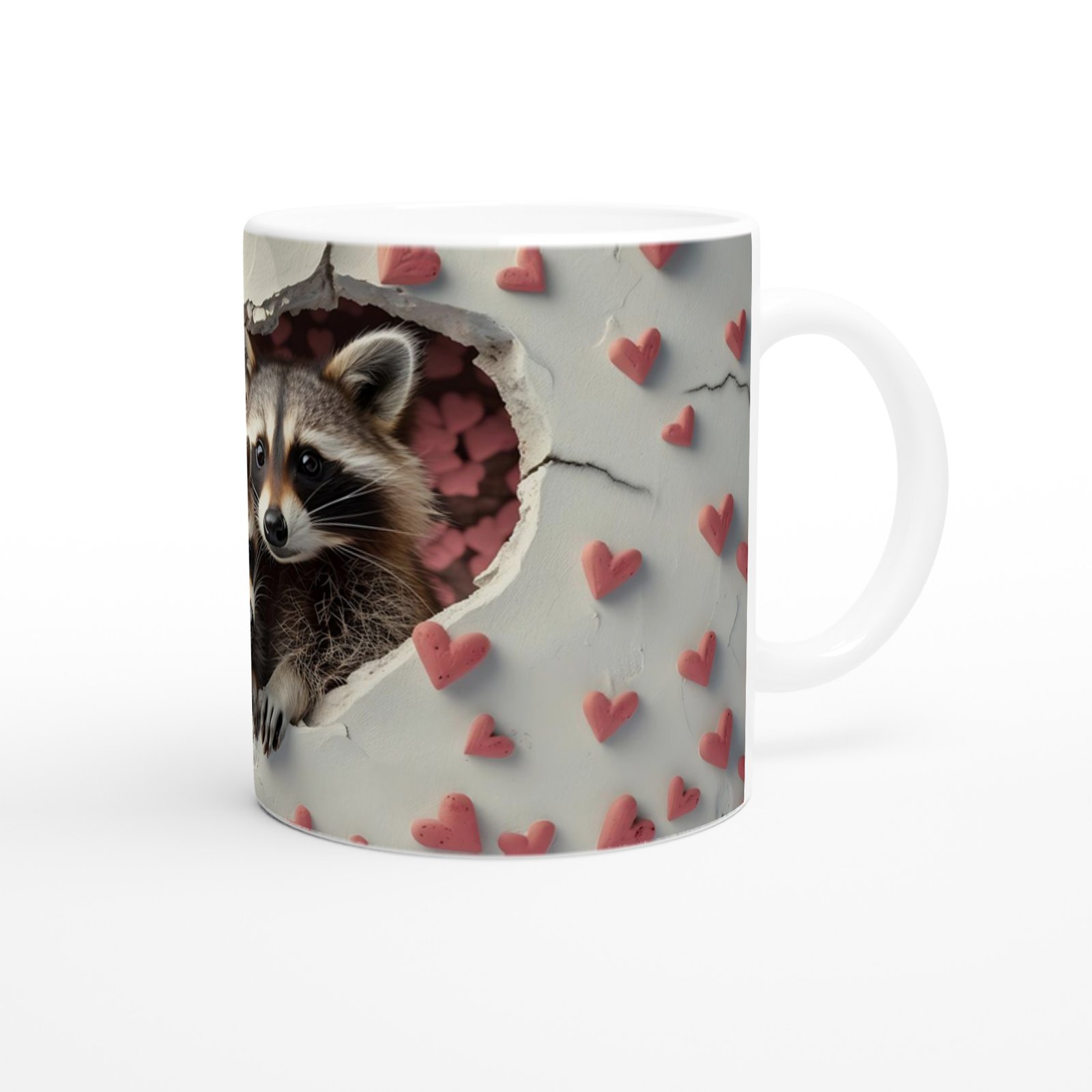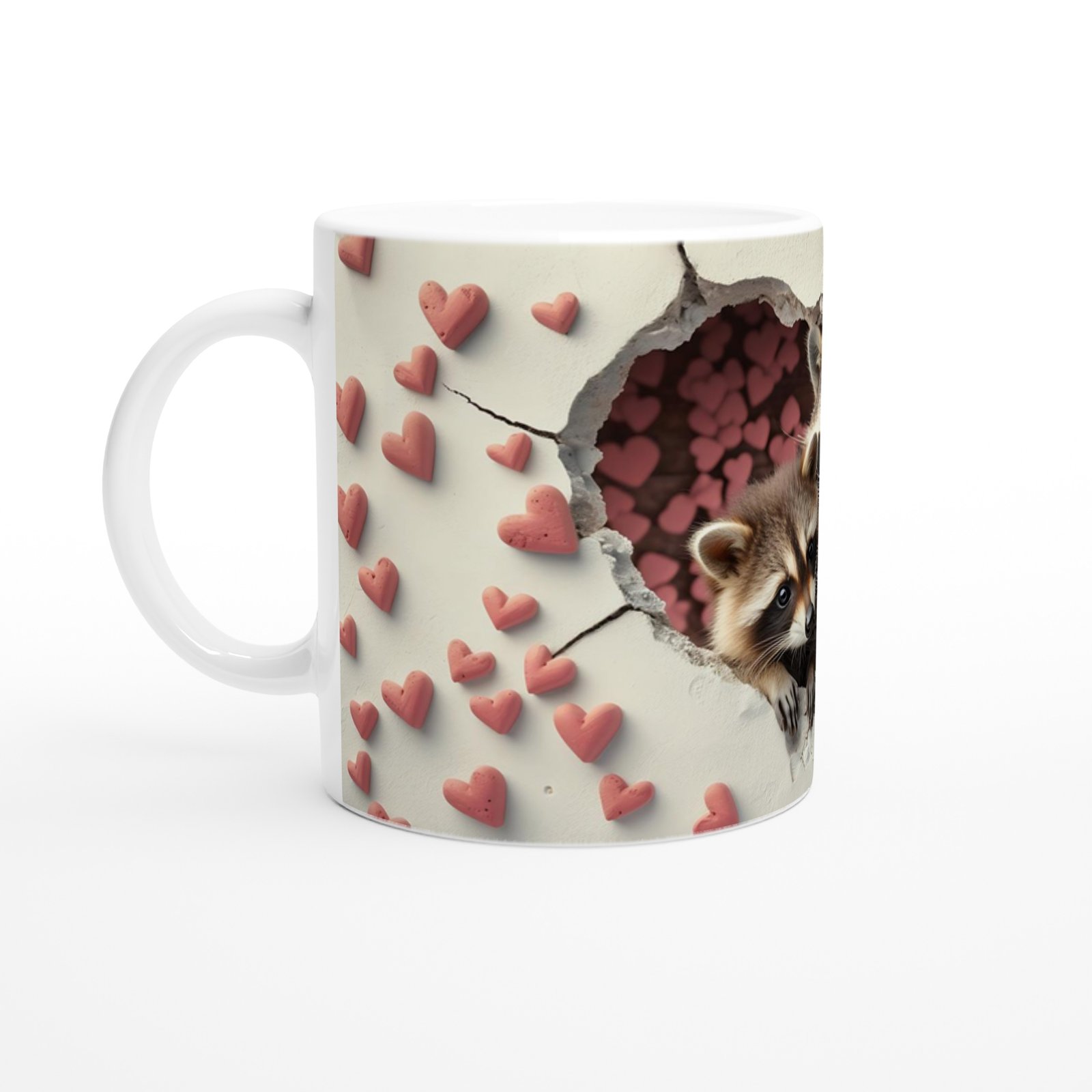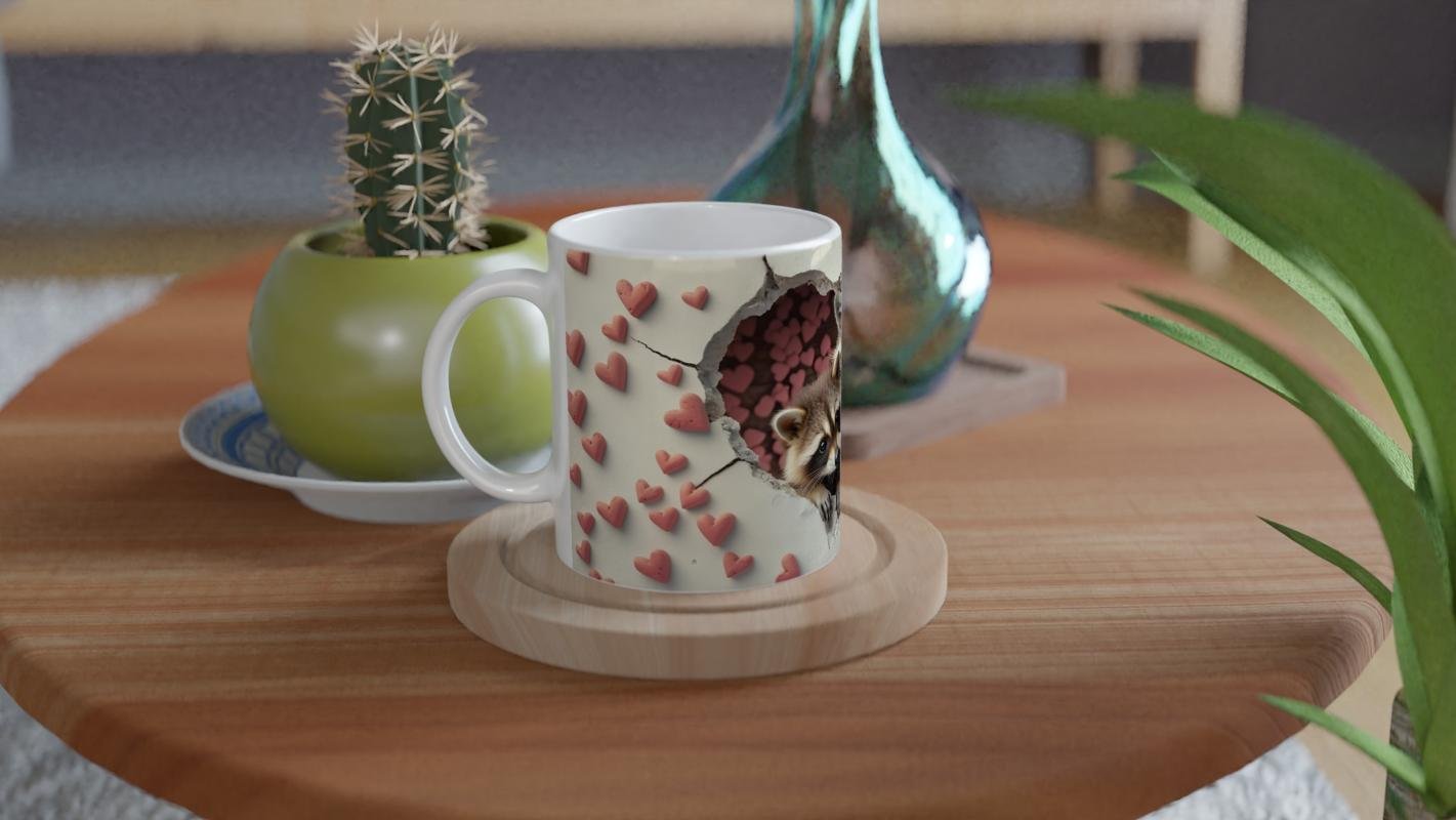 Kalpli Çatlaktan Bakan Rakunlar Temalı Baskılı Kupa Bardak, çatlak duvar efekti ve kalp desenleriyle çevrelenmiş detaylarıyla içtenlik dolu bir atmosfer yaratır. Doğal yaşamı sevenler için şirin bir tercih.