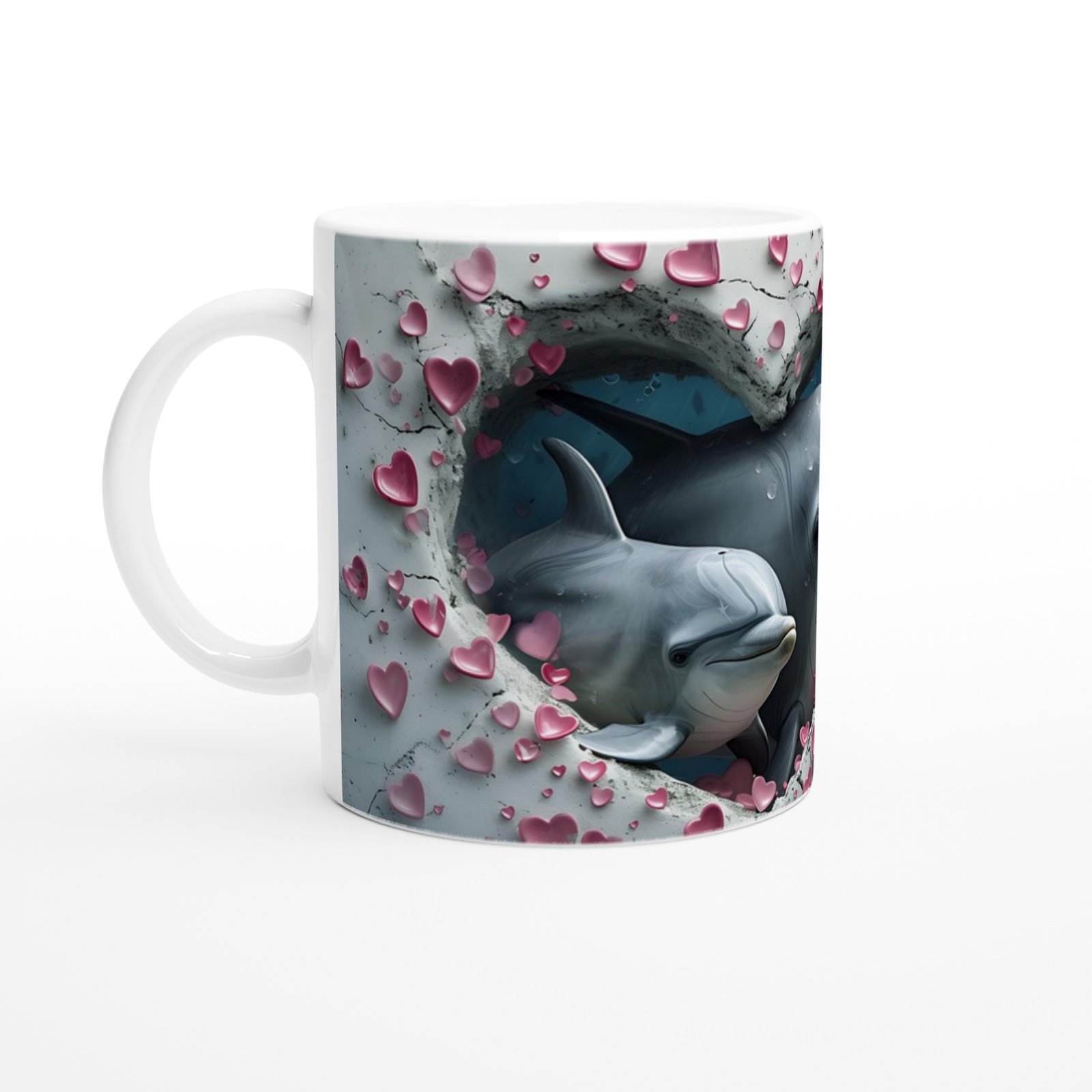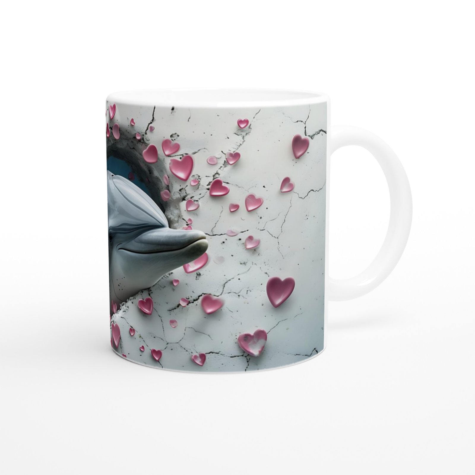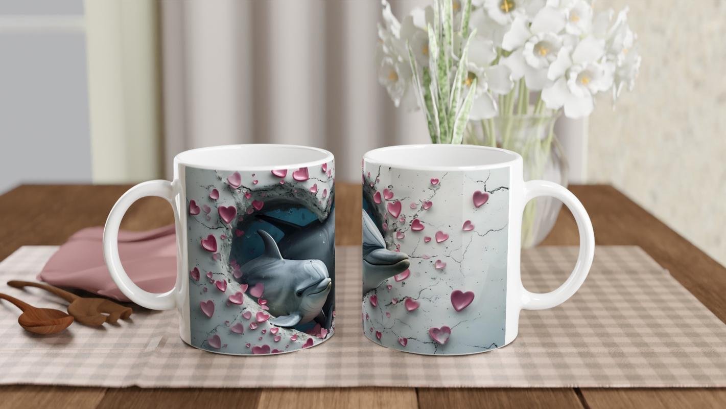 Kalpli Çatlaktan Bakan Yunuslar Temalı Baskılı Kupa Bardak, deniz altı büyüsüyle çatlak duvar efektini birleştirerek romantik ve özgün bir tasarım sunuyor. Doğayı ve hayvanları sevenler için zarif bir hediye seçeneği.