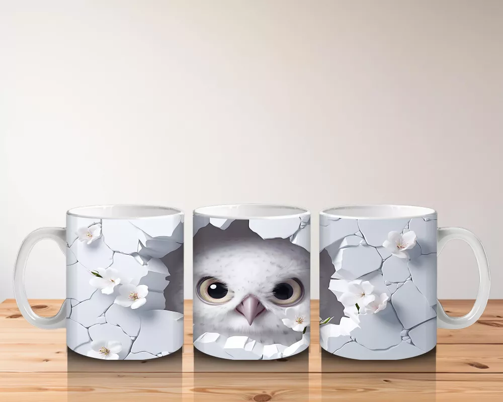 Beyaz Çiçekler Arasında Keskin Gözlü Baykuş – Baskılı Kahve Kupası