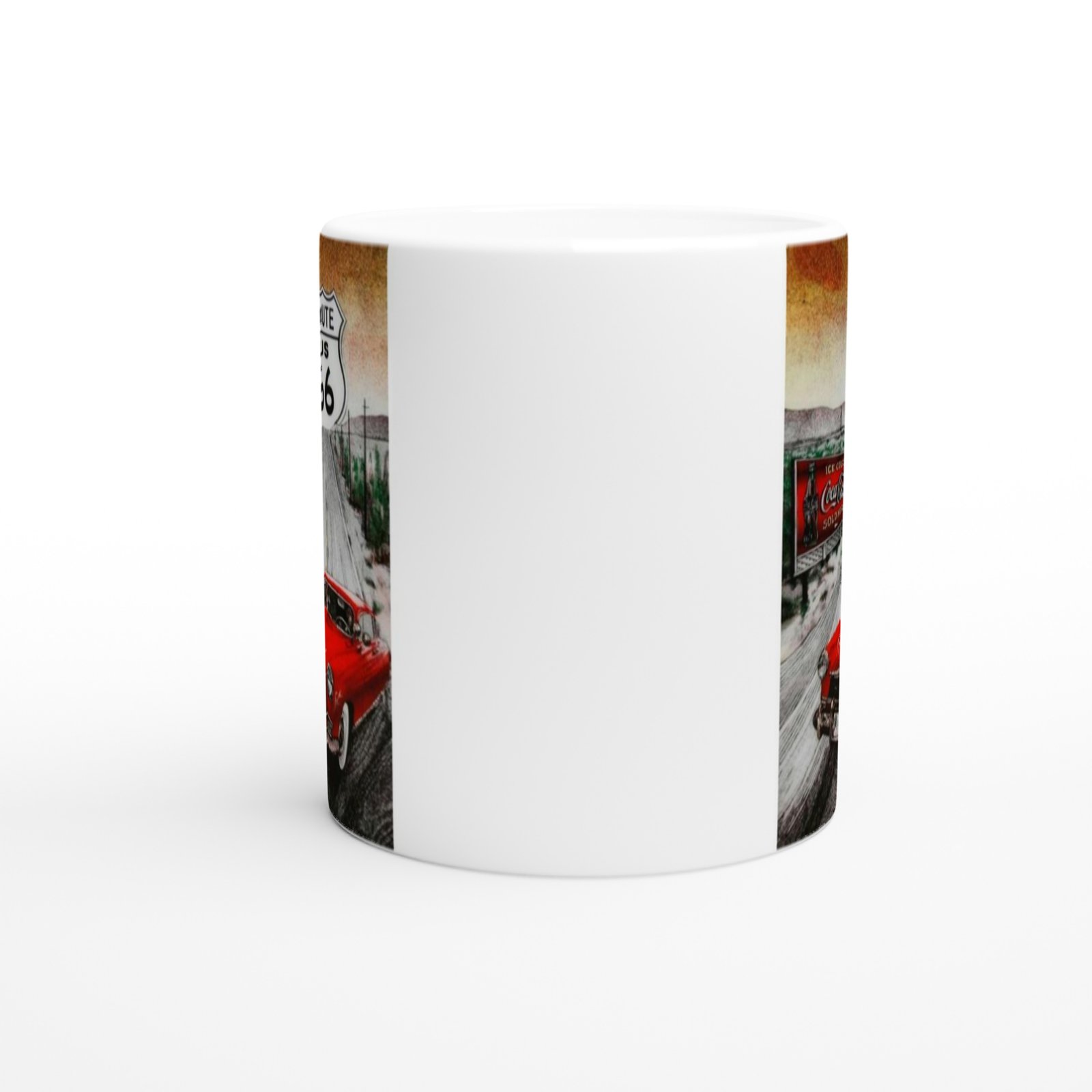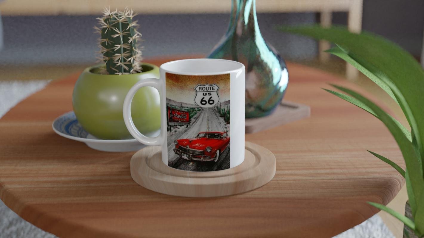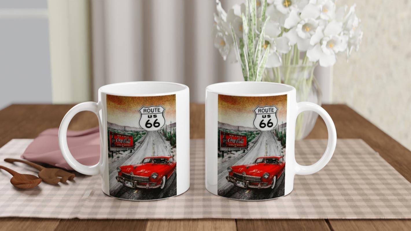 Alev desenli kırmızı klasik arabayla Route 66 yolunda geçen sahne, bu kupaya vintage bir hava katıyor; koleksiyonluk ve günlük kullanım için harika bir tercih.