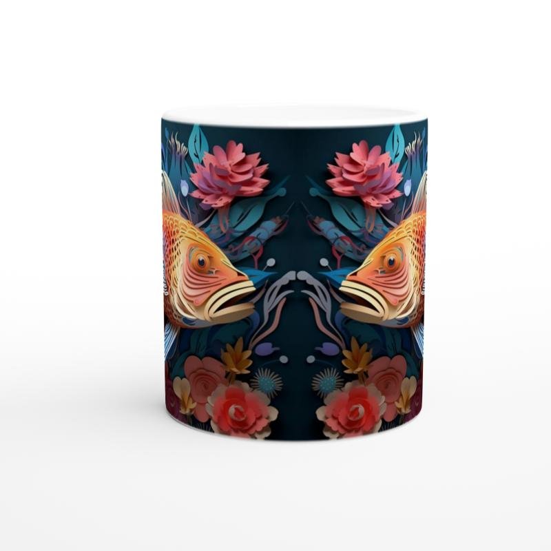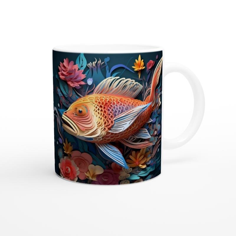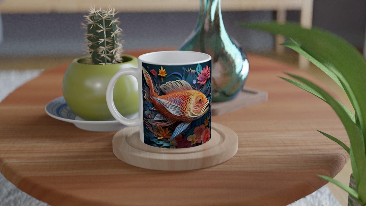 Japon kültüründe şans ve sabrı simgeleyen koi balığı, bu göz alıcı kupa bardakta çiçeklerle dans ediyor.