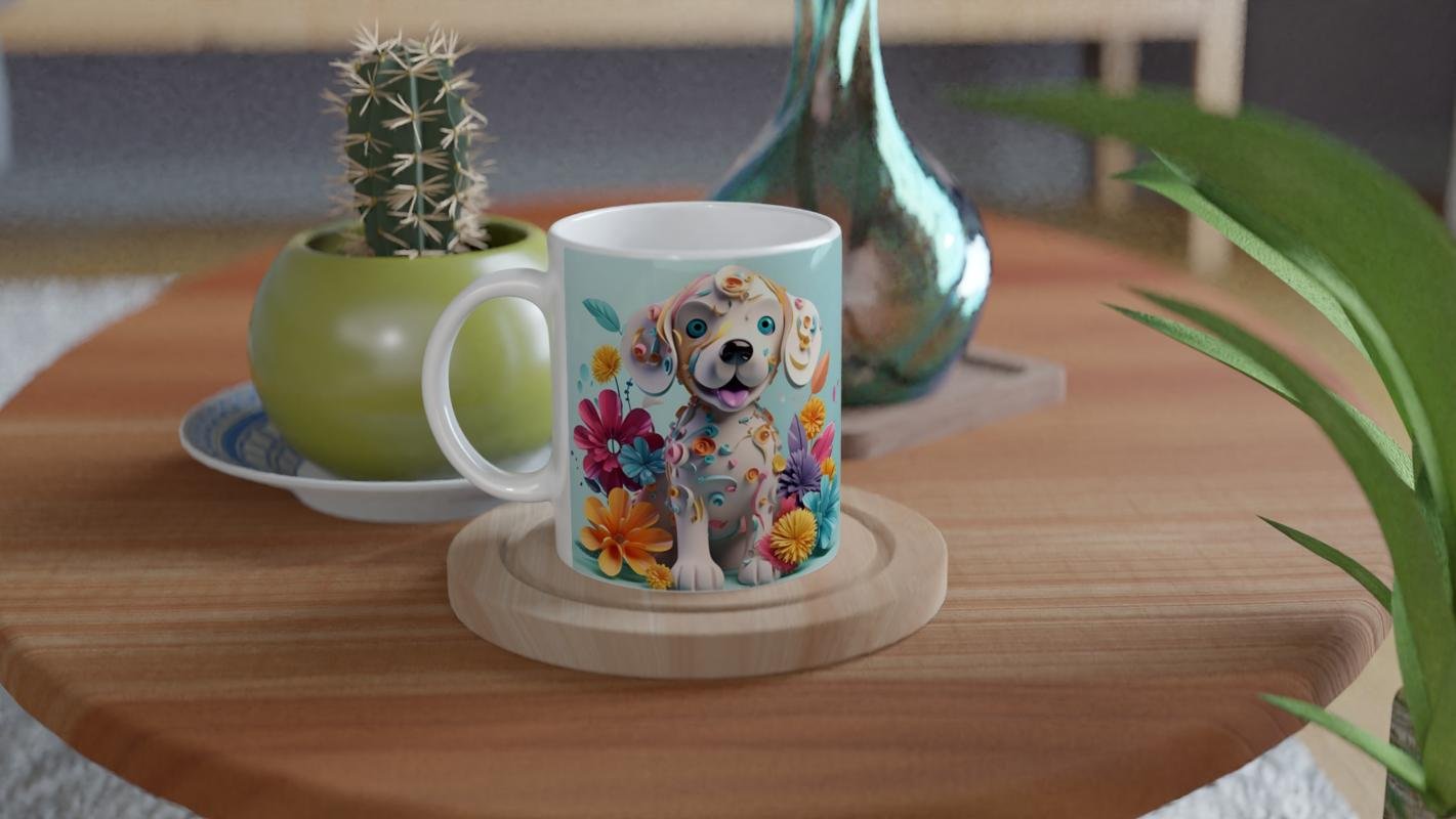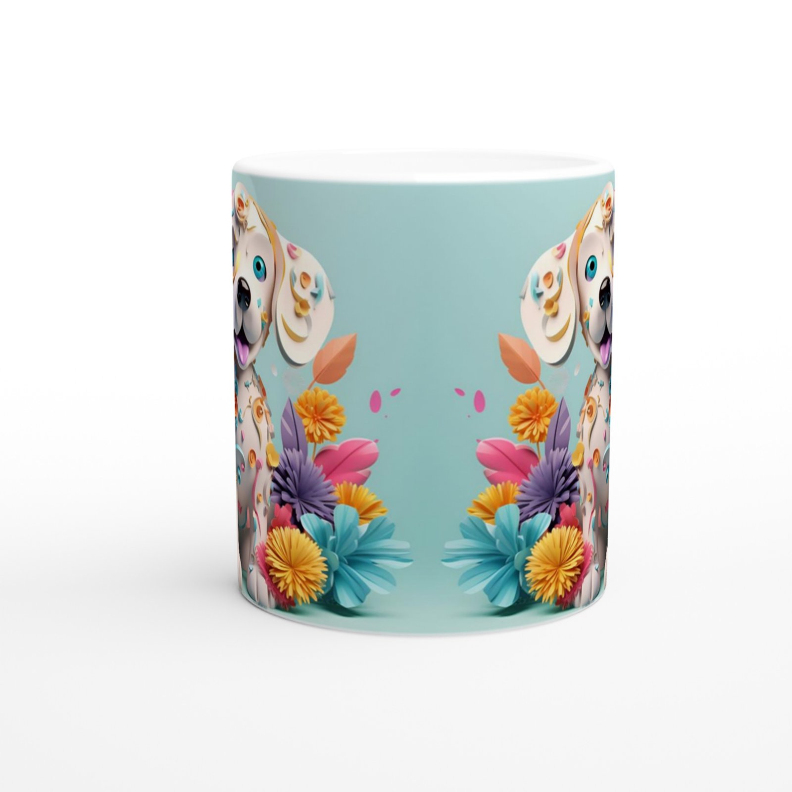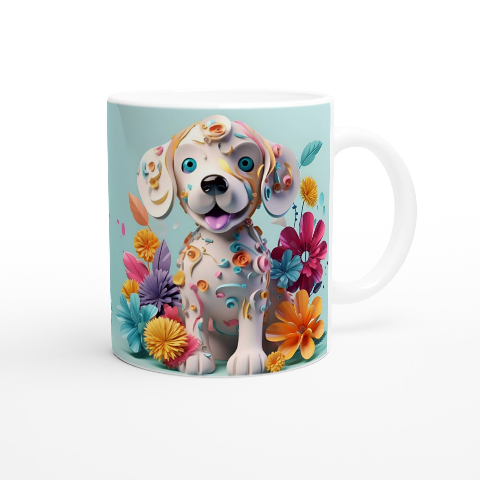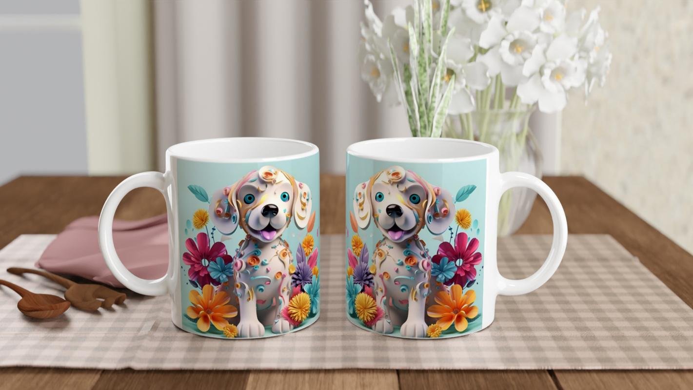 Konfeti ve çiçeklerle süslenmiş neşeli köpek temalı kupa bardak, pozitif enerji dolu tasarımıyla kahve keyfinize neşe katıyor!