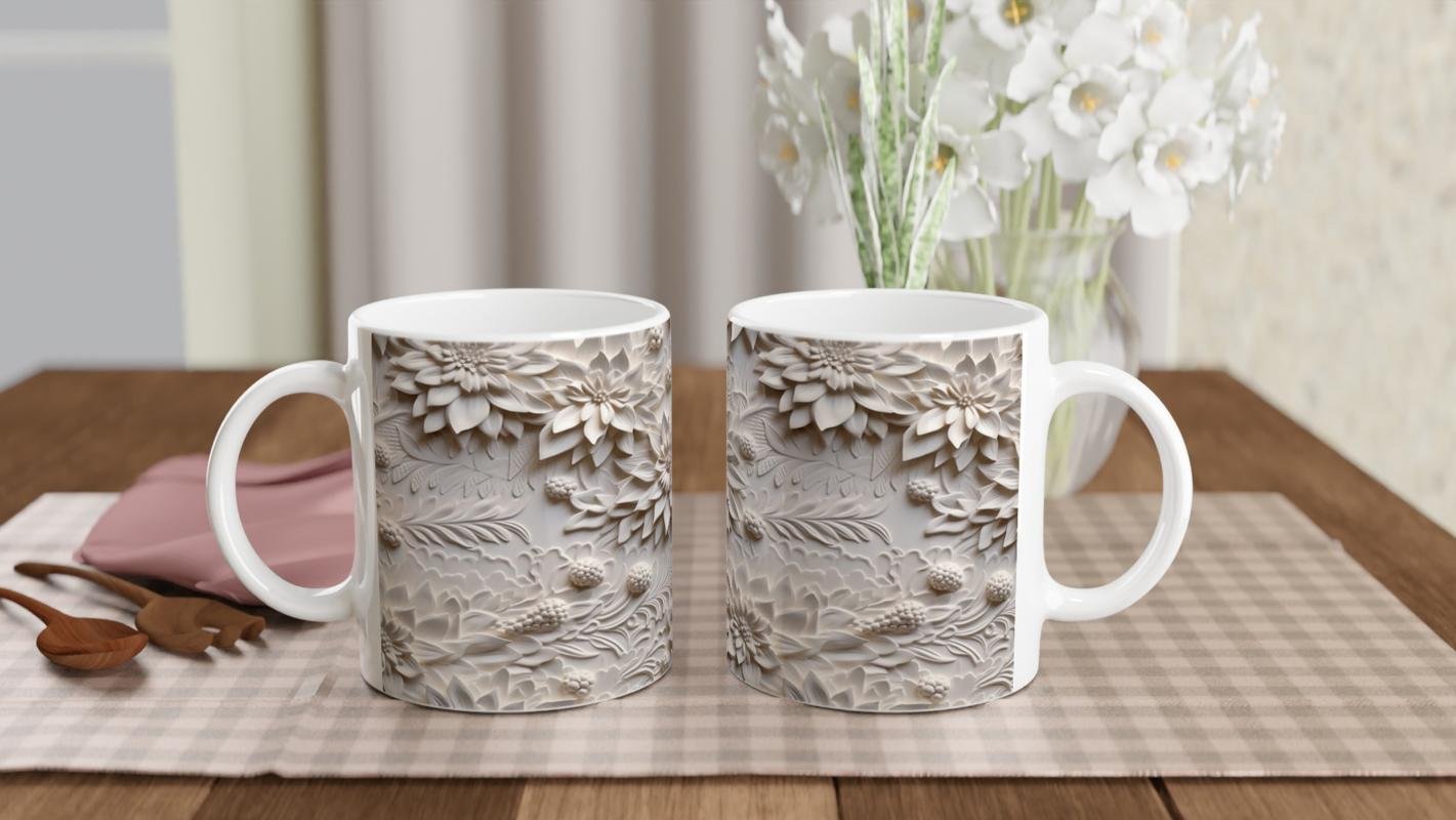 Dondurulmuş Krem Çiçekler Kupa Bardak, donmuş bir çiçek bahçesini andıran üç boyutlu yüzeyiyle hem modern hem klasik dekorlara uyum sağlar.