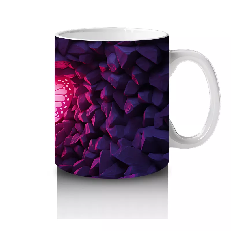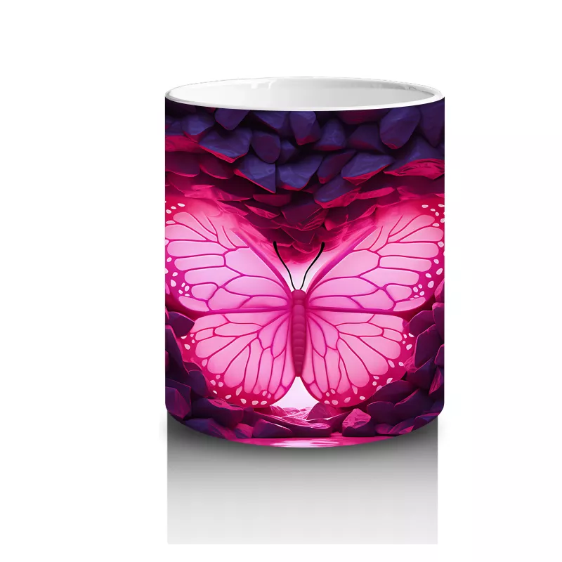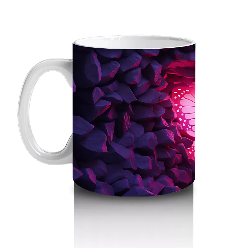 Mor Kristal Taşlar Arasında Parlayan Kelebek – Baskılı Kahve Kupası
