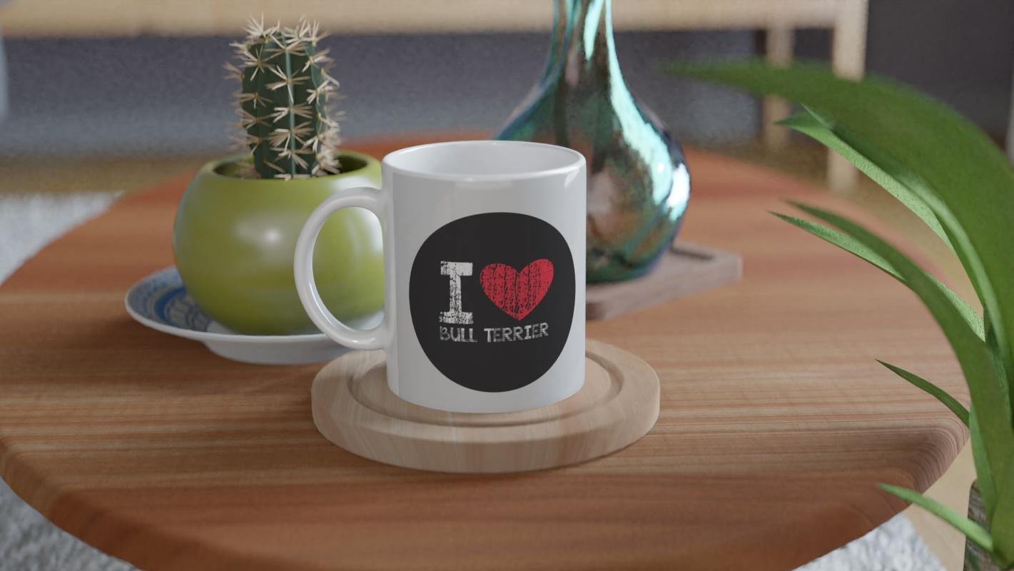 I Love Bull Terrier Temalı Baskılı Kupa Bardak, modern vektörel çizim ve nostaljik efektli yazı stiliyle köpek severlerin beğenisini kazanıyor. Bull terrier ırkına gönül vermiş herkes için anlamlı ve kişisel bir hediye seçeneğidir.