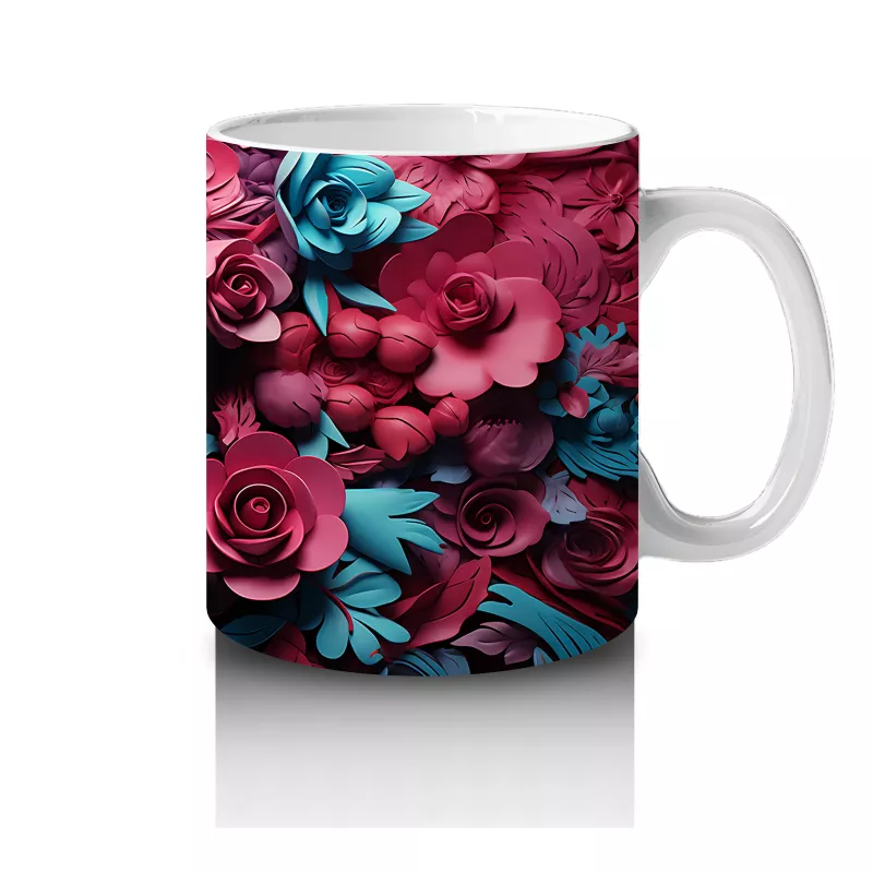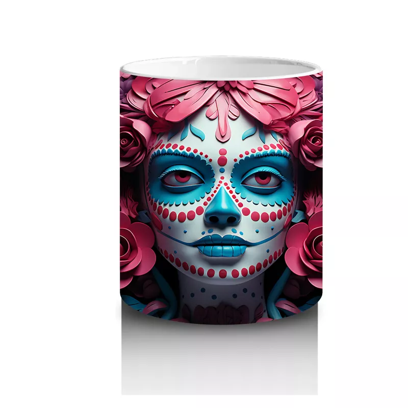 Renkli çiçeklerin arasında yer alan solgun, buz efektli yüz figürü bu Cadılar Bayramı temalı baskılı kupaya büyüleyici bir hava katıyor. Şık bir hediyelik kahve kupası olarak öne çıkar.