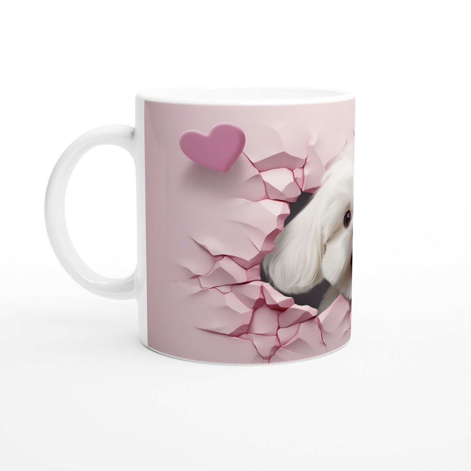 Pembe Çatlaktan Bakan Maltese Terrier Temalı Baskılı Kupa Bardak, çatlak efektli pastel arka planı ve kalp detaylarıyla zarif bir görünüm sunar. Evcil hayvan severler için sevimli ve enerjik bir hediye alternatifi.