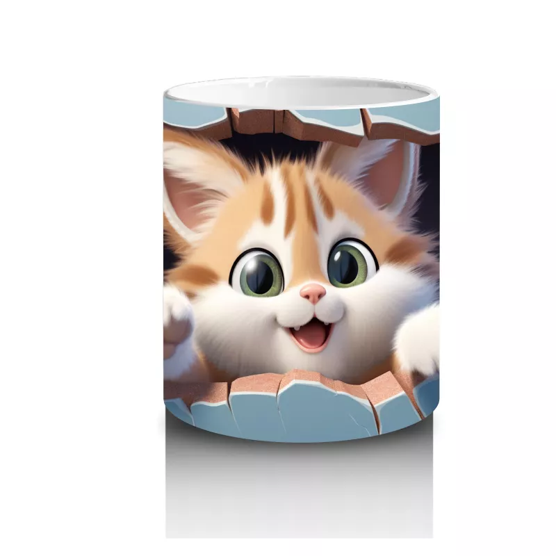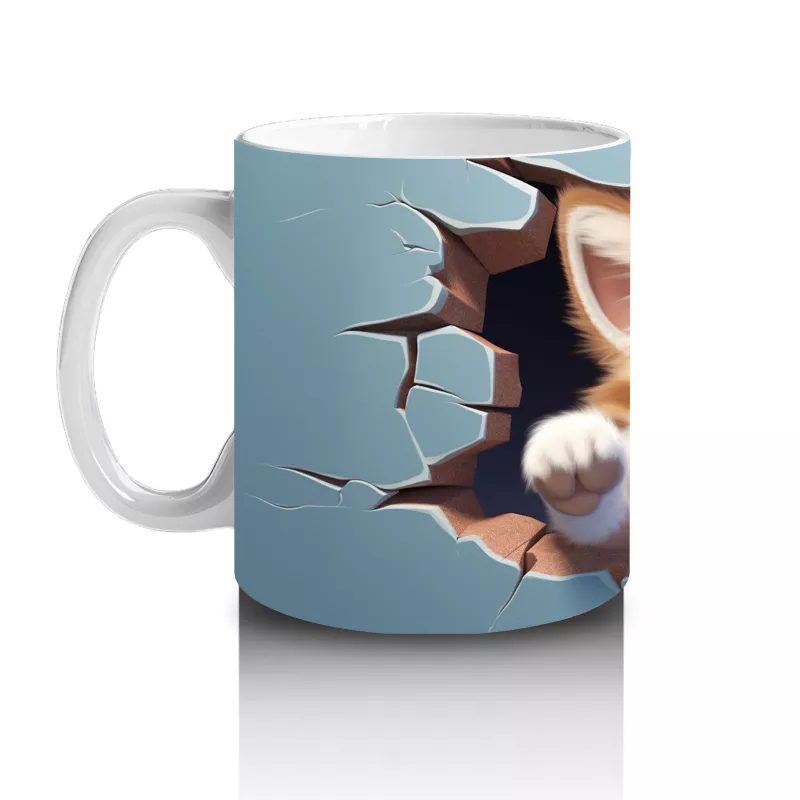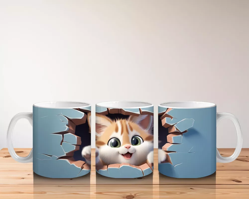 Mavi fon üzerine yırtık desenli kedi figürü, özgün ve modern bir görünüm sunuyor. Dinamik ve şık tasarımlar sevenlere hitap eden bir kupa.