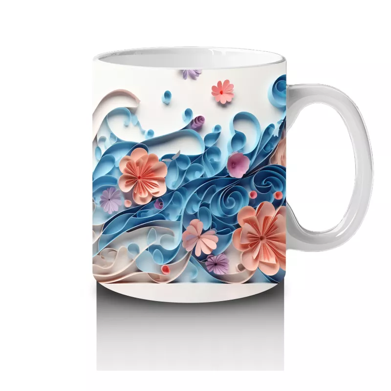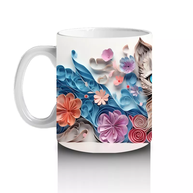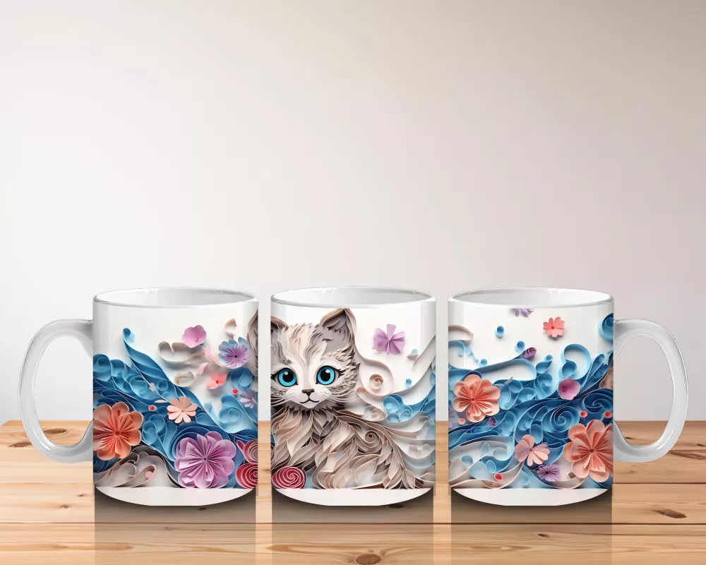 Mavi Tonlarda Çiçeklerle Süslenmiş Kedi – Baskılı Kahve Kupası