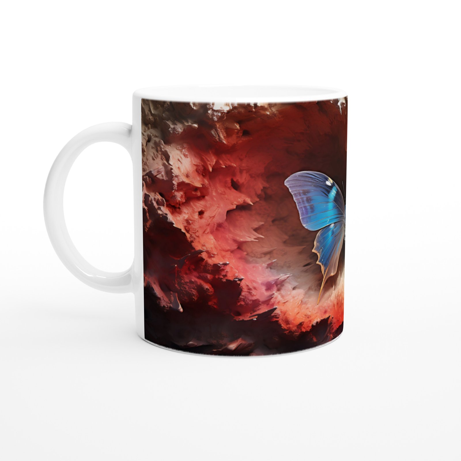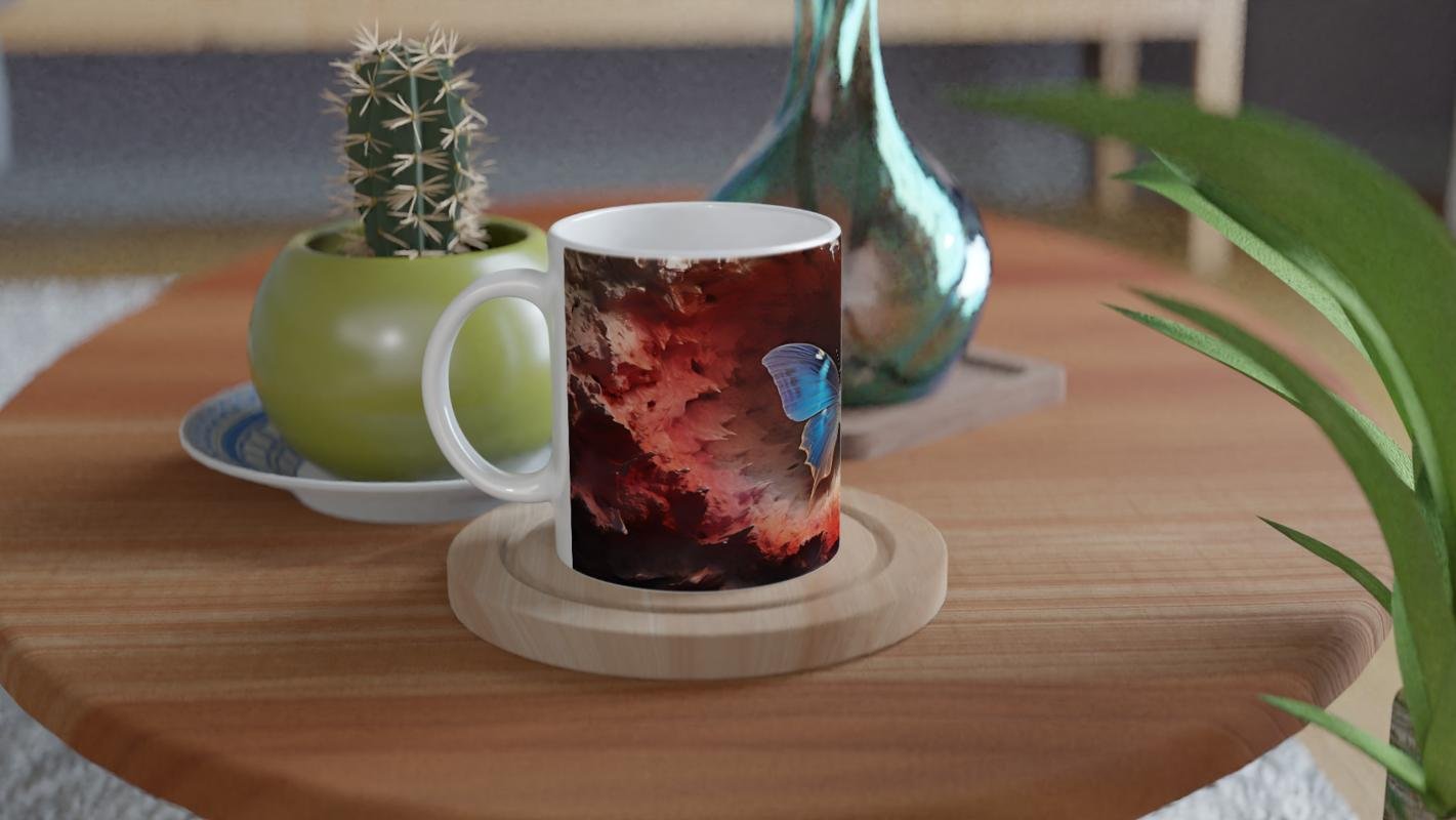 Ateş Çemberinden Doğan Mavi Kelebek Temalı Baskılı Kupa Bardak, alev kırmızısı ve gece tonlarının ortasında parlayan zarif bir kelebek figürüyle adeta yeniden doğuşu simgeliyor. Sanatı ve doğayı bir araya getiren bu özel tasarım, tutkulu ruhlara hitap ediyor.
