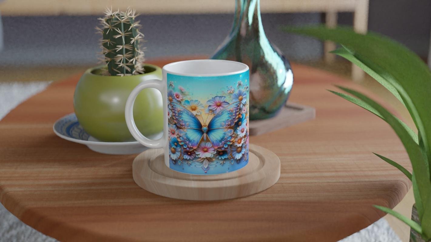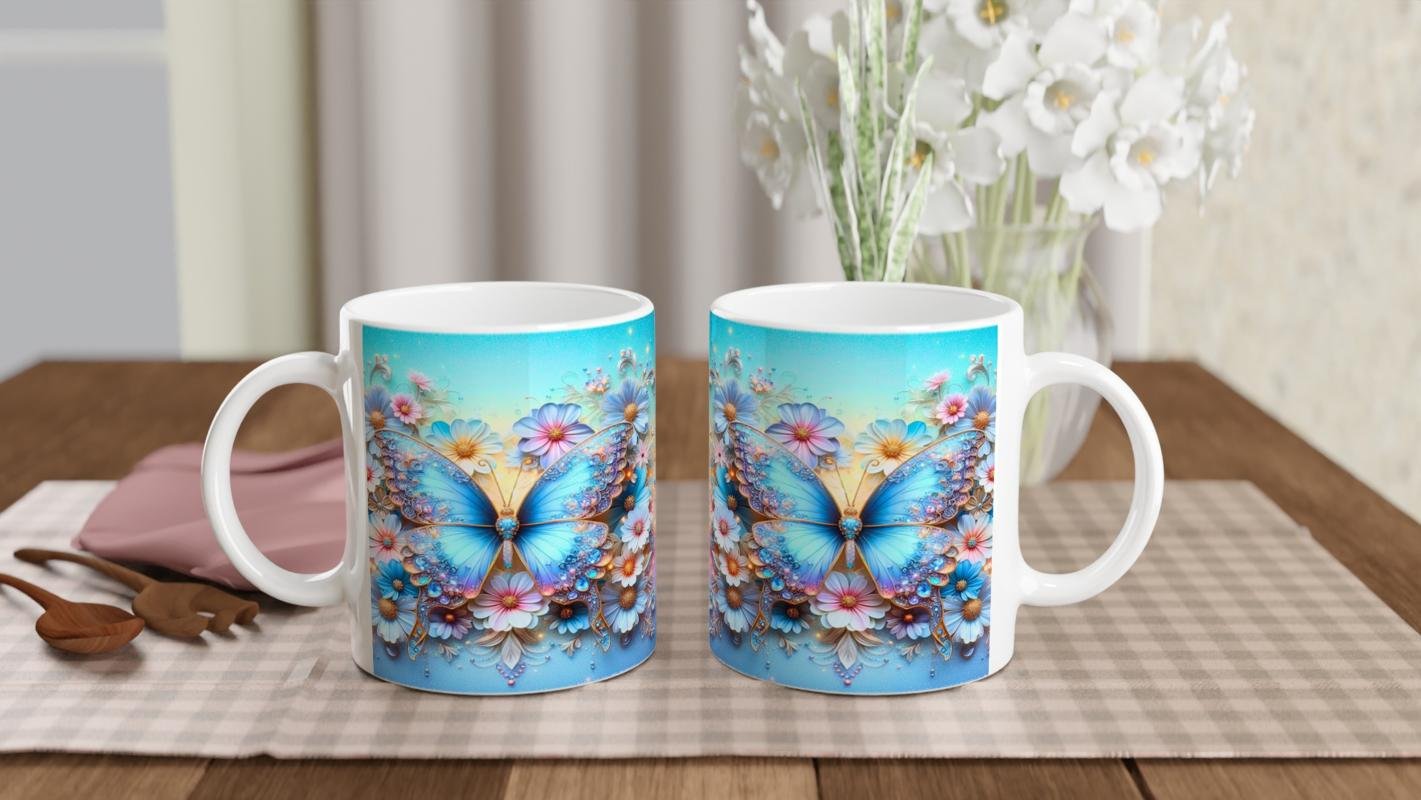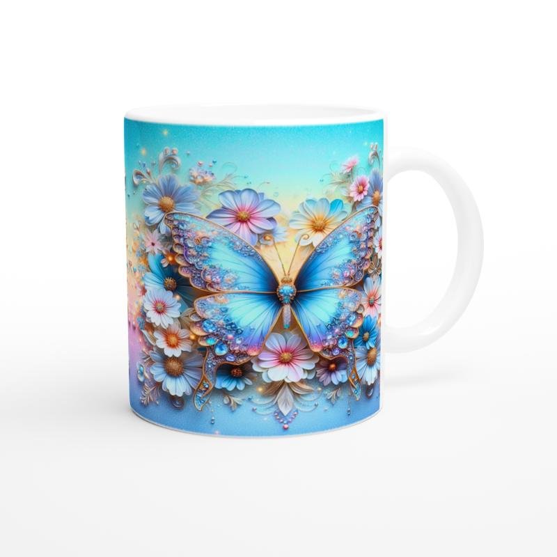 Kelebek baskılı kupa, zarif mavi tonları ve ışıltılı taş detaylarıyla göz alıcı bir estetik sunar.