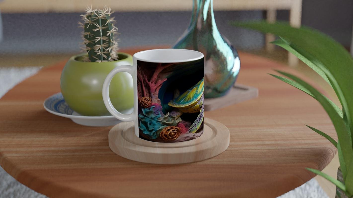 Canlı renkli mercan çiçekleriyle çevrelenmiş bu deniz kaplumbağalı kupa bardak, her yudumda tropik bir keşif duygusu uyandırır.