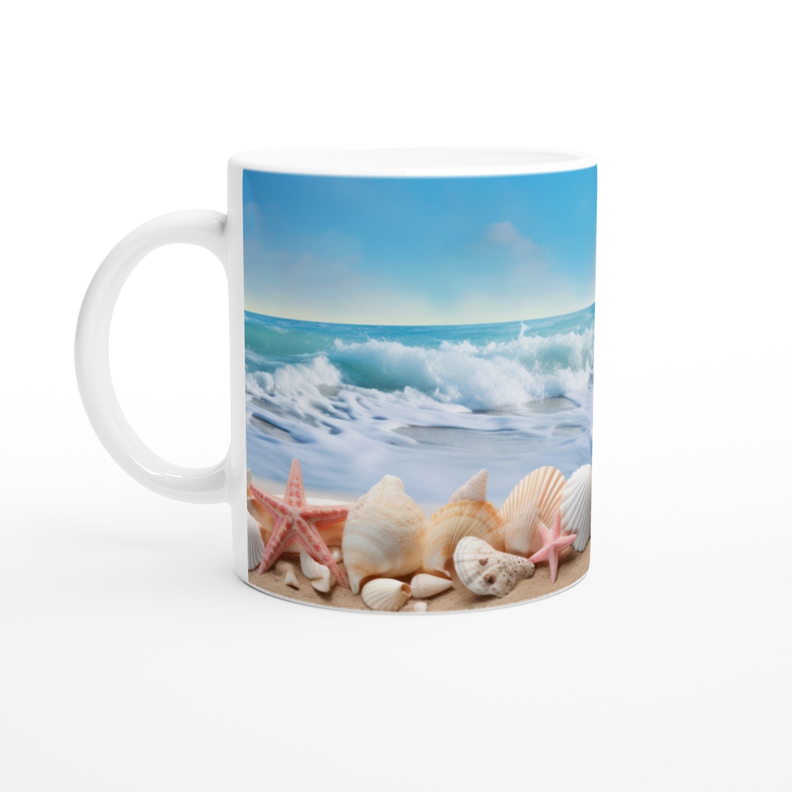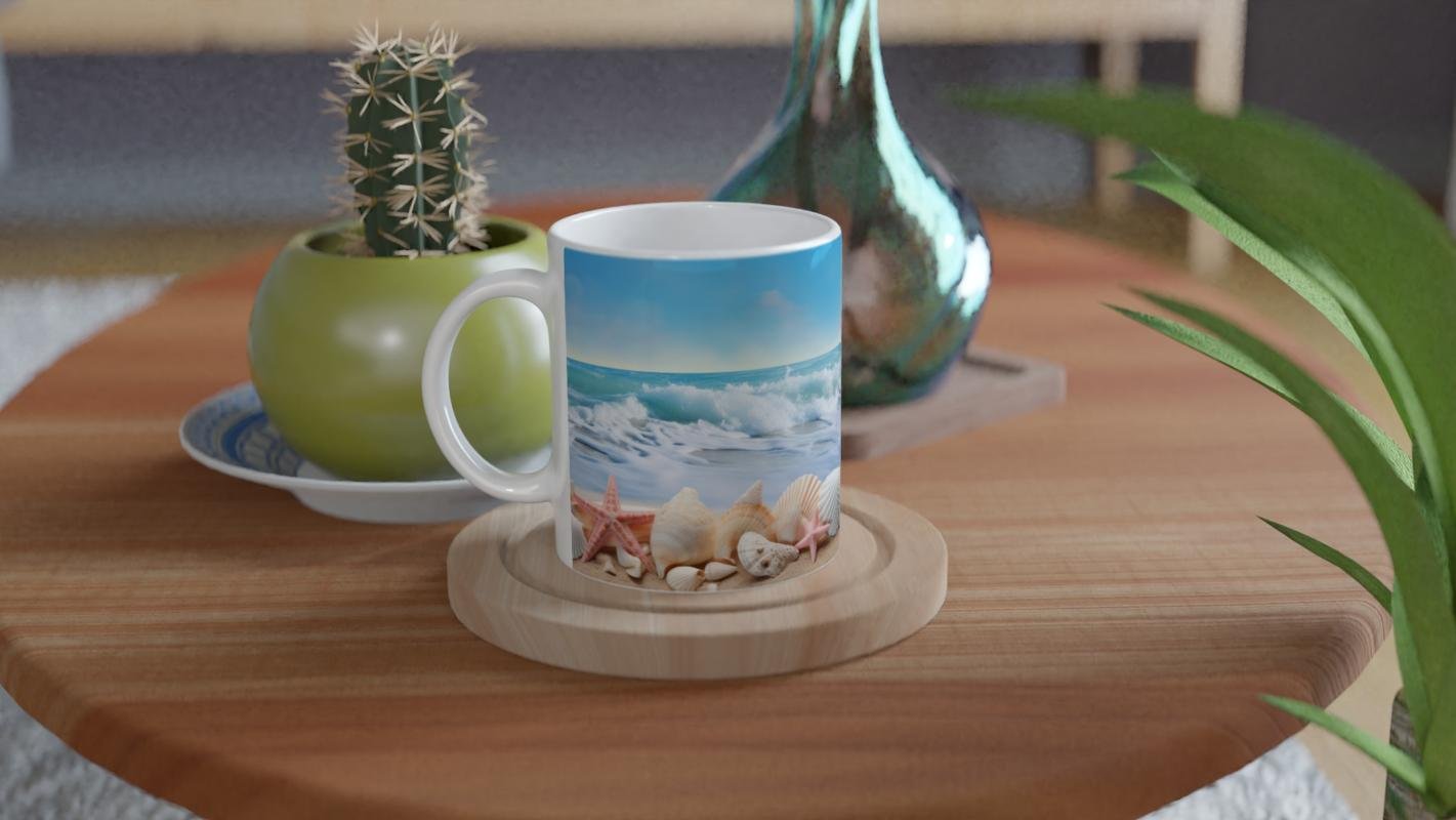 Geniş ufuklu deniz manzarası ve doğal kabuk detaylarıyla tasarlanan bu kupa bardak, yazın huzurunu yudumlamanıza eşlik eder.