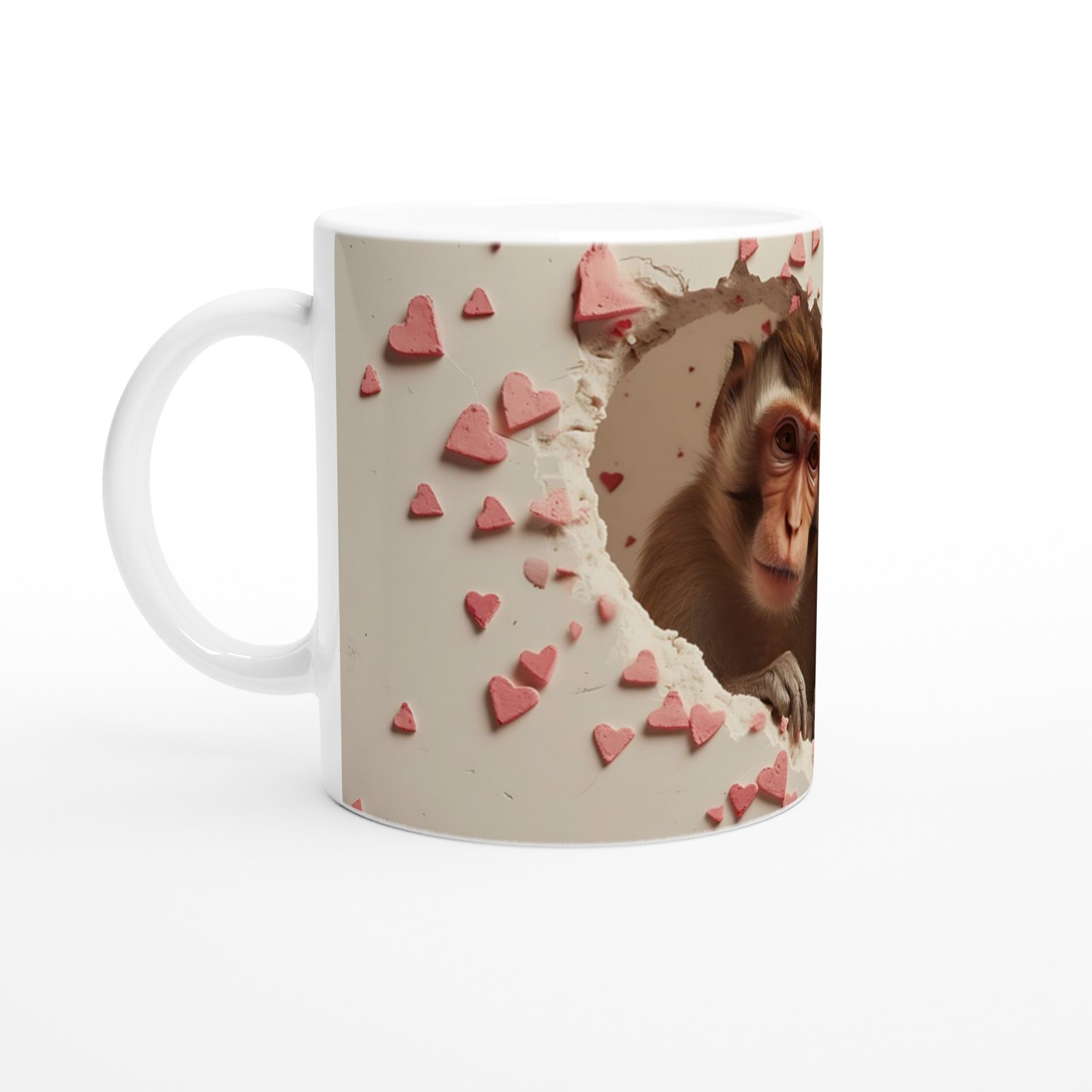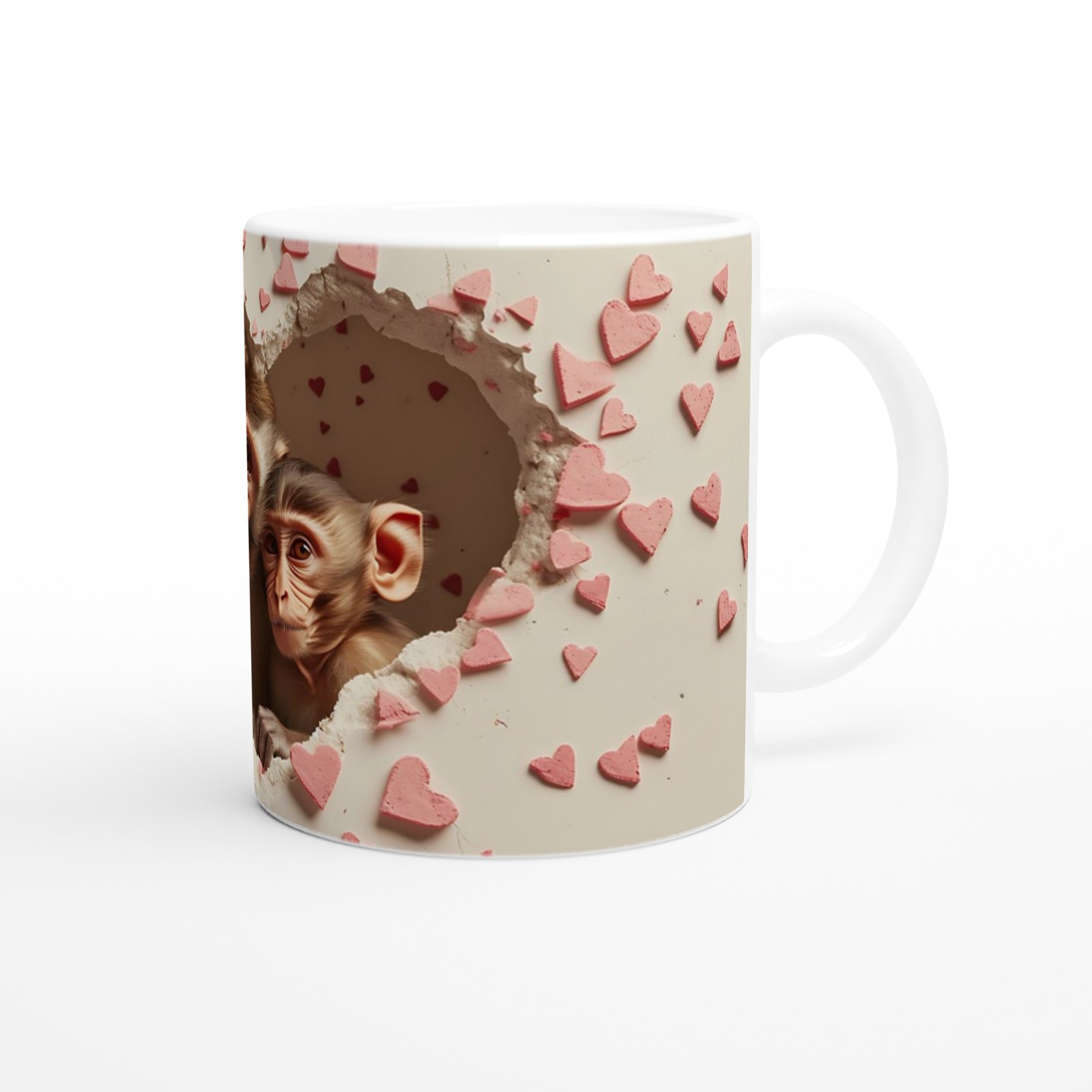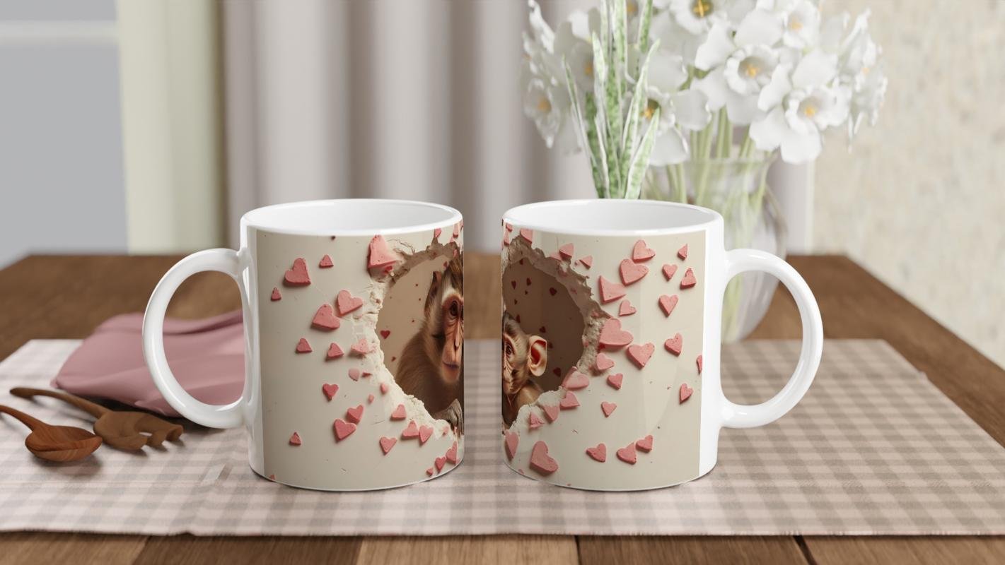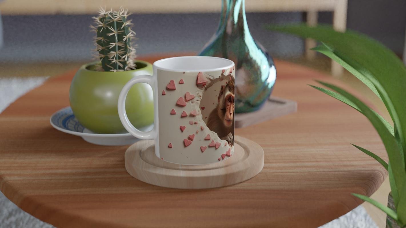 Kalp şeklinde kırılmış bir duvarın ardından bakan anne ve yavru maymun figürleriyle bu kupa bardak, doğal sevginin en içten halini yansıtıyor. Hayvan severler ve duygusal hediye arayanlar için özel bir seçim.