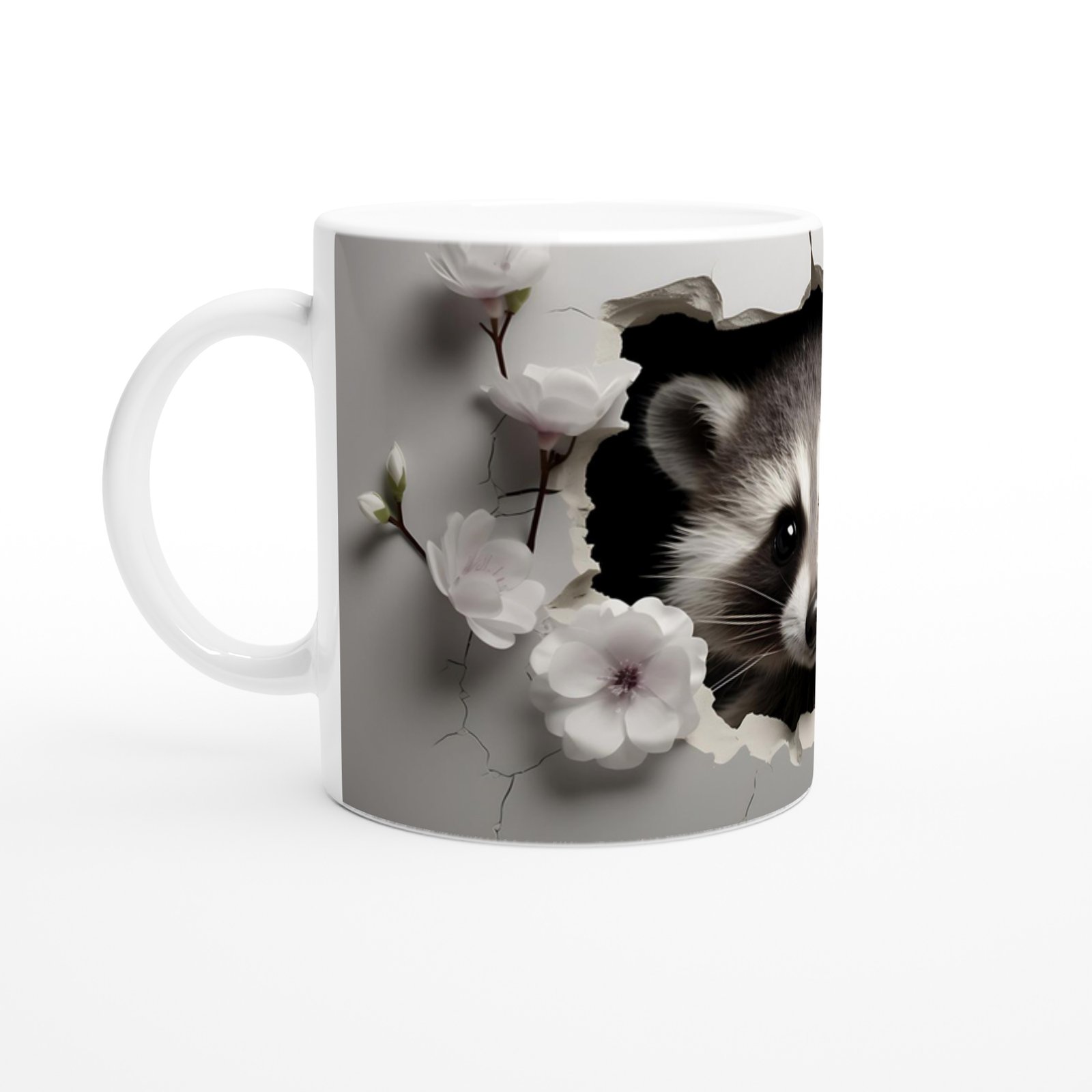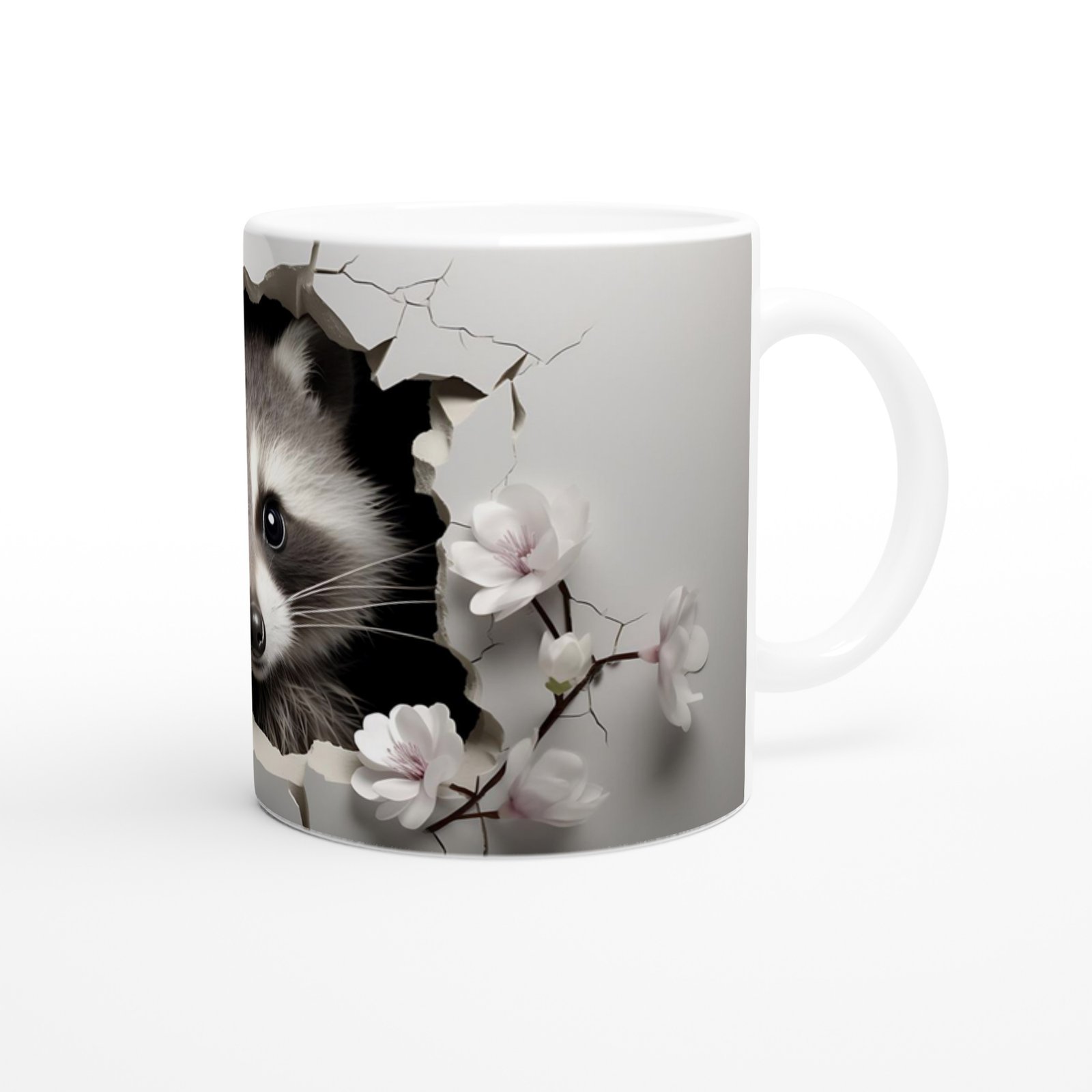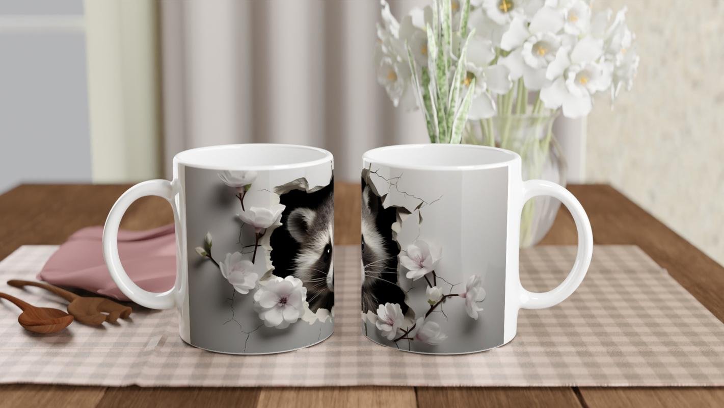 Meraklı Gözlerle Bakan Rakun Temalı Baskılı Kupa Bardak, çatlak duvar efekti içinden fırlayan minik rakun figürüyle tasarlandı. İnce beyaz çiçeklerle çevrili tasarım, sade şıklığı ve doğa dostu enerjiyi bir araya getiriyor.