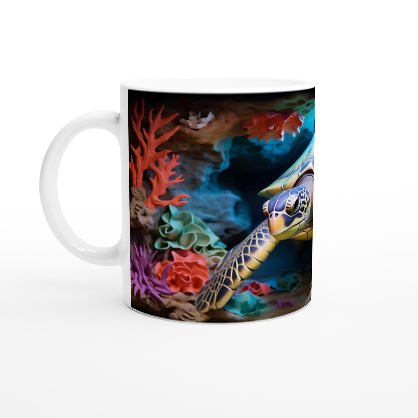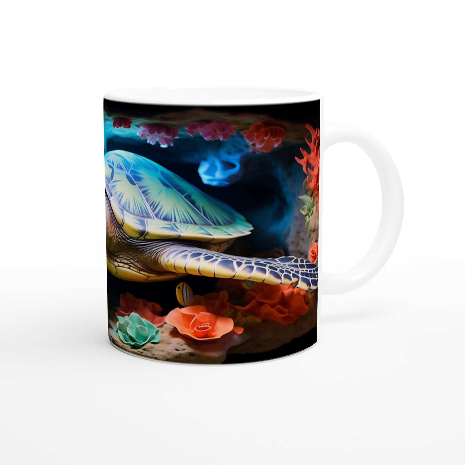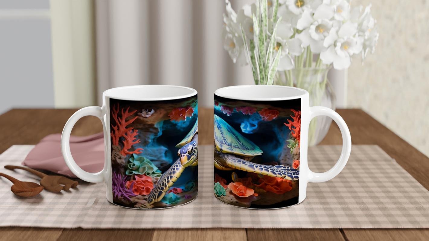 Mercan kayalıkları arasında süzülen zarif kaplumbağanın yer aldığı bu tasarım kupa bardak, doğa severler ve deniz tutkunları için eşsiz bir hediye alternatifi sunar.