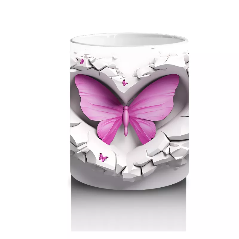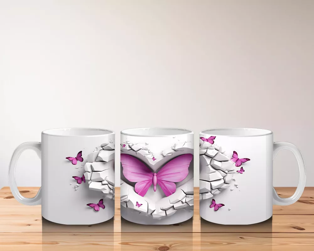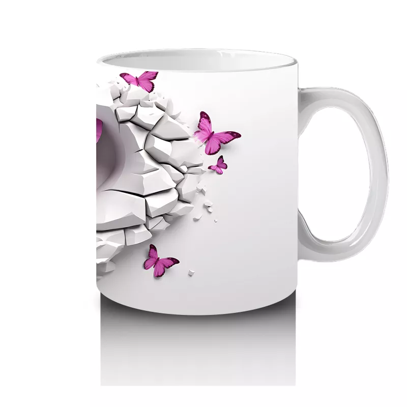 Kalp Şeklinde Duvar Kırığında Pembe Tema Kelebek – Baskılı Kahve Kupası
