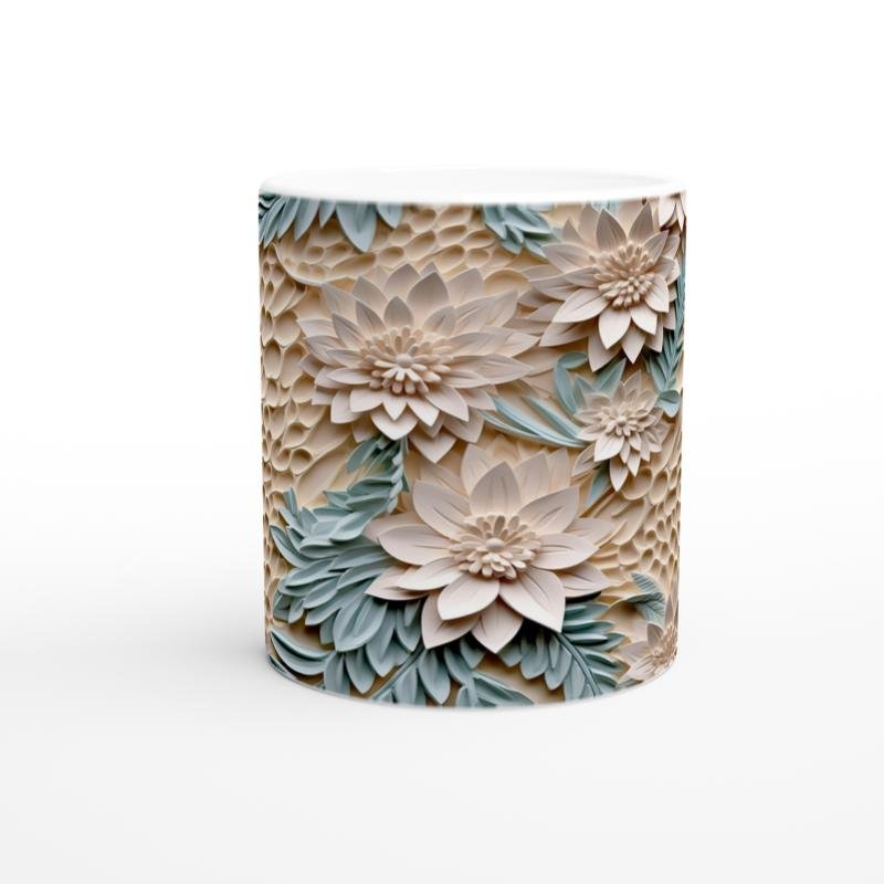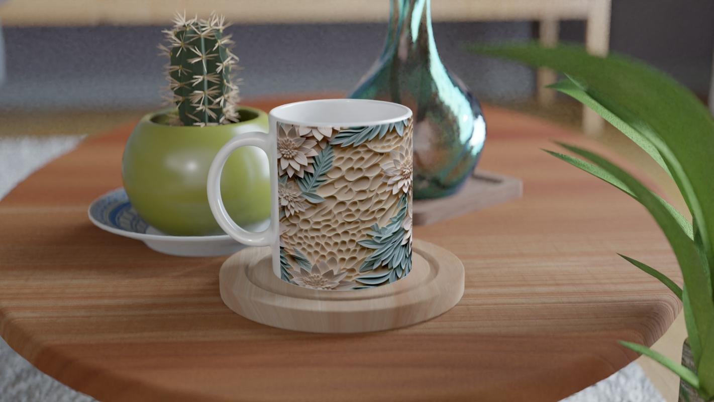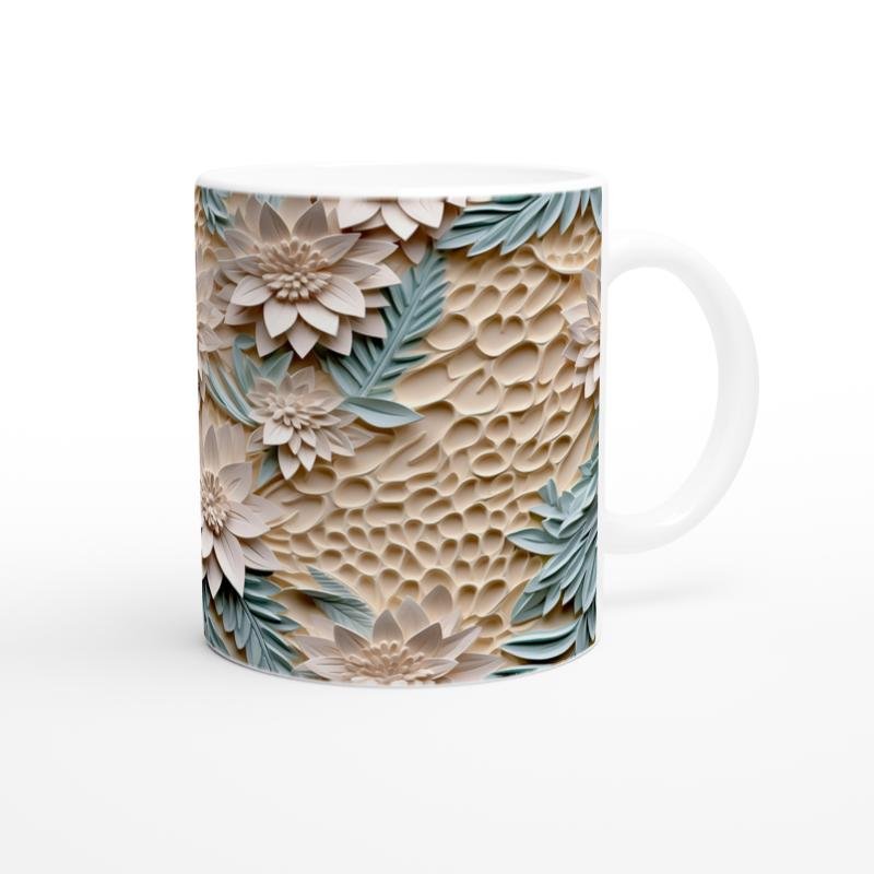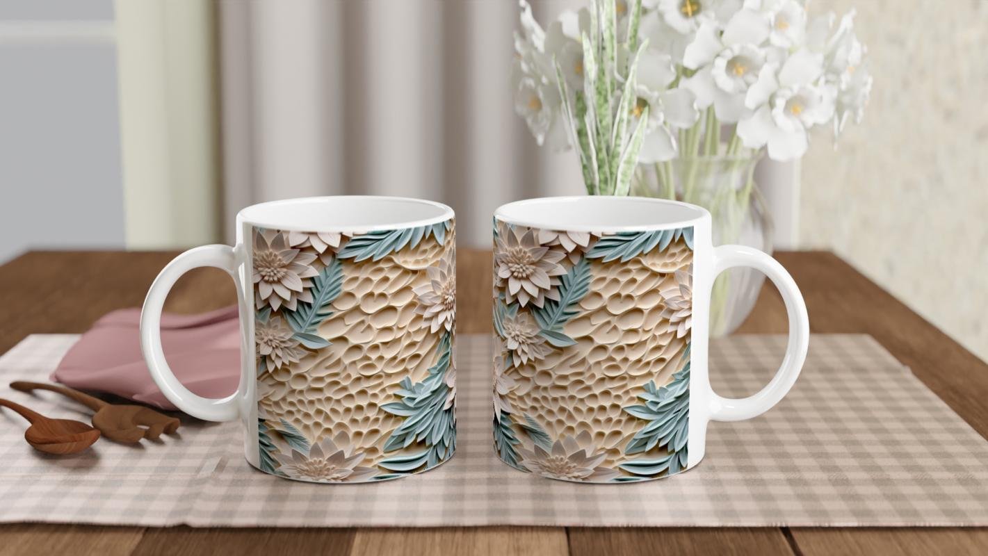 Bej tonlu kabartmalı arka plan üzerinde yükselen nane yeşili yapraklar ve krem çiçeklerle süslenmiş bu çiçek desenli kupa bardak, doğadan ilham alan sofistike bir tasarıma sahip.