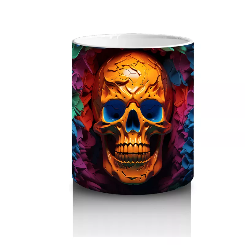 Altın rengindeki kafatası figürü neon ışıklarla aydınlanıyor; bu baskılı kupa modern ve çarpıcı bir Cadılar Bayramı estetiği sunuyor. Parlak detaylı bir hediyelik kahve kupası isteyenler için ideal.