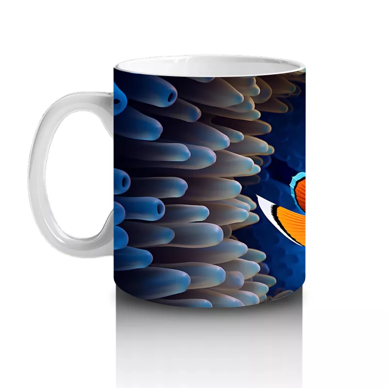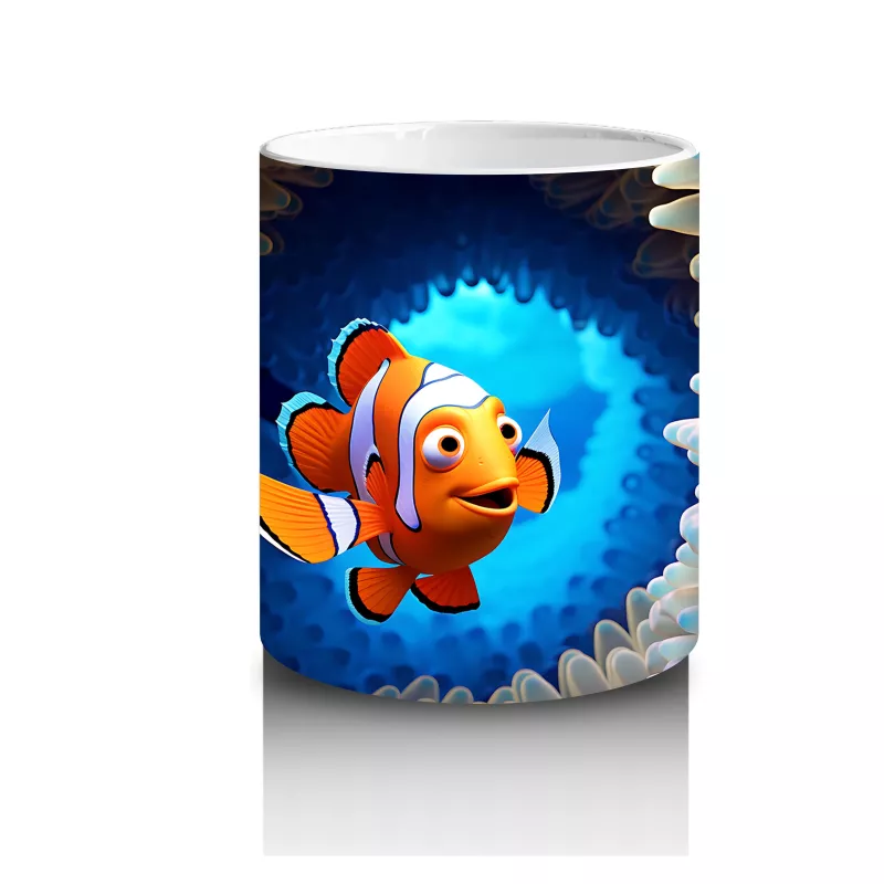 Mavi dalgalar arasında keyifle yüzen bu neşeli balık, denizin huzurunu ve canlılığını yansıtıyor. Eğlenceli ve pozitif bir atmosfer arayanlara özel, iç açıcı bir kupa tasarımı.