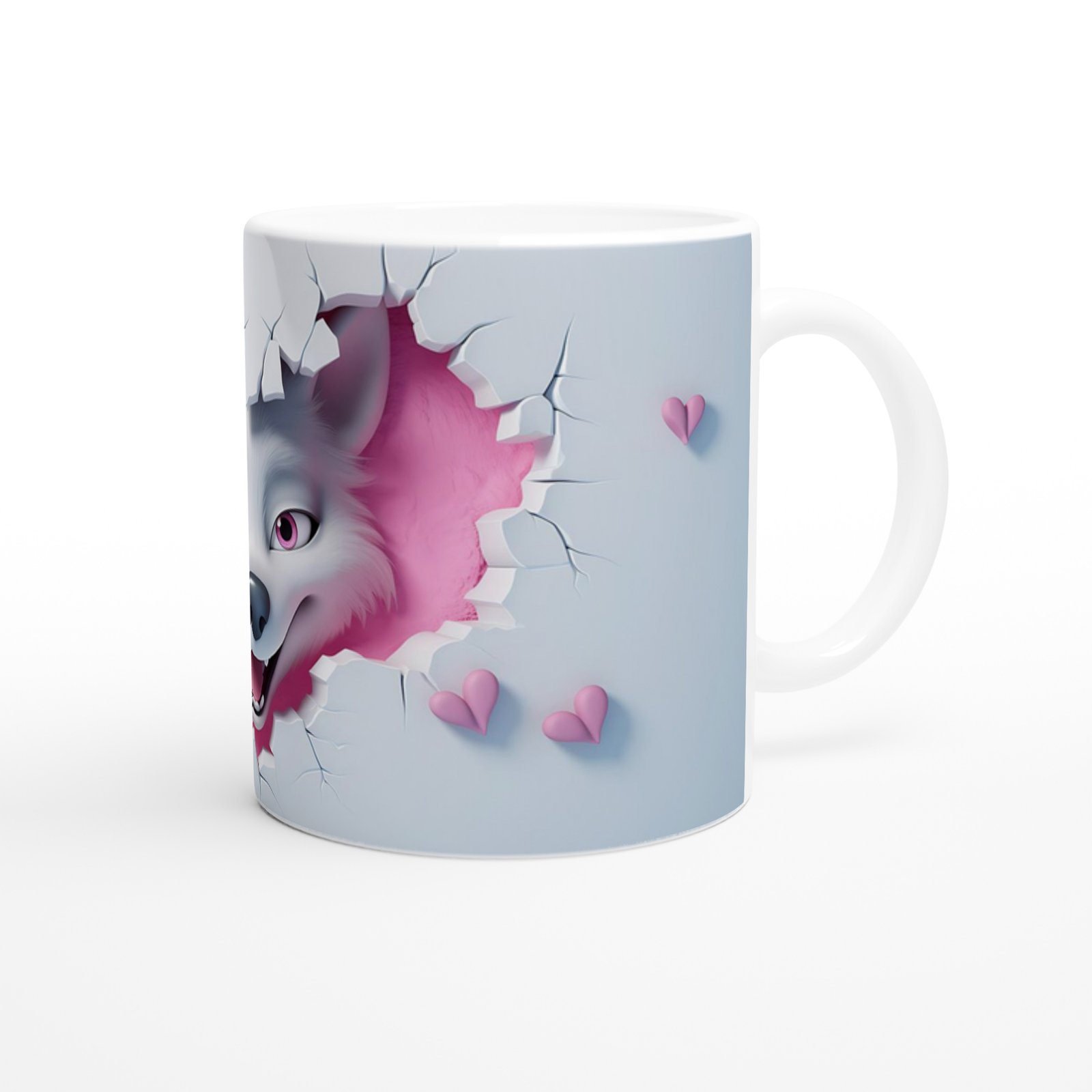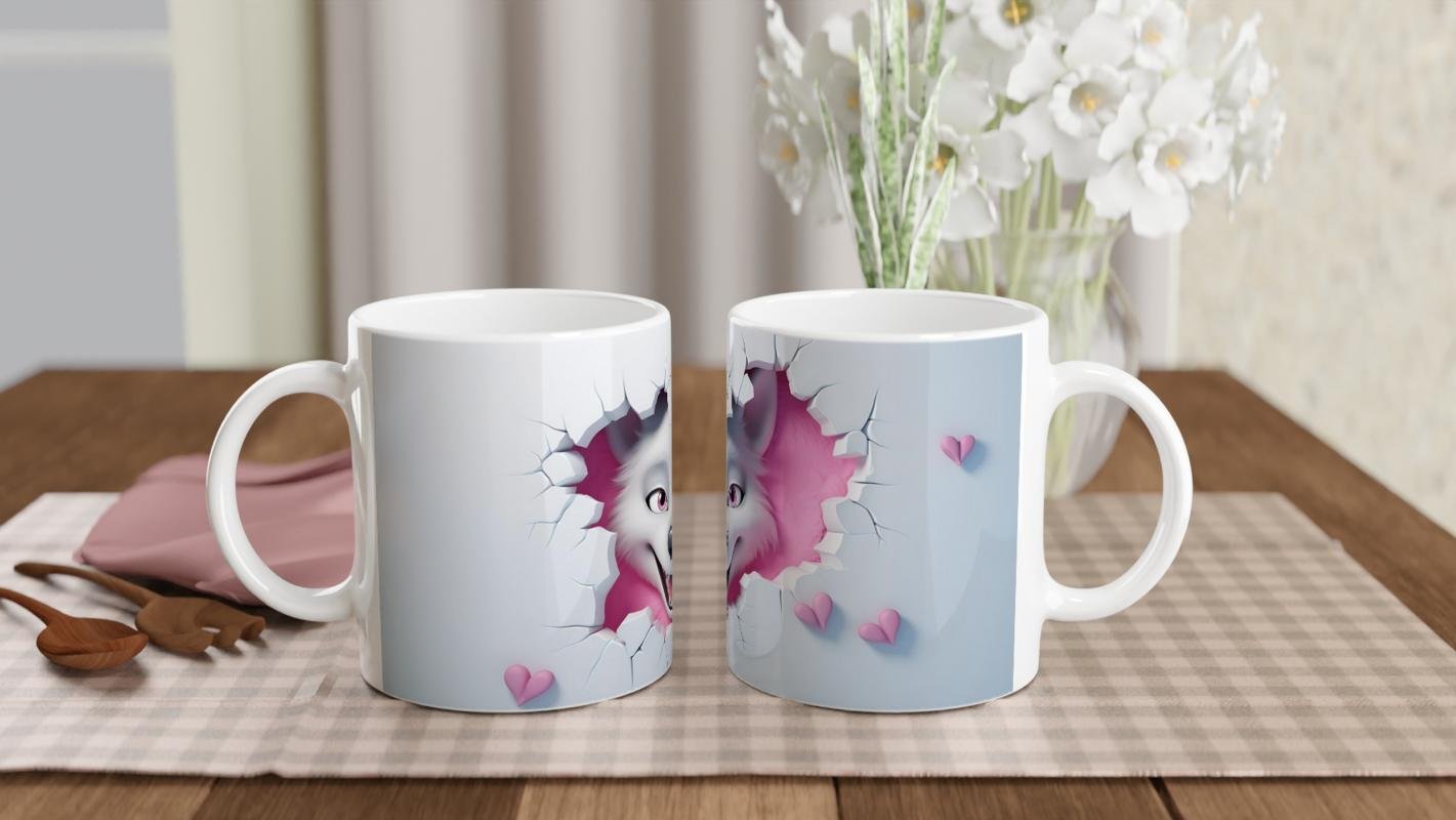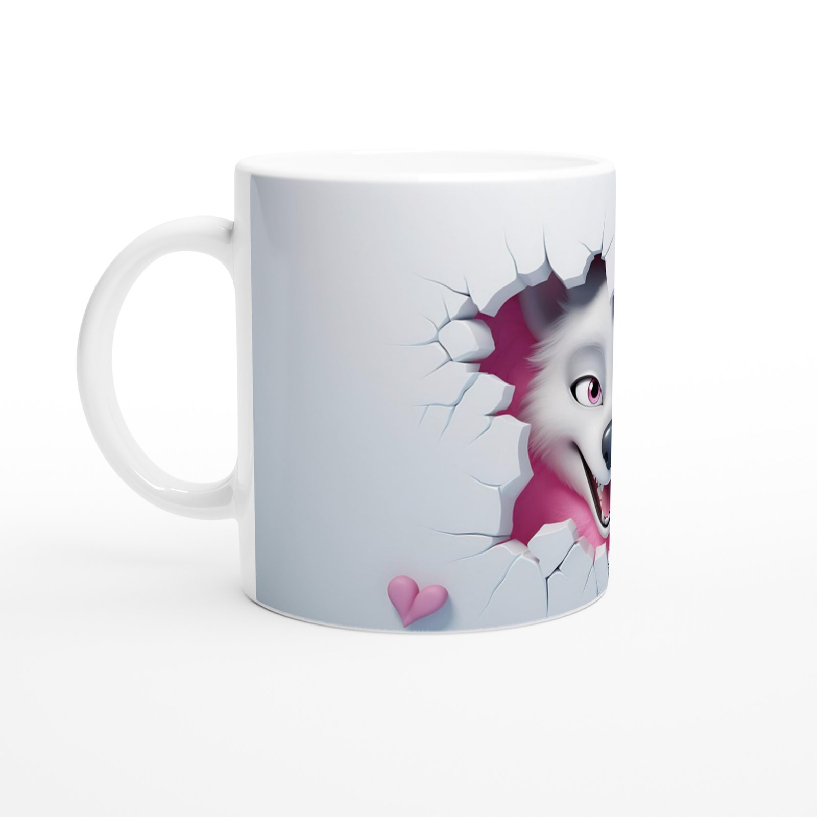 Pembe Arka Planlı Çatlak Duvardan Bakan Neşeli Kurt Temalı Baskılı Kupa Bardak, sevimli gülümsemesiyle dikkat çeken beyaz kurt figürüyle tasarlanmıştır. Çatlamış duvar efekti ve pembe kalp detaylarıyla birleşerek modern ve dikkat çekici bir görünüm sunar.