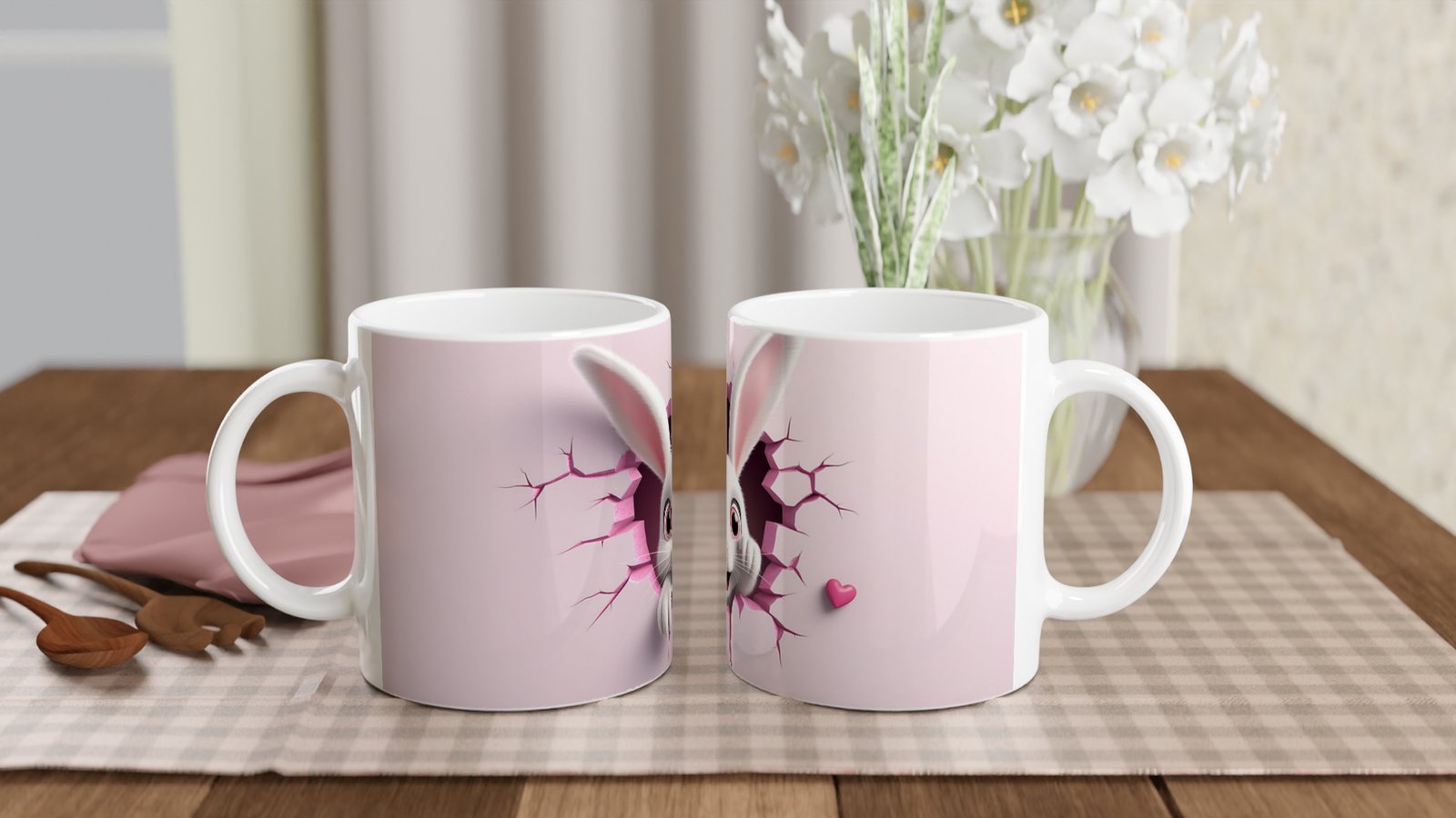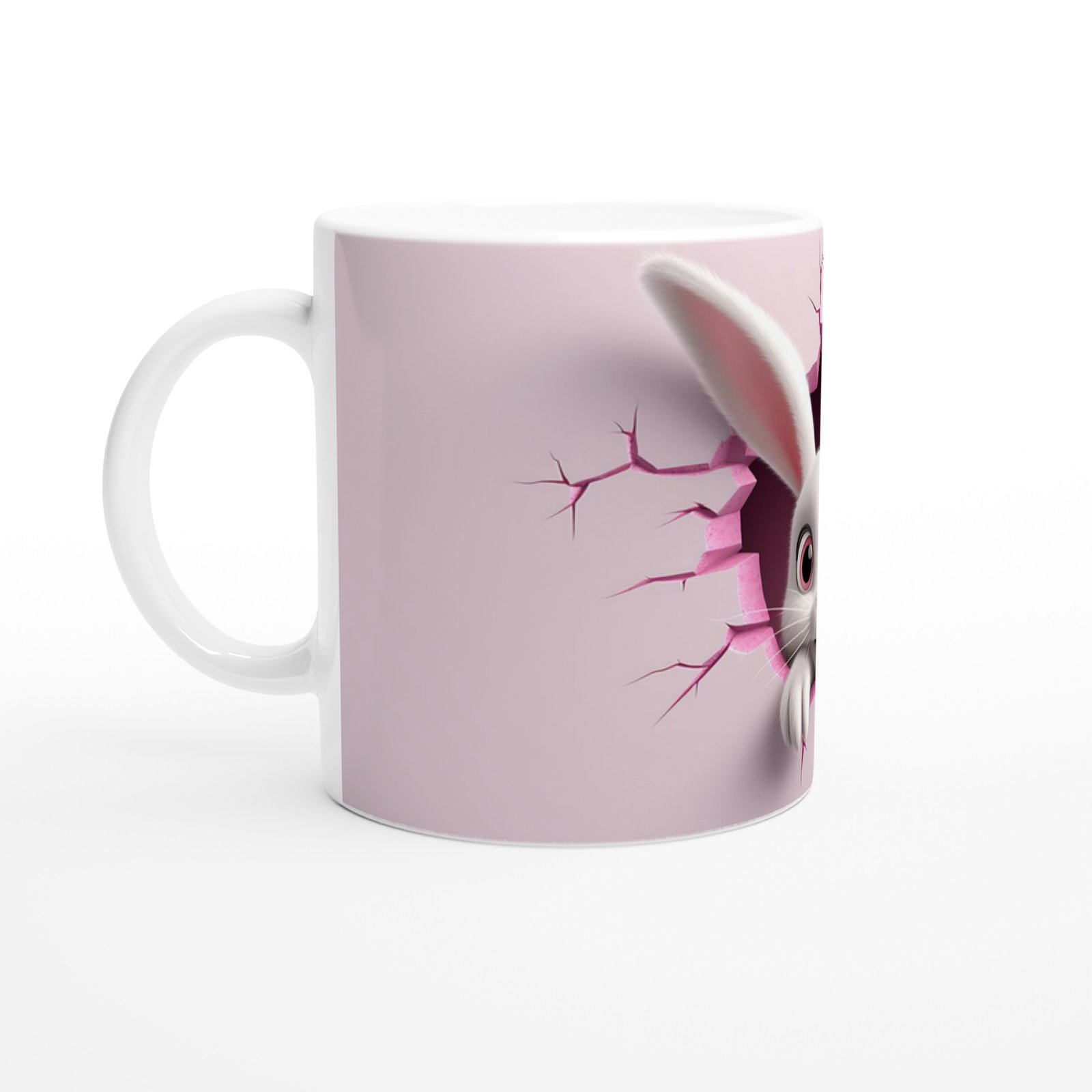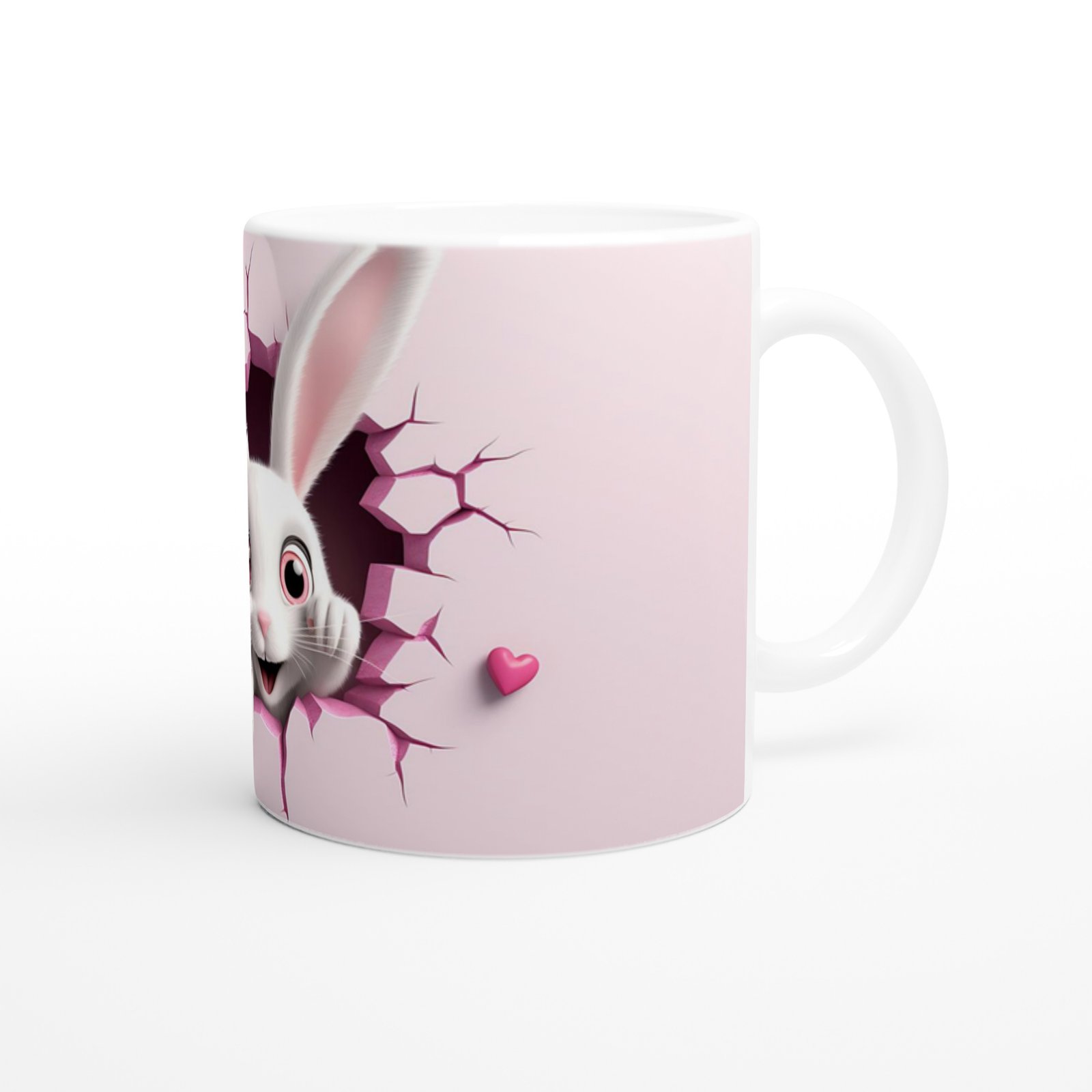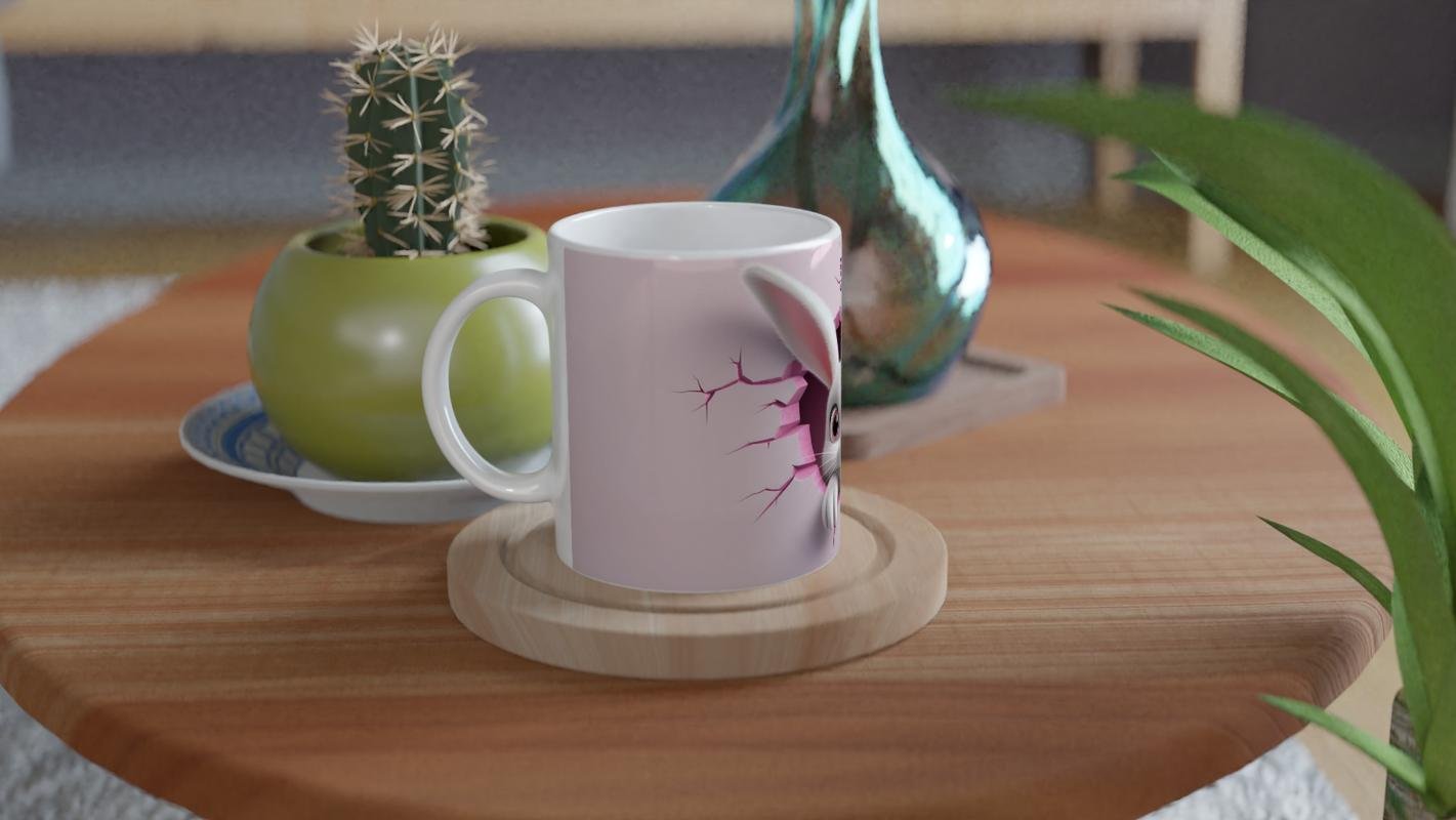 Çatlaktan Bakan Neşeli Tavşan Temalı Baskılı Kupa Bardak, çatlak duvar efekti, pembe kalp dokunuşları ve sade arka planıyla hem minimal hem de sevimli bir görünüm sunuyor. Çocuklara özel ya da eğlenceli bir hediye seçeneği arayanlar için mükemmel.