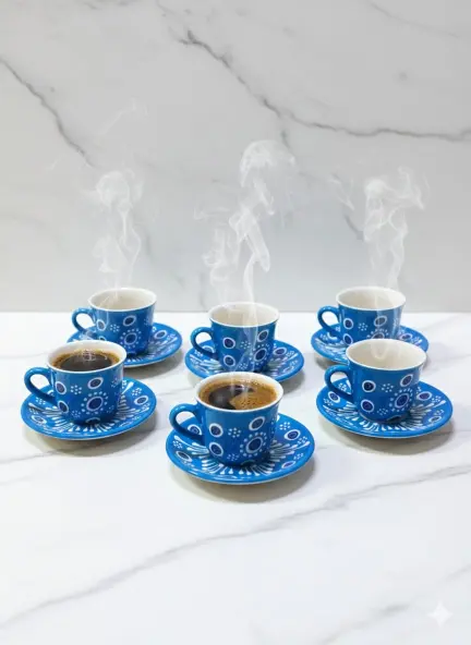 Mavinin en huzurlu tonu, geleneksel koruma sembolleriyle buluşuyor! GTRHDY-ST0019A modelimiz, canlı mavi seramik üzerine titizlikle işlenmiş nazar boncuğu ve akışkan beyaz motiflerle kahve saatlerinize ferahlık katar. 6 kişilik bu özel set, kalabalık sofralarda zarafeti ve el emeğini bir araya getirir.